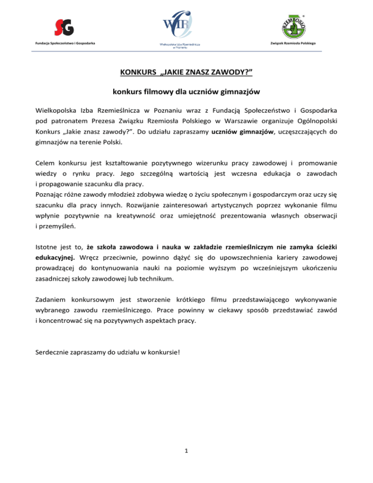 Fundacja Społeczeństwo i Gospodarka Związek Rzemiosła Polskiego KONKURS „JAKIE ZNASZ ZAWODY?” konkurs filmowy dla uczniów gimnazjów Wielkopolska Izba Rzemieślnicza w Poznaniu wraz z Fundacją Społeczeństwo i Gospodarka pod patronatem Prezesa Związku Rzemiosła Polskiego w Warszawie organizuje Ogólnopolski Konkurs „Jakie znasz zawody?”. Do udziału zapraszamy uczniów gimnazjów, uczęszczających do gimnazjów na terenie Polski. Celem konkursu jest kształtowanie pozytywnego wizerunku pracy zawodowej i promowanie wiedzy o rynku pracy. Jego szczególną wartością jest wczesna edukacja o zawodach i propagowanie szacunku dla pracy. Poznając różne zawody młodzież zdobywa wiedzę o życiu społecznym i gospodarczym oraz uczy się szacunku dla pracy innych. Rozwijanie zainteresowań artystycznych poprzez wykonanie filmu wpłynie pozytywnie na kreatywność oraz umiejętność prezentowania własnych obserwacji i przemyśleń. Istotne jest to, że szkoła zawodowa i nauka w zakładzie rzemieślniczym nie zamyka ścieżki edukacyjnej. Wręcz przeciwnie, powinno dążyć się do upowszechnienia kariery zawodowej prowadzącej do kontynuowania nauki na poziomie wyższym po wcześniejszym ukończeniu zasadniczej szkoły zawodowej lub technikum. Zadaniem konkursowym jest stworzenie krótkiego filmu przedstawiającego wykonywanie wybranego zawodu rzemieślniczego. Prace powinny w ciekawy sposób przedstawiać zawód i koncentrować się na pozytywnych aspektach pracy. Serdecznie zapraszamy do udziału w konkursie! 1 Fundacja Społeczeństwo i Gospodarka Związek Rzemiosła Polskiego REGULAMIN KONKURSU „JAKIE ZNASZ ZAWODY?” KONKURS FILMOWY DLA UCZNIÓW GIMNAZJUM I. OGÓLNE ZASADY KONKURSU Organizatorami konkursu są Wielkopolska Izba Rzemieślnicza w Poznaniu wraz z Fundacją Społeczeństwo i Gospodarka w Poznaniu pod patronatem Prezesa Związku Rzemiosła Polskiego w Warszawie. 1. Cele konkursu: 1) Wspieranie założeń dydaktyczno-wychowawczych programu realizowanego w gimnazjum. 2) Pogłębienie wiedzy młodzieży na temat otaczającej ich rzeczywistości społecznej i budowanie w nich szacunku dla pracy innych, w nawiązaniu do podstawy programowej. 3) Kształtowanie pozytywnego wizerunku rzemiosła i wykwalifikowanej pracy zawodowej. 2. Organizacja i organizatorzy Konkursu Konkurs przebiega w dwóch etapach: - regionalnym - ogólnokrajowym. Organizatorem Regionalnym Konkursu na etapie regionalnym są Izby Rzemieślnicze na terenie Polski. Organizatorem Krajowym Konkursu etapu ogólnokrajowego jest Wielkopolska Izba Rzemieślnicza w Poznaniu i Fundacja Społeczeństwo i Gospodarka w Poznania. 3. Terminy i miejsce Konkursu Termin nadsyłania prac etapie regionalnym upływa 31.03.2016 r. Na prace do etapu ogólnokrajowego czekamy do dnia 15.04.2016 r. Liczy się data stempla pocztowego. 2 Fundacja Społeczeństwo i Gospodarka II. Związek Rzemiosła Polskiego ZASADY ORGANIZACYJNE KONKURSU ETAP REGIONALNY 1. ORGANIZACJA Organizatorem Konkursu na etapie regionalnym jest Izba Rzemieślnicza, działająca w regionie. Powoła na terenie swojego działania koordynatora regionalnego. Dany koordynator będzie odpowiedzialny za przeprowadzenie Konkursu w konkretnej Izbie oraz przekazanie informacji i prac do Koordynatora Krajowego. Lista koordynatorów regionalnych będzie dostępna w siedzibie Organizatora Krajowego. W przypadku, gdy Izba Rzemieślnicza nie zorganizuje etapu regionalnego konkursu, uczestnik może przesłać pracę do Organizatora Krajowego tj. do Wielkopolskiej Izby Rzemieślniczej w Poznaniu, gdzie praca zostanie poddana ocenie. Izba Rzemieślnicza, jako regionalny organizator może pozyskać do Konkursu partnerów merytorycznych w osobie np. marszałka, wojewody, przedstawicieli organizacji samorządowych. Konkurs przeprowadza, a następnie dokonuje oceny i ogłasza jego wynik Komisja Konkursowa w skład, której wchodzą: 1. przedstawiciele Izby Rzemieślniczej, 2. regionalny Koordynator Konkursu, 3. eksperci merytoryczni (artyści, wychowawcy dzieci z doświadczeniem pedagogicznym), 4. przedstawiciele partnerów Konkursu. Decyzje Jury są ostateczne. Prace konkursowe zostaną ocenione na podstawie następujących kryteriów: merytorycznie - zgodność wykonanej pracy z podaną tematyką, inwencji, oryginalności i pomysłowości przedstawianego tematu, wizualnie - wrażenie estetyczne. 2. UCZESTNICY Uczestnikami regionalnego etapu Konkursu jest młodzież uczęszczająca do wszystkich gimnazjów na terenie działania Izby Rzemieślniczej, która jest organizatorem Konkursu na tym etapie. 3. WYMAGANIA DOTYCZĄCE PRAC KONKURSOWYCH a) film należy wykonać techniką cyfrową za pomocą dowolnego urządzenia (np. telefonu komórkowego, aparatu fotograficznego, kamery cyfrowej). Film powinien trwać maksymalnie 60 sekund, b) prace należy przesyłać w formacie mp4 na płycie CD-Rom, DVD lub pendrive. 3 Fundacja Społeczeństwo i Gospodarka Związek Rzemiosła Polskiego c) nośnik należy podpisać imieniem i nazwiskiem autora pracy oraz adresem gimnazjum, w którym się uczy, d) do pracy należy dołączyć: opis zgodnie z załączonym formularzem zgłoszeniowym (zał. nr 1), zgodę na przetwarzanie danych osobowych i zgodę na nieodpłatną publikację pracy (zał. nr 2), zgodę na publikacje wizerunku (zał. nr 3) od każdej osoby uwiecznionej na filmie. e) za prawidłowe opisanie pracy odpowiedzialny jest nauczyciel lub opiekun ucznia, f) praca konkursowa powinna przedstawiać wykonywanie wybranego zawodu rzemieślniczego (lista zawodów rzemieślniczych – zał. nr 4), g) prace niezwiązane z tematem konkursu będą odrzucone. Brak któregoś z w/w załączników powoduje wykluczenie pracy z konkursu. h) Izba Rzemieślnicza zobowiązana jest zamieścić na swojej stronie internetowej informacje o konkursie wraz z dokumentami do poprania, a także imię i nazwisko Koordynatora Regionalnego z nr tel. do kontaktu. 4. TERMIN I WARUNKI ZGŁOSZENIA. 1) Prace nal