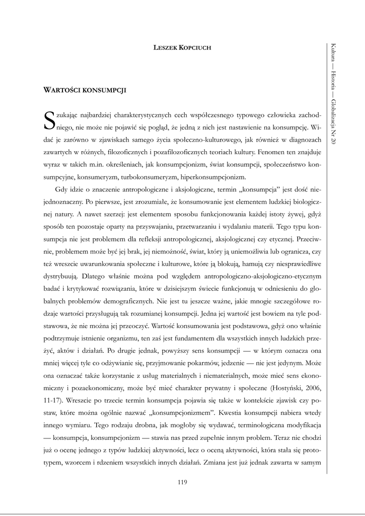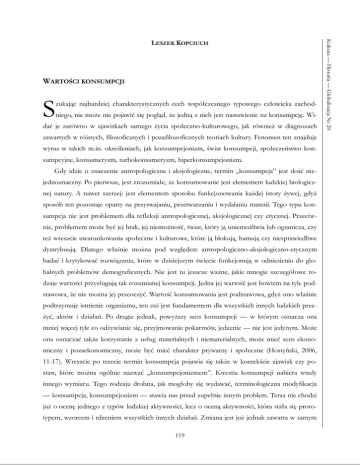 WARTOŚCI KONSUMPCJI S zukając najbardziej charakterystycznych cech współczesnego typowego człowieka zachodniego, nie może nie pojawić się pogląd, że jedną z nich jest nastawienie na konsumpcję. Wi- dać je zarówno w zjawiskach samego życia społeczno-kulturowego, jak również w diagnozach zawartych w różnych, filozoficznych i pozafilozoficznych teoriach kultury. Fenomen ten znajduje wyraz w takich m.in. określeniach, jak konsumpcjonizm, świat konsumpcji, społeczeństwo konsumpcyjne, konsumeryzm, turbokonsumeryzm, hiperkonsumpcjonizm. Gdy idzie o znaczenie antropologiczne i aksjologiczne, termin „konsumpcja” jest dość niejednoznaczny. Po pierwsze, jest zrozumiałe, że konsumowanie jest elementem ludzkiej biologicznej natury. A nawet szerzej: jest elementem sposobu funkcjonowania każdej istoty żywej, gdyż sposób ten pozostaje oparty na przyswajaniu, przetwarzaniu i wydalaniu materii. Tego typu konsumpcja nie jest problemem dla refleksji antropologicznej, aksjologicznej czy etycznej. Przeciwnie, problemem może być jej brak, jej niemożność, świat, który ją uniemożliwia lub ogranicza, czy też wreszcie uwarunkowania społeczne i kulturowe, które ją blokują, hamują czy niesprawiedliwe dystrybuują. Dlatego właśnie można pod względem antropologiczno-aksjologiczno-etycznym badać i krytykować rozwiązania, które w dzisiejszym świecie funkcjonują w odniesieniu do globalnych problemów demograficznych. Nie jest tu jeszcze ważne, jakie mnogie szczegółowe rodzaje wartości przysługują tak rozumianej konsumpcji. Jedna jej wartość jest bowiem na tyle podstawowa, że nie można jej przeoczyć. Wartość konsumowania jest podstawowa, gdyż ono właśnie podtrzymuje istnienie organizmu, ten zaś jest fundamentem dla wszystkich innych ludzkich przeżyć, aktów i działań. Po drugie jednak, powyższy sens konsumpcji — w którym oznacza ona mniej więcej tyle co odżywianie się, przyjmowanie pokarmów, jedzenie — nie jest jedynym. Może ona oznaczać także korzystanie z usług materialnych i niematerialnych, może mieć sens ekonomiczny i pozaekonomiczny, może być mieć charakter prywatny i społeczne (Hostyński, 2006, 11-17). Wreszcie po trzecie termin konsumpcja pojawia się także w kontekście zjawisk czy postaw, które można ogólnie nazwać „konsumpcjonizmem”. Kwestia konsumpcji nabiera wtedy innego wymiaru. Tego rodzaju drobna, jak mogłoby się wydawać, terminologiczna modyfikacja — konsumpcja, konsumpcjonizm — stawia nas przed zupełnie innym problem. Teraz nie chodzi już o ocenę jednego z typów ludzkiej aktywności, lecz o oceną aktywności, która stała się prototypem, wzorcem i rdzeniem wszystkich innych działań. Zmiana jest już jednak zawarta w samym 119 Kultura — Historia — Globalizacja Nr 20 LESZEK KOPCIUCH Leszek Kopciuch, Wartości konsumpcji terminie; -izmy często, nawet jeśli nie zawsze, oznaczają stanowiska monistyczne, w których jeden określony fragment rzeczywistości staje się wyjaśnieniem dla wszystkich innych. Te inne są bowiem pozbawione jakiejś zasadniczo odmiennej odrębności i redukują się do niego. Konsumpcjonizm — powiedzmy to już na wstępie — to postawa, w której konsumpcja, która nabrała charakteru autotelicznego, stając się celem samym w sobie, przekształcając się z narzędzia w to, do czego narzędzie miało służyć. Ale nawet oceny samej konsumpcji (nie wchodząc w problem wadliwości postawy konsumpcjonistycznej) tkwią w specyficznym rozdwojeniu. Wprawdzie na gruncie stanowisk teoretycznych waloryzuje się zwykle wartość konsumpcji jako jedną z wartości podstawowych, ale zarazem nie przypisuje się jej charakteru zbyt wysokiego, przeciwstawiając jej inne, bardziej cenne typy aktywności (twórczość duchowa, aktywność kulturowa, działanie moralne). Natomiast na gruncie zwykłej, codziennej wrażliwości aksjologicznej wartość konsumpcji jest stawiana bardzo wysoko, ale widać to nie w deklaracjach, lecz przede wszystkim w konkretnych zachowaniach i wyborach. Można to wyraźnie zauważyć na przykładzie konsumpcyjnych zachowań Polaków w dni poprzedzające tzw. długie weekendy. Jest to istotny przykład, gdyż te wolne dni — gdy do interpretacji ich sensu zastosować słuszną, jak sądzę, Marksowską teorię alienacji istoty gatunkowej człowieka (Marks, 1979, 92-112) — są okresem, w którym każdy może robić to, czego autentycznie chce; w tym, co wówczas czynimy, pokazujemy zatem to, kim jesteśmy. Powołując się na dane zwyczajnej, codziennej ludzkiej wrażliwości aksjologicznej, nie chcę jej przypisywać rozstrzygającej roli przy określaniu typów wartości, rządzącej w ich sferze hierarchii i ich wzajemnych relacji. Niemniej, nawet jeśli wrażliwość ta może zawierać błędne oglądy czy podlegać różnorakim aberracjom, złudzeniom lub np. egocentrycznym iluzjom, jej świadectwa są najbardziej intymną drogą kontaktu człowieka z wartościami — a jako takie nie mogą być pomijane w refleksji aksjologicznej, zwłaszcza gdy ta ma dotyczyć tak fundamentalnej wartości jak wartość konsumpcji. W dalszych rozważaniach skupiam się na wartościach związanych nie z konsumpcjonizmem, lecz zwykłą konsumpcją. To przedsięwzięcie idące trochę na przekór konstatacji Zygmunta Baumana, według której jest trywialnym stwierdzeniem, że wszyscy członkowie społeczeństwa do niepamiętnych czasów konsumują (Bauman, 2000, 95). Fakt powszechności tej czynności nie powoduje bowiem wcale, że jej wyjaśnienie nie jest aksjologicznie interesujące i potrzebne. Przy czym ta potrzeba nie ma w istocie charakteru stricte praktycznego, nie chodzi tu bowiem o poprawianie, modyfikowanie świata czy apelowanie o jego modyfikację. Przede wszystkim chodzi tylko samo opisanie świata, które — być może, ale w dalszej kolejności — może stać się podstawą dla propozycji praktycznych. 120 pytań: 1) jakie rodzaje