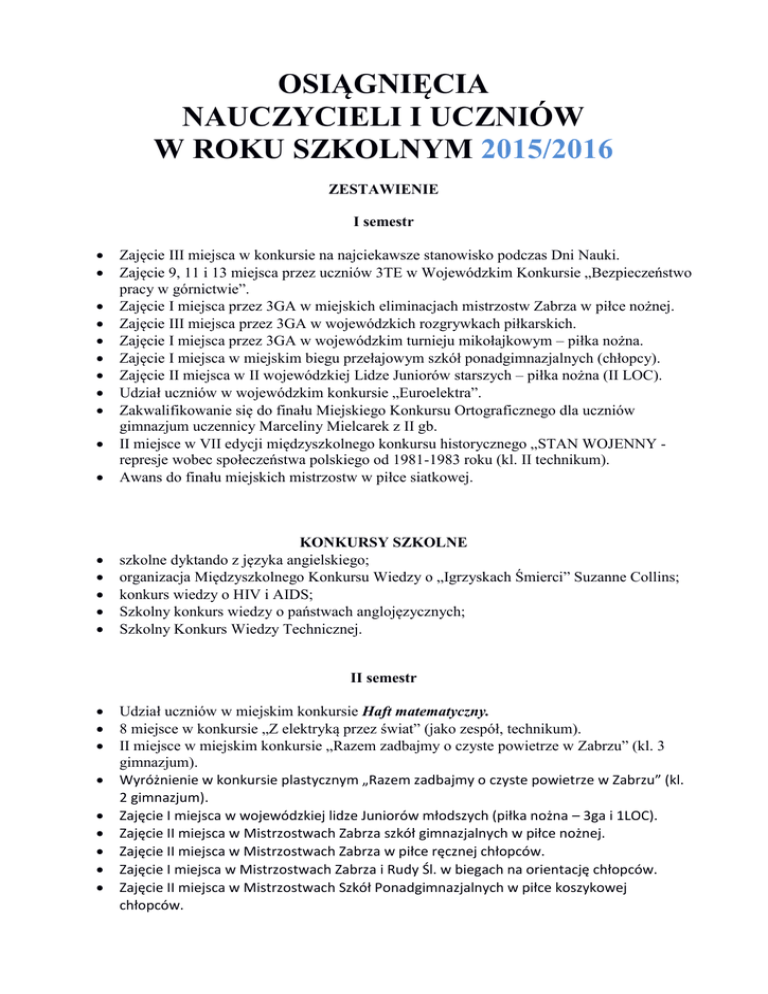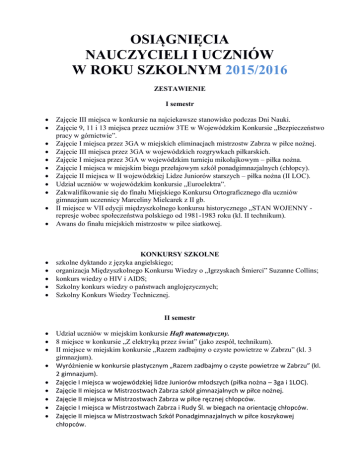 OSIĄGNIĘCIA NAUCZYCIELI I UCZNIÓW W ROKU SZKOLNYM 2015/2016 ZESTAWIENIE I semestr Zajęcie III miejsca w konkursie na najciekawsze stanowisko podczas Dni Nauki. Zajęcie 9, 11 i 13 miejsca przez uczniów 3TE w Wojewódzkim Konkursie „Bezpieczeństwo pracy w górnictwie”. Zajęcie I miejsca przez 3GA w miejskich eliminacjach mistrzostw Zabrza w piłce nożnej. Zajęcie III miejsca przez 3GA w wojewódzkich rozgrywkach piłkarskich. Zajęcie I miejsca przez 3GA w wojewódzkim turnieju mikołajkowym – piłka nożna. Zajęcie I miejsca w miejskim biegu przełajowym szkół ponadgimnazjalnych (chłopcy). Zajęcie II miejsca w II wojewódzkiej Lidze Juniorów starszych – piłka nożna (II LOC). Udział uczniów w wojewódzkim konkursie „Euroelektra”. Zakwalifikowanie się do finału Miejskiego Konkursu Ortograficznego dla uczniów gimnazjum uczennicy Marceliny Mielcarek z II gb. II miejsce w VII edycji międzyszkolnego konkursu historycznego „STAN WOJENNY represje wobec społeczeństwa polskiego od 1981-1983 roku (kl. II technikum). Awans do finału miejskich mistrzostw w piłce siatkowej. KONKURSY SZKOLNE szkolne dyktando z języka angielskiego; organizacja Międzyszkolnego Konkursu Wiedzy o „Igrzyskach Śmierci” Suzanne Collins; konkurs wiedzy o HIV i AIDS; Szkolny konkurs wiedzy o państwach anglojęzycznych; Szkolny Konkurs Wiedzy Technicznej. II semestr Udział uczniów w miejskim konkursie Haft matematyczny. 8 miejsce w konkursie „Z elektryką przez świat” (jako zespół, technikum). II miejsce w miejskim konkursie „Razem zadbajmy o czyste powietrze w Zabrzu” (kl. 3 gimnazjum). Wyróżnienie w konkursie plastycznym „Razem zadbajmy o czyste powietrze w Zabrzu” (kl. 2 gimnazjum). Zajęcie I miejsca w wojewódzkiej lidze Juniorów młodszych (piłka nożna – 3ga i 1LOC). Zajęcie II miejsca w Mistrzostwach Zabrza szkół gimnazjalnych w piłce nożnej. Zajęcie II miejsca w Mistrzostwach Zabrza w piłce ręcznej chłopców. Zajęcie I miejsca w Mistrzostwach Zabrza i Rudy Śl. w biegach na orientację chłopców. Zajęcie II miejsca w Mistrzostwach Szkół Ponadgimnazjalnych w piłce koszykowej chłopców. Zajęcie I miejsca w Mistrzostwach Zabrza Szkół Gimnazjalnych w Tenisie Stołowym. Zajęcie I miejsca w Mistrzostwach Zabrza w pływaniu st. grzbietowym szkół gimnazjalnych dziewcząt. Zajęcie II miejsca w Mistrzostwach Zabrza w pływaniu stylem grzbietowym chłopców szkół gimnazjalnych. Zajęcie II miejsca na Śląsku, jako Gimnazjum nr 15 w konkursie na zbiórkę baterii „Konkurujemy jak pracowite mrówki”. Zakwalifikowanie się do etapu wojewódzkiego konkursu Wiedzy Elektrycznej i Elektronicznej „Euroelektra”. Zajęcie II miejsca w Międzyszkolnym konkursie „Gotuj z klasą”. KONKURSY SZKOLNE Szkolny Konkurs Wiedzy o „Gwiezdnych Wojnach”; Szkolny Konkurs Wiedzy o „Władcy Pierścieni”; Zorganizowanie konkursu matematycznego „Kangur” dla uczniów szkoły; Zorganizowanie konkursu z okazji Międzynarodowego Dnia Liczby PI dla uczniów szkoły; Szkolny Konkurs Wiedzy o UE dla gimnazjum; szkolne rozgrywki sportowe; finał Międzyszkolnego Konkursu o „Igrzyskach Śmierci”; szkolny etap konkursu „Pokaż nam Język”- organizowanego przez Wyższą Szkołę Bankową w Poznaniu; szkolnego Talent's Show; konkurs szkolny „Obiekty ze Światowej Lisy Dziedzictwa UNESCO”; Szkolny konkurs fotograficzny „Zima – Zabrze 2016”; Organizacja i przeprowadzenie WOJEWÓDZKIEGO KONKURSU INFORMATYCZNEGO "BEZPIECZNY UCZEŃ"; Szkolny Konkurs wiedzy o Śródziemiu J.R.R.Tolkiena.