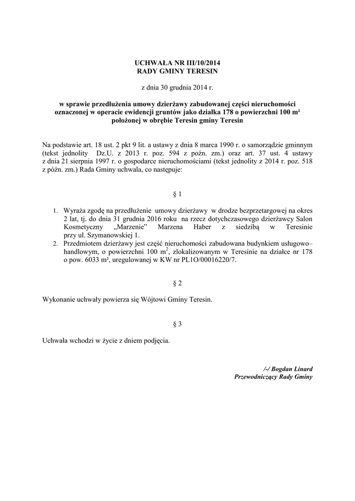 UCHWAŁA NR III/10/2014 RADY GMINY TERESIN z dnia 30 grudnia 2014 r. w sprawie przedłużenia umowy dzierżawy zabudowanej części nieruchomości oznaczonej w operacie ewidencji gruntów jako działka 178 o powierzchni 100 m² położonej w obrębie Teresin gminy Teresin Na podstawie art. 18 ust. 2 pkt 9 lit. a ustawy z dnia 8 marca 1990 r. o samorządzie gminnym (tekst jednolity Dz.U. z 2013 r. poz. 594 z poźn. zm.) oraz art. 37 ust. 4 ustawy z dnia 21 sierpnia 1997 r. o gospodarce nieruchomościami (tekst jednolity z 2014 r. poz. 518 z późn. zm.) Rada Gminy uchwala, co następuje: §1 1. Wyraża zgodę na przedłużenie umowy dzierżawy w drodze bezprzetargowej na okres 2 lat, tj. do dnia 31 grudnia 2016 roku na rzecz dotychczasowego dzierżawcy Salon Kosmetyczny „Marzenie” Marzena Haber z siedzibą w Teresinie przy ul. Szymanowskiej 1. 2. Przedmiotem dzierżawy jest część nieruchomości zabudowana budynkiem usługowo– handlowym, o powierzchni 100 m2, zlokalizowanym w Teresinie na działce nr 178 o pow. 6033 m², uregulowanej w KW nr PL1O/00016220/7. §2 Wykonanie uchwały powierza się Wójtowi Gminy Teresin. §3 Uchwała wchodzi w życie z dniem podjęcia. /-/ Bogdan Linard Przewodniczący Rady Gminy