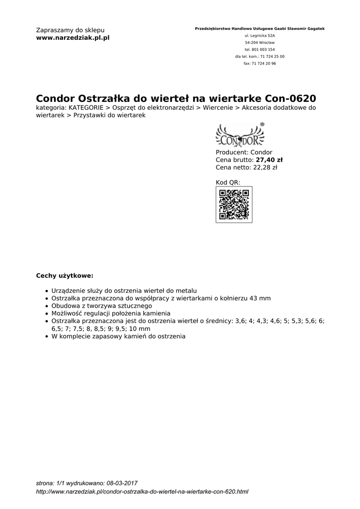 Zapraszamy do sklepu www.narzedziak.pl.pl Przedsiębiorstwo Handlowo Usługowe Gaabi Sławomir Gagatek ul. Legnicka 52A 54-204 Wrocław tel. 801 003 154 dla tel. kom.: 71 724 25 00 fax: 71 724 20 96 Condor Ostrzałka do wierteł na wiertarke Con-0620 kategoria: KATEGORIE > Osprzęt do elektronarzędzi > Wiercenie > Akcesoria dodatkowe do wiertarek > Przystawki do wiertarek Producent: Condor Cena brutto: 27,40 zł Cena netto: 22,28 zł Kod QR: Cechy użytkowe: Urządzenie służy do ostrzenia wierteł do metalu Ostrzałka przeznaczona do współpracy z wiertarkami o kołnierzu 43 mm Obudowa z tworzywa sztucznego Możliwość regulacji położenia kamienia Ostrzałka przeznaczona jest do ostrzenia wierteł o średnicy: 3,6; 4; 4,3; 4,6; 5; 5,3; 5,6; 6; 6,5; 7; 7,5; 8, 8,5; 9; 9,5; 10 mm W komplecie zapasowy kamień do ostrzenia strona: 1/1 wydrukowano: 08-03-2017 http://www.narzedziak.pl/condor-ostrzalka-do-wiertel-na-wiertarke-con-620.html