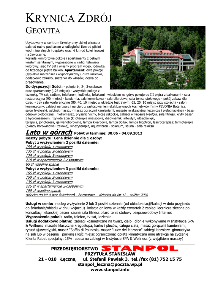 KRYNICA ZDRÓJ GEOVITA Usytuowany w centrum Krynicy przy cichej uliczce z dala od ruchu pod lasem w odległości 1km od pijalni wód mineralnych i deptaku oraz 6 km od kolei linowej na Jaworzynę. Posiada komfortowe pokoje i apartamenty z pełnym węzłem sanitarnym, wyposażone w radio, telewizor kolorowy, sieć TV Sat i własny program video, lodówkę, do trzeciego piętra balkon. Apartament: dwa pokoje (sypialnia małżeńska i wypoczynkowy), duża łazienka, dodatkowo żelazko, suszarka do włosów, deska do prasowania. Do dyspozycji Gości: - pokoje 1-, 2-, 3-osobowe oraz apartamenty (125 miejsc) - wszystkie pokoje z łazienką, TV sat, radiem, telefonem, lodówką, leżakami i widokiem na góry; pokoje do III piętra z balkonami - sala restauracyjna (90 miejsc) - kawiarnia, sala kominkowa - sala bilardowa, sala tenisa stołowego - pokój zabaw dla dzieci - trzy sale konferencyjne (80, 40, 10 miejsc w układzie teatralnym; 65, 20, 10 miejsc przy stołach) - salon kosmetyczny: zabiegi na twarz i na ciało z zastosowaniem ekskluzywnych kosmetyków firmy PEVONIA Botanica, salon fryzjerski, gabinet masażu (masaż gorącymi kamieniami, masaże relaksacyjne, lecznicze i pielęgnacyjne) - baza odnowy biologicznej: hydromasaż, prysznic Vichy, bicze szkockie, zabiegi w kapsule NeoQui, sala fitness, kryty basen z hydromasażem, fizykoterapia (krioterapia miejscowa, diadynamik, interdyn, ultradźwięki, terapuls, jonoforeza, galwanoborowina, lampa kwarcowa, lampa Sollux, lampa bioptron, laseroterapia); termoterapia (okłady borowinowe i żelowe), kinezyterapia, aquawibron - solarium, sauna - sala relaksu Lato w górach Pobyt w terminie: 30.06 - 04.09.2012 Koszty pobytu: Cena dziennie dla 1 osoby: Pobyt z wyżywieniem 2 posiłki dziennie: 150 zł w pokoju 1-osobowym 135 zł w pokoju 2-osobowym 120 zł w pokoju 3-osobowym 210 zł w apartamencie 2-osobowym 85 zł wspólne spanie Pobyt z wyżywieniem 3 posiłki dziennie: 165 zł w pokoju 1-osobowym 150 zł w pokoju 2-osobowym 135 zł w pokoju 3-osobowym 225 zł w apartamencie 2-osobowym 100 zł wspólne spanie dziecko do lat 4 bez świadczeń - bezpłatnie dziecko do lat 12 - zniżka 20% Usługi w cenie: nocleg wyżywienie 2 lub 3 posiłki dziennie (od obiadokolacji/kolacji w dniu przyjazdu do śniadania/obiadu w dniu wyjazdu) kolacja grillowa w każdy czwartek 2 zabiegi lecznicze zlecone po konsultacji lekarskiej basen sauna sala fitness bilard tenis stołowy bezprzewodowy Internet Wyposażenie pokoi: radio, telefon, tv sat, łazienka Usługi dodatkowo płatne: zabiegi kosmetyczne na twarz, ciało i dłonie wykonywane w Instytucie SPA & Wellness masaże klasyczne kręgosłupa, karku i pleców, całego ciała, masaż gorącymi kamieniami, rytuał ajurwedyjski, masaż "Soffio di Polinesia, masaż "Luce del Marocco" zabiegi lecznicze gimnastyka na sali lub w basenie parking (ilość miejsc ograniczona) opłata klimatyczna inne atrakcje na życzenie Klienta Rabat specjalny: 15% rabatu na zabiegi w Instytucie SPA & Wellness (z wyjątkiem masaży) PRZEDSIĘBIORSTWO PRZYTUŁA STANISŁAW 21 - 010 Łęczna, ul. Stefanii Pawlak 3, tel./fax (81) 752 15 75 [email protected] www.stanpol.info
