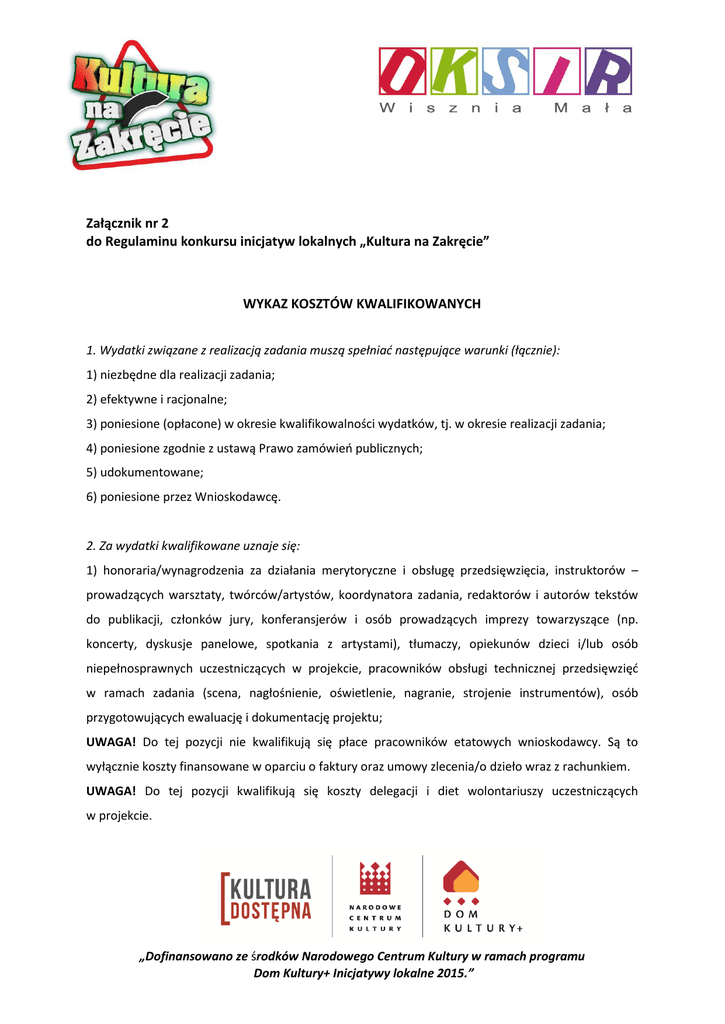 Załącznik nr 2 do Regulaminu konkursu inicjatyw lokalnych „Kultura na Zakręcie” WYKAZ KOSZTÓW KWALIFIKOWANYCH 1. Wydatki związane z realizacją zadania muszą spełniać następujące warunki (łącznie): 1) niezbędne dla realizacji zadania; 2) efektywne i racjonalne; 3) poniesione (opłacone) w okresie kwalifikowalności wydatków, tj. w okresie realizacji zadania; 4) poniesione zgodnie z ustawą Prawo zamówień publicznych; 5) udokumentowane; 6) poniesione przez Wnioskodawcę. 2. Za wydatki kwalifikowane uznaje się: 1) honoraria/wynagrodzenia za działania merytoryczne i obsługę przedsięwzięcia, instruktorów – prowadzących warsztaty, twórców/artystów, koordynatora zadania, redaktorów i autorów tekstów do publikacji, członków jury, konferansjerów i osób prowadzących imprezy towarzyszące (np. koncerty, dyskusje panelowe, spotkania z artystami), tłumaczy, opiekunów dzieci i/lub osób niepełnosprawnych uczestniczących w projekcie, pracowników obsługi technicznej przedsięwzięć w ramach zadania (scena, nagłośnienie, oświetlenie, nagranie, strojenie instrumentów), osób przygotowujących ewaluację i dokumentację projektu; UWAGA! Do tej pozycji nie kwalifikują się płace pracowników etatowych wnioskodawcy. Są to wyłącznie koszty finansowane w oparciu o faktury oraz umowy zlecenia/o dzieło wraz z rachunkiem. UWAGA! Do tej pozycji kwalifikują się koszty delegacji i diet wolontariuszy uczestniczących w projekcie. „Dofinansowano ze środków Narodowego Centrum Kultury w ramach programu Dom Kultury+ Inicjatywy lokalne 2015.” 2) koszty związane z dostosowaniem formy przekazu do potrzeb osób niepełnosprawnych ( w ramach kosztu nie można finansować prac remontowych i modernizacyjnych budynków, obiektów oraz wydatków inwestycyjnych oraz zakupu śrdków trwałych) ; 3) zakup materiałów niezbędnych do realizacji, zadania (np. materiałów niezbędnych do archiwizacji i dokumentacji: tonery, płyty CD, materiały biurowe), zajęć warsztatowych oraz przedsięwzięć artystycznych (dofinansowanie nie może być przeznaczone na pokrycie wydatków inwestycyjnych oraz zakupu śrdków trwałych); 4) koszty podróży/transportu: uczestników warsztatów, artystów i in. osób związanych z realizacją zadania, scenografii, instrumentów, elementów wyposażenia technicznego/sceny; 5) koszty związane z wydaniem publikacji (prawa autorskie, honoraria autorskie, redakcja i korekty, opracowanie typograficzne, opracowanie graficzne, druk, dystrybucja, nagranie i zwielokrotnienie utworu wydanego w formie audio-booka, umieszczenie w Internecie utworu wydanego w formie e-booka); 6) koszty wynajęcia sprzętu i urządzeń niezbędnych do realizacji zadania np. dodatkowego oświetlenia, nagłośnienia; 7) koszty nagrań (audio i video) materiałów stanowiących część zadania; 8) koszty projektu, wykonania, materiałów lub koszty wypożyczenia kostiumów, strojów i elementów scenografii; 9) noclegi i wyżywienie dla uczestników przedsięwzięć organizowanych w ramach zadania, w tym artystów i jurorów; 10) dokumentacja/rejestracja realizacji zadania (filmowa, dźwiękowa, zdjęciowa); 11) koszty promocji i kampanii informacyjnej (np. druki i ich kolportaż, zakup czasu antenowego, rozwój strony internetowej: uruchomienie łącza internetowego, zakup domeny – koszty te nie mogą przekroczyć 20% dofinansowania); 12) zakup praw autorskich lub licencji (dofinansowanie nie może być przeznaczone na pokrycie wydatków inwestycyjnych oraz zakupu śrdków trwałych); „Dofinansowano ze środków Narodowego Centrum Kultury w ramach programu Dom Kultury+ Inicjatywy lokalne 2015.” 13) niezbędne ubezpieczenia; 14) zakup nagród rzeczowych dla uczestników konkursów; UWAGA! Podatek od nagród nie jest kosztem kwalifikowanym. 15) projekt i wykonanie statuetek, dyplomów przyznawanych w konkursach; 16) zakup biletów dla uczestników zadania na przedsięwzięcia kulturalne (np. wystawy, spektakle teatralne, koncerty) stanowiące integralną część zadania. 3. Zakłada się, że kosztem kwalifikowanym będzie także podatek VAT (od kosztów kwalifikowanych). W przypadku uzyskania przez wnioskodawcę zwrotu podatku VAT opłaconego z dofinansowania, zobowiązany jest on do zwrotu, w ciągu 14 dni od dnia otrzymania zwrotu podatku, równowartości otrzymanych środków finansowych (VAT z Urzędu Skarbowego) od kosztów dofinansowanych. „Dofinansowano ze środków Narodowego Centrum Kultury w ramach programu Dom Kultury+ Inicjatywy lokalne 2015.”