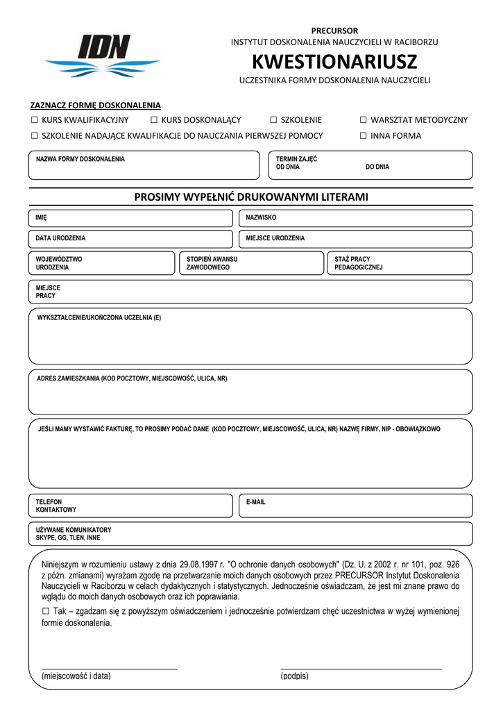 PRECURSOR INSTYTUT DOSKONALENIA NAUCZYCIELI W RACIBORZU KWESTIONARIUSZ UCZESTNIKA FORMY DOSKONALENIA NAUCZYCIELI ZAZNACZ FORMĘ DOSKONALENIA □ KURS KWALIFIKACYJNY □ KURS DOSKONALĄCY □ SZKOLENIE □ SZKOLENIE NADAJĄCE KWALIFIKACJE DO NAUCZANIA PIERWSZEJ POMOCY NAZWA FORMY DOSKONALENIA TERMIN ZAJĘĆ OD DNIA □ WARSZTAT METODYCZNY □ INNA FORMA DO DNIA PROSIMY WYPEŁNIĆ DRUKOWANYMI LITERAMI IMIĘ NAZWISKO DATA URODZENIA MIEJSCE URODZENIA WOJEWÓDZTWO URODZENIA STOPIEŃ AWANSU ZAWODOWEGO STAŻ PRACY PEDAGOGICZNEJ MIEJSCE PRACY WYKSZTAŁCENIE/UKOŃCZONA UCZELNIA (E) ADRES ZAMIESZKANIA (KOD POCZTOWY, MIEJSCOWOŚĆ, ULICA, NR) JEŚLI MAMY WYSTAWIĆ FAKTURĘ, TO PROSIMY PODAĆ DANE (KOD POCZTOWY, MIEJSCOWOŚĆ, ULICA, NR) NAZWĘ FIRMY, NIP - OBOWIĄZKOWO TELEFON KONTAKTOWY E-MAIL UŻYWANE KOMUNIKATORY SKYPE, GG, TLEN, INNE Niniejszym w rozumieniu ustawy z dnia 29.08.1997 r. "O ochronie danych osobowych" (Dz. U. z 2002 r. nr 101, poz. 926 z późn. zmianami) wyrażam zgodę na przetwarzanie moich danych osobowych przez PRECURSOR Instytut Doskonalenia Nauczycieli w Raciborzu w celach dydaktycznych i statystycznych. Jednocześnie oświadczam, że jest mi znane prawo do wglądu do moich danych osobowych oraz ich poprawiania. □ Tak – zgadzam się z powyższym oświadczeniem i jednocześnie potwierdzam chęć uczestnictwa w wyżej wymienionej formie doskonalenia. ________________________________ (miejscowość i data) ______________________________________ (podpis)