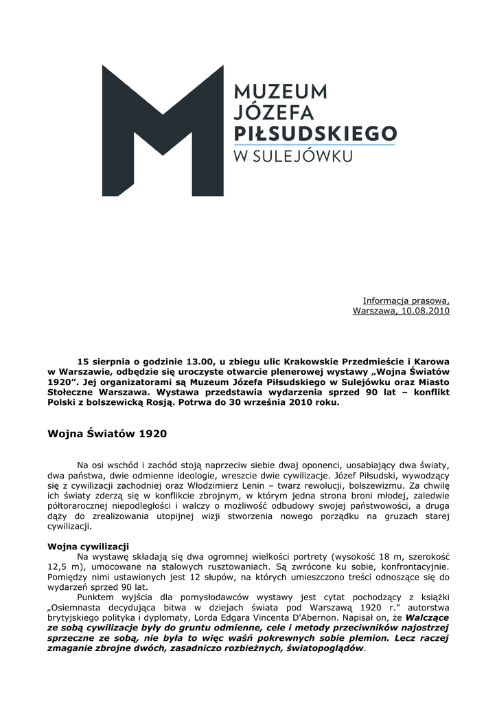 Informacja prasowa, Warszawa, 10.08.2010 15 sierpnia o godzinie 13.00, u zbiegu ulic Krakowskie Przedmieście i Karowa w Warszawie, odbędzie się uroczyste otwarcie plenerowej wystawy „Wojna Światów 1920”. Jej organizatorami są Muzeum Józefa Piłsudskiego w Sulejówku oraz Miasto Stołeczne Warszawa. Wystawa przedstawia wydarzenia sprzed 90 lat – konflikt Polski z bolszewicką Rosją. Potrwa do 30 września 2010 roku. Wojna Światów 1920 Na osi wschód i zachód stoją naprzeciw siebie dwaj oponenci, uosabiający dwa światy, dwa państwa, dwie odmienne ideologie, wreszcie dwie cywilizacje. Józef Piłsudski, wywodzący się z cywilizacji zachodniej oraz Włodzimierz Lenin – twarz rewolucji, bolszewizmu. Za chwilę ich światy zderzą się w konflikcie zbrojnym, w którym jedna strona broni młodej, zaledwie półtorarocznej niepodległości i walczy o możliwość odbudowy swojej państwowości, a druga dąży do zrealizowania utopijnej wizji stworzenia nowego porządku na gruzach starej cywilizacji. Wojna cywilizacji Na wystawę składają się dwa ogromnej wielkości portrety (wysokość 18 m, szerokość 12,5 m), umocowane na stalowych rusztowaniach. Są zwrócone ku sobie, konfrontacyjnie. Pomiędzy nimi ustawionych jest 12 słupów, na których umieszczono treści odnoszące się do wydarzeń sprzed 90 lat. Punktem wyjścia dla pomysłodawców wystawy jest cytat pochodzący z książki „Osiemnasta decydująca bitwa w dziejach świata pod Warszawą 1920 r.” autorstwa brytyjskiego polityka i dyplomaty, Lorda Edgara Vincenta D'Abernon. Napisał on, że Walczące ze sobą cywilizacje były do gruntu odmienne, cele i metody przeciwników najostrzej sprzeczne ze sobą, nie była to więc waśń pokrewnych sobie plemion. Lecz raczej zmaganie zbrojne dwóch, zasadniczo rozbieżnych, światopoglądów. Pierwsze słupy przedstawiają cele obu stron konfliktu. – Na początku te, które chciała realizować rewolucja bolszewicka – mówi dr hab. Grzegorz Nowik, komisarz wystawy. Mgławica marzeń, idei i kompleksów. Mroczna utopia, która jednak stała się jedną z sił motorycznych XX wieku. Z drugiej strony przedstawiamy to, co stanowiło naszą moc. Moc, która pozwoliła przetrwać, odepchnąć wrogie siły, obronić się. Następnie ukazany jest przebieg Bitwy Warszawskiej, jednak nie jako lokalnego starcia na przedmieściach stolicy, ale – zgodnie z prawdą historyczną – wojny toczącej się na obszarze wielkości Belgii i Holandii razem wziętych - zarówno pod Nieszawą, jak pod Zamościem czy Hrubieszowem, pod Brześciem i pod Augustowem. Ostatni słup przedstawia skutki bitwy. - Dla Rosji jest to nieudana rewolucja światowa, a dla Polski uzyskanie czasu, w którym może ona rozwinąć struktury państwowe, kulturę, szkolnictwo, naukę – mówi Krzysztof Jaraczewski, dyrektor Muzeum Józefa Piłsudskiego w Sulejówku. - Gdyby nie te 20 lat wolności, nie przetrwalibyśmy II wojny światowej, zbrodni katyńskiej i rządów komunistycznych. Zwycięstwo dało nam czas, by zadbać o wartości po swojemu i by dzięki nim suwerenne państwo polskie mogło się na nowo odrodzić po 1989 roku. Wydarzenia sprzed 90 lat przedstawione są jako konflikt rozgrywający sie w trzech wymiarach: uniwersalnym, politycznym i ideologicznym. Politycznie był to po części dawny konflikt polsko - rosyjski o Kresy Wschodnie. W sferze ideologicznej walczyły ze sobą Rosja bolszewicka, pragnąca przenieść ogień rewolucji do Europy z broniącą swej niepodległości demokratyczną Polską. W wymiarze uniwersalnym był to konflikt cywilizacyjny, kulturowy, odmiennych poglądów na to, czym jest człowieczeństwo, państwo i co oznacza słowo wolność. – My nie stawialiśmy sobie celu podboju Rosji i zajęcia Moskwy – podkreśla dr hab. Grzegorz Nowik. - Chcieliśmy zachować niepodległość i pomóc naszym sąsiadom urządzić tę część Europy, jako sferę wolności i demokracji, wolnego rynku i własności osobistej. Pomóc innym narodom – od republik bałtyckich po Morze Czarne – oddychać wolnością w europejskim rozumieniu tego słowa. Natomiast Rosja bolszewicka stawiała sobie cel przeniesienia do Europy Zachodniej, na bagnetach Armii Czerwonej, rewolucji w wydaniu bolszewickim. Twórcy wystawy uznali, że dobrym jej podsumowaniem może być cytat z książki Adama Zamojskiego (Warsaw 1920. Lenin’s Failed Conquest of Europe, London 2008): „Jeśli nawet Polskie zwycięstwo zostało wkrótce przekreślone przez to co się wydarzyło po 1939 roku, te dwie dekady wolności od komunizmu dały krajom Środkowo-Wschodniej Europy więcej niż pozostałym krajom kontynentu, były pierwszymi ich doświadczeniami demokracji i cywilizowanej egzystencji. (…) Choć współczesnemu obserwatorowi może się wydawać, że to krótkie doświadczenie w dziedzinie demokracji nie było w pełni doskonałe, jednak pozwoliło ono mieszkańcom tego obszaru, rozciągającego się obecnie od Estonii po Bałkany, rozwinąć i upowszechnić instytucje i formy społeczeństwa obywatelskiego – z większym skutkiem, niż się to powszechnie uważa. W takich dziedzinach, jak polityka społeczna i oświata, emancypacja kobiet oraz na wielu innych polach, państwa tego regionu prześcignęły starsze demokracje, na przykład Francję i Wielką Brytanię, nie mówiąc już o Stanach Zjednoczonych. I to było tym co pozwoliło przetrwać i stawić czoło, a w ostatecznym rachunku pokonać, zarówno faszyzm jak i komunizm. Obecny demokratyczny i państwowy zmysł krajów tamtej części Europy jest w znacznym stopniu skutkiem owych dwóch dekad wolności, które zagwarantował Józef Piłsudski i jego wojska nad Wisłą w 1920 r.” Zestawione zostały także dwie wypowiedzi: Lenina i Piłsudskiego, dwa różne wnioski, jakie każdy z nich wyciągnął. Józef Piłsudski chciał wierzyć w możliwość pokojowego współistnienia, Lenin myślał o nowej próbie podboju. Józef Piłsud