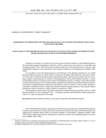 Arch. Min. Sci., Vol. 56 (2011), No 3, p. 477–488 477 Electronic version (in color) of this paper is available: http://mining.archives.pl MAREK LENARTOWICZ*, JERZY SABLIK** ASSESSMENT OF OPERATION OF PNEUMO-MECHANICAL FLOTATION MACHINES USING FILM FLOTATION METHOD OCENA PRACY PNEUMOMECHANICZNYCH MASZYN FLOTACYJNYCH PRZY WYKORZYSTANIU FRAKCJONOWANEJ FLOTACJI POWIERZCHNIOWEJ Flotation of coal slurry is carried out on a mass scale in flotation machines. In the industrial practice the concentrate output and separation selectivity, which is expressed in ash content in a concentrate and in tailings (Sablik, 1980, 1998) decide about technical efficiency of the flotation process. Also the yield of flammable substance in the concentrate is the measure of efficiency of washing process (Sablik, 1980, 1998). It is possible to assess the flotation process and efficiency of the flotation machines by use of film flotation method (Lenartowicz, 2007a, 2007b; Lenartowicz & Sablik, 2006; Sablik & Lenartowicz, 2007). Use of the above mentioned method enables determining surface characteristics (surface tension of wetting, energetic nonhomogeneity of surface) of floating particles along entire flotation machine, a content of hydrophilic particles in products and a content of hydrophobic particles in tailings. The method enables to analyze flotation process in a selected impeller compartment of pneumo-mechanical flotation machine. Assessment of applied flotation technology and efficiency of given machine is also possible. Besides, it is possible to identify the factors, which cause that the machines operate properly or they operate without satisfactory results (Lenartowicz, 2007a; Sablik & Lenartowicz, 2007). The procedure in assessment of operation of pneumo-mechanical flotation machines with use of film flotation method as well as operation of IZ – 12 flotation machine that beneficiates flame-and-gaseous coal of 32.1 type was presented in the paper. Keywords: flotation, flotation machine, assessment of operation, film flotation method Proces flotacji pianowej mułów węglowych w sposób masowy prowadzi się w maszynach flotacyjnych. W praktyce przemysłowej o technicznej efektywności procesu flotacji decyduje wychód koncentratu oraz selektywność rozdziału miarą, której są zawartości popiołu w koncentracie i odpadach (Sablik, 1980, 1998). Miarą efektywności procesu wzbogacania, może być również uzysk substancji palnej w koncentracie (Sablik, 1980, 1998). * ** KOMAG INSTITUTE OF MINING TECHNOLOGY, DIVISION OF PREPARATION SYSTEMS, PSZCZYŃSKA 37, 44-101 GLIWICE, POLAND; EMAIL: [email protected] RETIRED EMPLOYEE OF CENTRAL MINING INSTITUTE IN KATOWICE, POLAND 478 Do oceny technologii flotacji i sprawności flotowników można wykorzystać badania procesu flotacji przy pomocy metody frakcjonowanej flotacji powierzchniowej (Lenartowicz, 2007a, 2007b; Lenartowicz i Sablik, 2006; Sablik i Lenartowicz, 2007). Zastosowanie ww. metody umożliwia określenie właściwości powierzchniowych (napięcie powierzchniowe zwilżania, niejednorodność energetyczną powierzchni) ziaren flotujących wzdłuż całej maszyny flotacyjnej, zawartości ziaren hydrofilowych w poszczególnych produktach oraz zawartości ziaren hydrofobowych w odpadach. Dzięki tej metodzie możliwa jest analiza przebiegu procesu flotacji w wybranym przedziale wirnikowym pneumomechanicznej maszyny flotacyjnej, a także możliwa jest ocena zastosowanej technologii flotacji i sprawności technologicznej danej maszyny. Ponadto możliwe jest określenie czynników, które powodują, że maszyny te pracują właściwie lub nie uzyskują zadawalających wyników (Lenartowicz, 2007a; Sablik i Lenartowicz, 2007). W pracy przedstawiono tok postępowania przy ocenie pracy pneumomechnicznych maszyn flotacyjnych za pomocą frakcjonowanej flotacji powierzchniowej oraz przedstawiono ocenę pracy flotownika IZ – 12 wzbogacającego węgiel gazowo-płomienny typu 32.1. Słowa kluczowe: flotacja, maszyna flotacyjna, ocena pracy, metoda frakcjonowanej flotacji powierzchniowej 1. Introduction In the result of advance in coal mining mechanization and transportation much more fine coal fraction that has to be beneficiated reaches coal processing plants. Hard coal particles of size below 0.5 mm can be processed by flotation and oil agglomeration methods, in hydrocyclones and in coil separators. In the Polish coal processing plants froth flotation is most frequently used to beneficiate above mentioned particle size fraction (Lenartowicz, 2007a; Sablik & Lenartowicz, 2007). In Poland this method is used to process mainly coke coal fines, but also steam coal slurry is more frequently beneficiated using that method (Sablik, 1998). Froth flotation is a physical and chemical method consisting in a selective separation of hydrophobic materials by taking advantage of differences in coal particles and waste rock surface properties and first of all of differences in their surface wettability. Coal particles of not wettable surface (hydrophobic) can flotate and waste rock particles of wettable surface (hydrophilic) do not flotate. Surface properties of coal particles can be determine, among others by measuring of their boundary wetting angle (Eliaszewicz, 1941; Sablik, 1980; Sablik & Makula, 1984), wetting heat (Fowkes, 1964), zeta electro-kinetic potential (Fijał et al.,1980; Fuerstenau, 1980; Sobieraj & Majka-Myrcha, 1980), adsorption energy (Bangham & Razouk, 1937; Wierzchowski, 1993) as well as by use of film flotation method (Diao & Fuerstenau, 1991; Fuerstenau, 1980; Fuerstenau et al., 1990, 1991; Fuerstenau & Williams, 1987; Sablik, 2005, 2007; Williams and Fuerstenau, 1987). Film flotation method enables characterizing quantitatively the surface of low-energy solids (e.g. coal) as well as determining energetic nonhomogeneity of surface in a group of given solid particles (coal). Froth flotation of coal slurry is carried out on a mass scale in the flotati