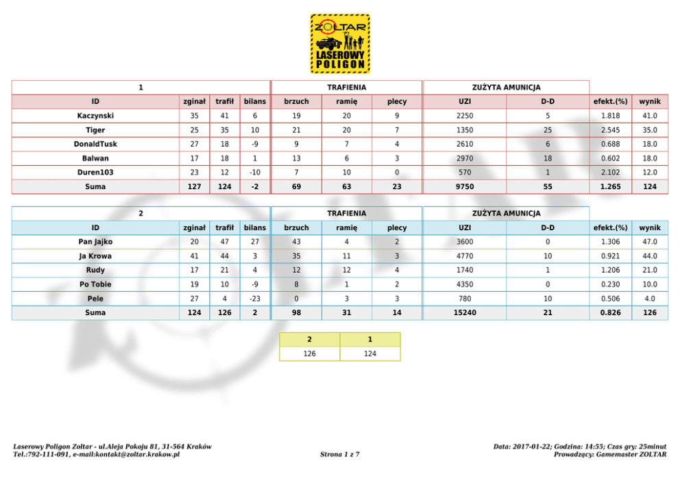 1 TRAFIENIA ZUŻYTA AMUNICJA ID zginał trafił bilans brzuch ramię plecy UZI D-D efekt.(%) wynik Kaczynski 35 41 6 19 20 9 2250 5 1.818 41.0 Tiger 25 35 10 21 20 7 1350 25 2.545 35.0 DonaldTusk 27 18 -9 9 7 4 2610 6 0.688 18.0 Balwan 17 18 1 13 6 3 2970 18 0.602 18.0 Duren103 23 12 -10 7 10 0 570 1 2.102 12.0 Suma 127 124 -2 69 63 23 9750 55 1.265 124 2 TRAFIENIA ZUŻYTA AMUNICJA ID zginał trafił bilans brzuch ramię plecy UZI D-D efekt.(%) wynik Pan Jajko 20 47 27 43 4 2 3600 0 1.306 47.0 Ja Krowa 41 44 3 35 11 3 4770 10 0.921 44.0 Rudy 17 21 4 12 12 4 1740 1 1.206 21.0 Po Tobie 19 10 -9 8 1 2 4350 0 0.230 10.0 Pele 27 4 -23 0 3 3 780 10 0.506 4.0 Suma 124 126 2 98 31 14 15240 21 0.826 126 Laserowy Poligon Zoltar - ul.Aleja Pokoju 81, 31-564 Kraków Tel.:792-111-091, e-mail:[email protected] 2 1 126 124 Strona 1 z 7 Data: 2017-01-22; Godzina: 14:55; Czas gry: 25minut Prowadzący: Gamemaster ZOLTAR 1 TRAFIENIA ZUŻYTA AMUNICJA ID zginał trafił bilans brzuch ramię plecy UZI D-D efekt.(%) wynik Pan Jajko 21 33 12 28 4 4 2640 0 1.250 33.0 Tiger 16 24 8 18 9 0 2490 16 0.958 24.0 Kaczynski 24 23 -1 17 5 2 2430 2 0.946 23.0 Duren103 26 20 -6 13 7 3 1830 0 1.093 20.0 Po Tobie 20 15 -5 12 1 2 4410 0 0.340 15.0 Suma 107 115 8 88 26 11 13800 18 0.832 115 2 TRAFIENIA ZUŻYTA AMUNICJA ID zginał trafił bilans brzuch ramię plecy UZI D-D efekt.(%) wynik Ja Krowa 29 38 9 32 6 4 4410 0 0.862 38.0 Rudy 24 28 4 16 9 6 1620 0 1.728 28.0 Balwan 26 21 -5 11 6 4 3420 6 0.613 21.0 DonaldTusk 29 18 -11 11 7 5 3420 15 0.524 18.0 Pele 7 2 -5 0 2 0 330 2 0.602 2.0 Suma 115 107 -8 70 30 19 13200 23 0.809 107 Laserowy Poligon Zoltar - ul.Aleja Pokoju 81, 31-564 Kraków Tel.:792-111-091, e-mail:[email protected] 1 2 115 107 Strona 2 z 7 Data: 2017-01-22; Godzina: 15:55; Czas gry: 25minut Prowadzący: Gamemaster ZOLTAR 1 TRAFIENIA ZUŻYTA AMUNICJA ID zginał trafił bilans brzuch ramię plecy UZI D-D efekt.(%) wynik Pan Jajko 28 62 34 45 25 21 690 113 7.721 62.0 Balwan 33 33 0 23 13 5 4980 0 0.663 33.0 Duren103 48 28 -20 21 2 6 2520 0 1.111 28.0 DonaldTusk 37 26 -11 13 13 5 4470 4 0.581 26.0 Pele 10 1 -9 1 0 0 450 6 0.219 1.0 Suma 156 150 -6 103 53 37 13110 123 1.134 150 2 TRAFIENIA ZUŻYTA AMUNICJA ID zginał trafił bilans brzuch ramię plecy UZI D-D efekt.(%) wynik Kaczynski 41 51 10 40 24 10 1320 128 3.522 51.0 Rudy 27 38 11 28 11 9 2280 1 1.666 38.0 Ja Krowa 33 27 -6 25 3 2 4680 6 0.576 27.0 Po Tobie 33 24 -9 21 4 3 870 134 2.390 24.0 Tiger 16 16 0 14 3 1 2520 7 0.633 16.0 Suma 150 156 6 128 45 25 11670 276 1.306 156 Laserowy Poligon Zoltar - ul.Aleja Pokoju 81, 31-564 Kraków Tel.:792-111-091, e-mail:[email protected] 2 1 156 150 Strona 3 z 7 Data: 2017-01-22; Godzina: 16:56; Czas gry: 23minut Prowadzący: Gamemaster ZOLTAR Drużyny Rozgrywki Miejsce Nazwa Laserowy Poligon Zoltar - ul.Aleja Pokoju 81, 31-564 Kraków Tel.:792-111-091, e-mail:[email protected] 1 2 3 Suma 1 124 115 150 389 2 126 107 156 389 Strona 4 z 7 Data: 2017-01-22 Prowadzący: Gamemaster ZOLTAR Zestawienie wg wyniku Miejsce TRAFIENIA ZUŻYTA AMUNICJA ID zginał trafił bilans brzuch ramię plecy UZI D-D efekt.(%) wynik Pan Jajko 73.04 161.74 88.70 117.39 65.22 54.78 1800.00 294.78 7.721 161.74 Pan Jajko 49.20 96.00 46.80 85.20 9.60 7.20 7488.00 0.00 1.282 96.00 Kaczynski 82.85 95.55 12.70 63.58 40.87 17.50 4891.83 116.90 1.908 95.55 4 Ja Krowa 84.70 89.08 4.38 75.34 16.21 7.34 11413.57 13.22 0.780 89.08 5 Rudy 56.28 72.24 15.97 46.75 26.37 15.83 4670.61 1.67 1.546 72.24 6 Tiger 46.71 61.11 14.40 43.37 25.81 6.47 5263.30 38.89 1.153 61.11 7 Balwan 63.10 59.90 -3.20 39.20 20.90 9.95 9442.43 19.20 0.633 59.90 8 DonaldTusk 76.97 51.41 -25.57 27.30 22.50 11.55 8710.96 20.28 0.589 51.41 9 Duren103 80.94 49.95 -30.99 34.26 15.34 7.62 4111.30 0.80 1.215 49.95 10 Po Tobie 59.90 40.87 -19.03 34.26 5.08 5.81 7764.52 116.52 0.519 40.87 11 Pele 35.90 5.67 -30.23 0.87 4.00 2.40 1279.30 14.82 0.438 5.67 Laserowy Poligon Zoltar - ul.Aleja Pokoju 81, 31-564 Kraków Tel.:792-111-091, e-mail:[email protected] Strona 5 z 7 Data: 2017-01-22 Prowadzący: Gamemaster ZOLTAR Zestawienie wg bilansu Miejsce TRAFIENIA ZUŻYTA AMUNICJA ID zginał trafił bilans brzuch ramię plecy UZI D-D efekt.(%) wynik Pan Jajko 73.04 161.74 88.70 117.39 65.22 54.78 1800.00 294.78 7.721 161.74 Pan Jajko 49.20 96.00 46.80 85.20 9.60 7.20 7488.00 0.00 1.282 96.00 Rudy 56.28 72.24 15.97 46.75 26.37 15.83 4670.61 1.67 1.546 72.24 4 Tiger 46.71 61.11 14.40 43.37 25.81 6.47 5263.30 38.89 1.153 61.11 5 Kaczynski 82.85 95.55 12.70 63.58 40.87 17.50 4891.83 116.90 1.908 95.55 6 Ja Krowa 84.70 89.08 4.38 75.34 16.21 7.34 11413.57 13.22 0.780 89.08 7 Balwan 63.10 59.90 -3.20 39.20 20.90 9.95 9442.43 19.20 0.633 59.90 8 Po Tobie 59.90 40.87 -19.03 34.26 5.08 5.81 7764.52 116.52 0.519 40.87 9 DonaldTusk 76.97 51.41 -25.57 27.30 22.50 11.55 8710.96 20.28 0.589 51.41 10 Pele 35.90 5.67 -30.23 0.87 4.00 2.40 1279.30 14.82 0.438 5.67 11 Duren103 80.94 49.95 -30.99 34.26 15.34 7.62 4111.30 0.80 1.215 49.95 Laserowy Poligon Zoltar - ul.Aleja Pokoju 81, 31-564 Kraków Tel.:792-111-091, e-mail:[email protected] Strona 6 z 7 Data: 2017-01-22 Prowadzący: Gamemaster ZOLTAR Zestawienie wg efektywności Miejsce TRAFIENIA ZUŻYTA AMUNICJA ID zginał trafił bilans brzuch ramię plecy UZI D-D efekt.(%) wynik Pan Jajko 73.04 161.74 88.70 117.39 65.22 54.78 1800.00 294.78 7.721 161.74 Kaczynski 82.85 95.55 12.70 63.58 40.87 17.50 4891.83 116.90 1.908 95.55 Rudy 56.28 72.24 15.97 46.75 26.37 15.83 4670.61 1.67 1.546 72.24 4 Pan Jajko 49.20 96.00 46.80 85.20 9.60 7.20 7488.00 0.00 1.282 96.00 5 Duren103 80.94 49.95 -30.99 34.26 15.34 7.62 4111.30 0.80 1.215 49.95 6 Tiger 46.71 61.11 14.40 43.37 25.81 6.47 5263.30 38.89 1.153 61.11 7 Ja Krowa 84.70 89.08 4.38 75.34 16.21 7.34 11413.57 13.22 0.780 89.08 8 Balwan 63.10 59.90 -3.20 39.20 20.90 9.95 9442.43 19.20 0.633 59.90 9 DonaldTusk 76.97 51.41 -25.57 27.30 22.50 11.55 8710.96 20.28 0.589 51.41 10 Po Tobie 59.90 40.87 -19.03 34.26 5.08 5.81 7764.52 116.52 0