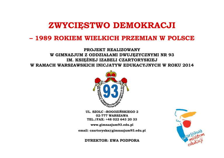 ZWYCIĘSTWO DEMOKRACJI – 1989 ROKIEM WIELKICH PRZEMIAN W POLSCE PROJEKT REALIZOWANY W GIMNAZJUM Z ODDZIAŁAMI DWUJĘZYCZNYMI NR 93 IM. KSIĘśNEJ IZABELI CZARTORYSKIEJ W RAMACH WARSZAWSKICH INICJATYW EDUKACYJNYCH W ROKU 2014 UL. SZOLC –ROGOZIŃSKIEGO 2 02-777 WARSZAWA TEL./FAX: +48 022 643 20 33 www.gimnazjum93.edu.pl email: [email protected] DYREKTOR: EWA PODPORA O demokracji z wybitnymi Polakami Spotkanie z Andrzejem Wajdą Spotkanie z Adamem Michnikiem Warsztaty i wycieczki ,,Symfonia wolności – 1989” w Muzeum Niepodległości Warsztaty i wycieczki Prawa i obowiązki jednostki w państwie demokratycznym w Kancelarii Senatu ,,Solidarność – historia i etos” w Domu Spotkań z Historią „Trzy obiegi – kultura 1980 - 1989” Wybory 4 czerwca 1989 roku” w Instytucie Pamięci Narodowej Filmy ,,Człowiek z marmuru” – reŜ. A. Wajda ,,Człowiek z Ŝelaza” – reŜ. A. Wajda Plakaty Debata Okolicznościowe wydanie szkolnej gazetki Ursynowski Test wiedzy na temat wydarzeń 1989 r. pod honorowym patronatem Burmistrza dzielnicy Ursynów m. st. Warszawy Pana Piotra Guziała Konkurs na kartkę urodzinową dla polskiej demokracji Konkurs piosenki patriotyczno-solidarnościowej Ursynowski Plebiscyt „25 wydarzeń na 25-lecie demokracji w Polsce” pod honorowym patronatem Burmistrza dzielnicy Ursynów m. st. Warszawy Pana Piotra Guziała Wyniki Plebiscytu „25 wydarzeń na 25-lecie demokracji w Polsce” Wstąpienie do Unii Europejskiej 77% Utworzenie rządu Tadeusza Mazowieckiego 13% Wejście do strefy Schengen 57% Wielka Orkiestra Świątecznej Pomocy 13% Metro w Warszawie 53% Lech Wałęsa w Kongresie USA 10% Wstąpienie do NATO 43% Nagroda Nobla dla Wisławy Szymborskiej 10% Euro 2012 40% Powstanie Instytutu Pamięci Narodowej 7% Zniesienie cenzury w mediach 33% Prezydentura Lecha Wałęsy 7% MoŜliwość podróŜowania po całym świecie 20% Prywatyzacja przedsiębiorstw państwowych 7% Uchwalenie Konstytucji w 1997 r. 20% Wymiana pieniędzy 7% Kanonizacja Jana Pawła II 17% Złota Palma w Cannes dla Krystyny Jandy 7% Reformy Leszka Balcerowicza 17% Katastrofa smoleńska 3% Nagroda Nobla dla Lecha Wałęsy 13% Konkordat 1993 r. 3% Oscar dla Andrzeja Wajdy 13% Reforma systemu oświaty 1999 r. 3% Południowa obwodnica Warszawy 13% Rozwój społeczeństwa obywatelskiego 3% Rozwój Internetu 3% Wyniki Plebiscytu „25 wydarzeń na 25-lecie demokracji w Polsce” Czy Polska i Polacy wykorzystali szansę, jaką dawały przemiany ustrojowe po 1989 roku? Tak – 40% Nie – 33% Nie mam zdania – 3% Czy z perspektywy czasu moŜna powiedzieć, Ŝe warto było 1989 roku zmieniać w Polsce ustrój? Tak – 57% Nie – 13 % Nie mam zdania 3% Uroczystość podsumowująca projekt Goście (od lewej): p. Teresa Jurczyńska – Owczarek – radna dzielnicy Ursynów p. Witold Kołodziejski – Zastępca Burmistrza dzielnicy Ursynów p. Mirosława śurawska – Naczelnik Wydziału Edukacji dzielnicy Ursynów p. Barbara Robakiewicz – przedstawiciel Biura Edukacji m. st. Warszawy p. Ewa Podpora – Dyrektor Gimnazjum nr 93 p. Monika Sierpniak – Wicedyrektor Gimnazjum nr 93 Uroczystość podsumowująca projekt Wręczenie nagród laureatom konkursów Uroczystość podsumowująca projekt Inscenizacja muzyczno-teatralna Okolicznościowy tort ZWYCIĘSTWO DEMOKRACJI – 1989 ROKIEM WIELKICH PRZEMIAN W POLSCE PROJEKT REALIZOWANY W GIMNAZJUM Z ODDZIAŁAMI DWUJĘZYCZNYMI NR 93 IM. KSIĘśNEJ IZABELI CZARTORYSKIEJ W RAMACH WARSZAWSKICH INICJATYW EDUKACYJNYCH W ROKU 2014 UL. SZOLC –ROGOZIŃSKIEGO 2 02-777 WARSZAWA TEL./FAX: +48 022 643 20 33 www.gimnazjum93.edu.pl email: [email protected] DYREKTOR: EWA PODPORA