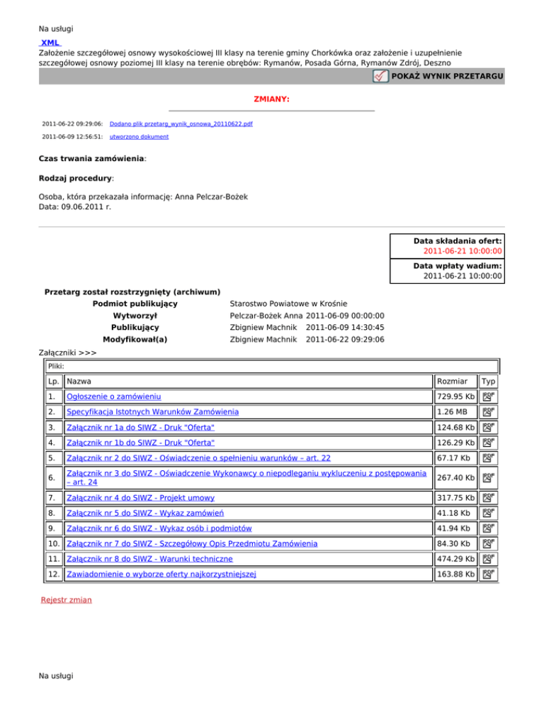 Na usługi XML Założenie szczegółowej osnowy wysokościowej III klasy na terenie gminy Chorkówka oraz założenie i uzupełnienie szczegółowej osnowy poziomej III klasy na terenie obrębów: Rymanów, Posada Górna, Rymanów Zdrój, Deszno POKAŻ WYNIK PRZETARGU ZMIANY: 2011-06-22 09:29:06: Dodano plik przetarg_wynik_osnowa_20110622.pdf 2011-06-09 12:56:51: utworzono dokument Czas trwania zamówienia: Rodzaj procedury: Osoba, która przekazała informację: Anna Pelczar-Bożek Data: 09.06.2011 r. Data składania ofert: 2011-06-21 10:00:00 Data wpłaty wadium: 2011-06-21 10:00:00 Przetarg został rozstrzygnięty (archiwum) Podmiot publikujący Starostwo Powiatowe w Krośnie Wytworzył Pelczar-Bożek Anna 2011-06-09 00:00:00 Publikujący Zbigniew Machnik 2011-06-09 14:30:45 Modyfikował(a) Zbigniew Machnik 2011-06-22 09:29:06 Załączniki >>> Pliki: Lp. Nazwa Rozmiar 1. Ogłoszenie o zamówieniu 729.95 Kb 2. Specyfikacja Istotnych Warunków Zamówienia 1.26 MB 3. Załącznik nr 1a do SIWZ - Druk "Oferta" 124.68 Kb 4. Załącznik nr 1b do SIWZ - Druk "Oferta" 126.29 Kb 5. Załącznik nr 2 do SIWZ - Oświadczenie o spełnieniu warunków – art. 22 67.17 Kb 6. Załącznik nr 3 do SIWZ - Oświadczenie Wykonawcy o niepodleganiu wykluczeniu z postępowania – art. 24 267.40 Kb 7. Załącznik nr 4 do SIWZ - Projekt umowy 317.75 Kb 8. Załącznik nr 5 do SIWZ - Wykaz zamówień 41.18 Kb 9. Załącznik nr 6 do SIWZ - Wykaz osób i podmiotów 41.94 Kb 10. Załącznik nr 7 do SIWZ - Szczegółowy Opis Przedmiotu Zamówienia 84.30 Kb 11. Załącznik nr 8 do SIWZ - Warunki techniczne 474.29 Kb 12. Zawiadomienie o wyborze oferty najkorzystniejszej 163.88 Kb Rejestr zmian Na usługi Typ