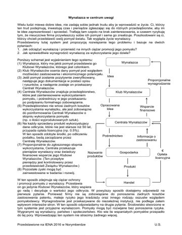 Wynalazca w centrum uwagi Wielu ludzi miewa dobre idee, nie zadają sobie jednak trudu aby je wprowadzić w życie. Ci, którzy ten trud podejmują, inwestują czas i pieniądze zgłaszając się do różnych przedsiębiorstw, aby im te idee zaprezentować i sprzedać. Trafiają tam często na brak zainteresowania, a czasem ryzykują tym, że nieuczciwa firma przywłaszczy sobie ich pomysł i sama go zrealizuje. Poszkodowani są ci, którzy chcieli przedstawić swój pomysł światu. Tak wygląda życie wynalazcy. Przedstawiony tutaj system jest propozycją rozwiązania tego problemu i bazuje na dwóch pytaniach: 1. Jak odciążyć wynalazcę i przenieść na innych ciężar promocji jego pomysłu? 2. Jak sprawiedliwie wynagrodzić wynalazcę za wykorzystanie jego dzieła? Ponższy schemat jest wyjaśnieniem tego systemu: Wynalazca (1) Wynalazca, który ma jakiś pomysł przedstawia go Klubowi Wynalazców, którego jest członkiem. (2) Klub Wynalazców ocenia dany pomysł pod względem możliwości zastosowania i ekonomicznego potencjału. Idea (3) Jeśli pomysł zostanie pozytywnie zweryfikowany, Proporcjonalne następuje jego dokumentacja w postaci opisu wynagrodzenie i rysunków, a następnie zostaje on przekazany Centrali Wynalazców. (4) Centrala Wynalazców znajduje przedsiębiorstwo, Klub Wynalazców które jest zainteresowane wykorzystaniem pomysłu, i pośredniczy w jego przekazaniu po podpisaniu formalnego zobowiązania. Opracowana (5) Przedsiębiorstwo nie wnosi żadnych kosztów Wsparcie Idea wykorzystania wynalazku, ale jest zobowiązne finansowe do poinformowania Centrali Wynalazców o stopniu wykorzystania pomysłu (np. o ilości wyprodukowanych sztuk). Centrala Wynalazców (6) Na każdy sprzedany produkt wykorzystujacy dane odkrycie, które nie jest starsze niż 50 lat, przypada opłata licencyjna (np. 0.5%). W ten sposób zdobyte środki, po odliczeniu Pośrednictwo Informacja o podatku, bedą zarządzane przez zastosowaniu Centralę Wynalazców. (7) Proporcjonalnie do zgłoszonego stopnia wykorzystania, Centrala przekazuje € pieniądze wynalazcy oraz świadczy Gospodarka Nazwanie Opłata finansowe wsparcie jego Klubowi produktów licencyjna Wynalazców. (Ten przepływ pieniędzy jest kontrolowany przez przedstawicieli Związku Wynalazców.) Produkt (8) Pozostałe zyski mogą być zainwestowane w badania i rozwój. W ten sposób zdejmuje się ciężar ochrony Handel i promocji pomysłu z wynalazcy. Przestawia on go jedynie Klubowi Wynalazców, który wspiera go radą i decyduje o wartości jego odkrycia. W powyższy sposób dostajemy odpowiedź na pierwsze pytanie. Ponieważ firmy nie są zobowiązane do ponoszenia żadnych kosztów zastosowania patentu, maleje ryzyko jego kradzieży oraz innego rodzaju oszustw względem pomysłodawcy. Wynagrodzenie jest przekazywane do niezależnej instytucji, nie podlega zatem wpływom interesów stron. W ten sposób odpowiadamy na drugie pytanie. Środowisko stworzone w tym systemie jest przyjazne wynalazcom. Pomysły mogą być rozwijane bez ponoszenia ryzyka. Wygranymi są wynalazcy, państwo i społeczeństwo. Kto wie ile wspaniałych pomysłów przepadło do tej pory. Wprowadzając ten system nie stracimy żadnego więcej. Przedstawione na IENA 2016 w Norymberdze U.S.