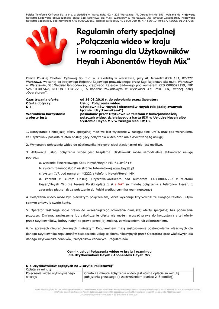 Polska Telefonia Cyfrowa Sp. z o.o. z siedzibą w Warszawie, 02 - 222 Warszawa, Al. Jerozolimskie 181, wpisana do Krajowego Rejestru Sądowego prowadzonego przez Sąd Rejonowy dla m.st. Warszawy w Warszawie, XII Wydział Gospodarczy Krajowego Rejestru Sądowego, pod numerem KRS 0000029159, kapitał zakładowy 471 000 000 zł, NIP 526-10-40-567, REGON 011417295 Regulamin oferty specjalnej „Połączenia wideo w kraju i w roamingu dla Użytkowników Heyah i Abonentów Heyah Mix” Oferta Polskiej Telefonii Cyfrowej Sp. z o. o. z siedzibą w Warszawie, przy Al. Jerozolimskich 181, 02-222 Warszawa, wpisanej do Krajowego Rejestru Sądowego prowadzonego przez Sąd Rejonowy dla m.st. Warszawy w Warszawie, XII Wydział Gospodarczy, Krajowego Rejestru Sądowego pod numerem KRS 0000029159, NIP 526-10-40-567, REGON 011417295, o kapitale zakładowym w wysokości 471 mln PLN, zwanej dalej „Operatorem”. Czas trwania oferty: Oferta dotyczy: Dla: od 16.03.2010 r. do odwołania przez Operatora Usługi Połączenia wideo Użytkowników Heyah i Abonentów Heyah Mix (dalej zwanych łącznie „Użytkownikami”) posiadanie przez Użytkownika telefonu z funkcjonalnością połączeń wideo, działającego z kartą SIM w Usłudze Heyah albo Systemie Heyah Mix w zasięgu sieci UMTS. Warunkiem korzystania z oferty jest: 1. Korzystanie z niniejszej oferty specjalnej możliwe jest wyłącznie w zasięgu sieci UMTS oraz pod warunkiem, że Użytkownik posiada telefon obsługujący połączenia wideo oraz ma aktywowaną tę usługę. 2. Wykonanie połączenia wideo do użytkownika krajowej sieci stacjonarnej nie jest możliwe. 3. Aktywacja usługi połączenia wideo jest bezpłatna. Użytkownik może samodzielnie aktywować usługę poprzez: a. wysłanie Ekspresowego Kodu Heyah/Heyah Mix *110*3*1# b. system ‘Samoobsługa’ na stronie Internetowej www.heyah.pl c. system IVR pod numerem *2222 z telefonu Heyah/Heyah Mix d. kontakt z Biurem Obsługi Użytkownika/Klienta pod numerem +48888002222 z telefonu Heyah/Heyah Mix (na terenie Polski opłata 1 zł z VAT za minutę połączenia z telefonów Heyah, z zagranicy płatne jak za połączenie do Polski według cennika roamingowego) 4. Połączenia wideo może być pierwszym połączeniem, które wykonuje Użytkownik ze swojego telefonu i tym samym aktywuje swoje konto. 5. Operator zastrzega sobie prawo do wcześniejszego odwołania niniejszej oferty specjalnej bez podawania przyczyn. Zmiana, zawieszenie lub zakończenie oferty nie może naruszać prawa do korzystania z tej oferty przez Użytkowników, którzy nabyli to prawo przed jej zmianą, zawieszeniem lub zakończeniem. 6. W sprawach nieuregulowanych niniejszym Regulaminem mają zastosowanie postanowienia właściwych dla danego Użytkownika regulaminów świadczenia usług telekomunikacyjnych przez Operatora oraz właściwych dla danego Użytkownika cenników, załączników cenowych i regulaminów. Cennik usługi Połączenia wideo w kraju i roamingu dla Użytkowników Heyah i Abonentów Heyah Mix Dla Użytkowników będących na „Taryfie Pakietowej” Opłata za minutę Połączenia wideo wykonywanego Opłata za minutę Połączenia wideo jest równa opłacie za minutę w kraju połączenia głosowego (z zastrzeżeniem punktu 2 i3 poniżej) Dokument ważny od 16.03.2010 r. ze zmianami z 1.01.2011. Sposób naliczania opłaty za Połączenie wideo jest zgodny z zasadami naliczania opłaty za minutę połączenia głosowego Połączenia wideo wykonywanego i odbieranego w roamingu a b Strefa roamingowa 1A oraz 1B – 9,90 9,98 zł z VAT Strefa roamingowa 2 oraz 3 – 14,90 15,02 zł z VAT Sposób naliczania opłaty za Połączenie wideo w roamingu jest zgodny z zasadami naliczania opłaty za minutę połączenia głosowego w danej strefie roamingowej. Dla Użytkowników będących na taryfie „Nowa Heyah” i Abonentów Heyah Mix Opłata za minutę Połączenia wideo wykonywanego Opłata za minutę Połączenia wideo jest równa opłacie za minutę w kraju na numery krajowe połączenia głosowego (z zastrzeżeniem punktu 2 i 3 poniżej) Połączenia wideo wykonywanego w kraju na numery międzynarodowe do strefy 1a oraz 1b Połączenia wideo wykonywanego w kraju na numery międzynarodowe do pozostałych stref c Połączenia wideo wykonywanego i odbieranego w roamingu a b Sposób naliczania opłaty za Połączenie wideo jest zgodny z zasadami naliczania opłaty za minutę połączenia głosowego 1,70 1,71 zł z VAT Opłata za minutę Połączenia wideo jest równa opłacie za minutę połączenia głosowego (z zastrzeżeniem punktu 2 i3 poniżej) Sposób naliczania opłaty za Połączenie wideo jest zgodny z zasadami naliczania opłaty za minutę połączenia głosowego Strefa roamingowa 1A oraz 1B – 9,90 9,98 zł z VAT Strefa roamingowa 2 oraz 3 – 14,90 15,02 zł z VAT Sposób naliczania opłaty za Połączenie wideo w roamingu jest zgodny z zasadami naliczania opłaty za minutę połączenia głosowego w danej strefie roamingowej. a) Możliwość wykonywania połączeń wideo w roamingu może być ograniczona. Lista sieci i krajów, w których można korzystać z usługi połączenie wideo w roamingu dostępna jest na stronie internetowej www.heyah.pl b) Strefy roamingowe w usługach Heyah Eurotaryfa i Strefy oraz Heyah Mix Eurotaryfa i Strefy: Strefa roamingowa 1A: Kraje Unii Europejskiej oraz inne wybrane kraje i terytoria: Austria, Azory, Belgia, Bułgaria, Cypr, Czechy, Dania, Estonia, Finlandia, Francja, Gibraltar, Grecja, Gujana Francuska, Gwadelupa, Hiszpania, Holandia, Irlandia, Islandia, Liechtenstein, Litwa, Luksemburg, Łotwa, Madera, Malta, Martynika, Niemcy, Norwegia, Portugalia, Reunion, Rumunia, Słowacja, Słowenia, Szwecja, Watykan, Węgry, Wielka Brytania, Włochy, Wyspy Kanaryjskie Strefa roamingowa 1B: Pozostałe Kraje Europejskie z wykluczeniem krajów ze Strefy roamingowej 3: Albania, Andora, Białoruś, Bośnia i Hercegowina, Chorwacja, Czarnogóra, Kosowo, Macedonia, Mołdawia,
