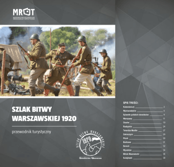 SZLAK BITWY WARSZAWSKIEJ 1920 przewodnik turystyczny SPIS TREŚCI: Kalendarium 2 Wprowadzenie 4 Sylwetki polskich dowódców 9 Warszawa 11 Ossów 19 Radzymin 24 Twierdza Modlin 27 Zakroczym 29 Płock 30 Borkowo 31 Serock 32 Wyszków 34 Mińsk Mazowiecki 36 Sulejówek 38 r Dz -Osada 2 Ossów ia Gnojno Purgałki Gleba Parciaki Krzynowłoga Wlk. Nw. Małowidz Brzozowo Wieczfnia Kośc. Świniary Kuklin Krzynowłoga Uniszki Zawadzkie Mł. Skierkowizna Jednorożec Dzierzgowo ŻUROMIN Narzym | s. 11 Iłowo| s.-Osada 19 Kęczewo Lipowiec | s. 24 Kośc. MŁAWA Dylewo Baranowo Lelis Gaczyska MŁAWA Durlasy OSTROŁĘKA ew Gąski Dąbrówka w ule Jabłonowo Warszawa 1Zieluń- ia łdó ka w Raszujka Rycice Mątwica Chmielewo a k Wieś Wlk. Napierki Om W Kisiny kw Sz Bryńsk DZIAŁDOWO Gródki Przyłęk Nick Duży ga zo Ro Wlk. Łąck a Róż BIAŁYSTOK Rydzewo Miastkowo Chojny Mł. PRZASNYSZ Rataje Szczepankowo Zabrodzie Łątczyn-Włośc. Nw. Wieś MAKÓW Garbnik Zabiele Szydłówek MAZ. SIERPC Sinogóra Zielona Osówka Drążdżewo OSTROŁĘKA Kleczkowo OlszewoZabiele Szydłowo Mchowo Str. | s. 27 4 Twierdza Modlin -Borki OSTRÓW MAZ. Wlk. Podkrajewo Wiśniewo Kępa Kuczbork Amelin PUŁTUSK ŻUROMIN Cieszki Rzekuń Zamość Grudusk Węgra o Biernaty Dzbenin Nożewo Bartniki PiegłowoZakroczymKliczewo | s. 29Str. Chodkowo- PŁOŃSK 5Poniatowo WYSZKÓW Krasnosielc Troszyn Rafały -Wieś Duże Kosiny PRZASNYSZ -Kuchny PŁOCK Pietrzyk Będzymin Czernice Stupsk SOKOŁÓW Piski Sypniewo Płock | s. 30 6 Franciszkowo Szreńsk Borowe Obrębiec Łysakowo ZAKROCZYM PODLASKI Kamianka Karwacz Kołaki LEGIONOWO Zamość TyszkiStrzałkowo PłoniawyChrapoń Dobrzankowo NOWY Sławkowo WOŁOMIN -Nadbory -Bramura WĘGRÓW 7 Borkowo StawiszynGOSTYNIN Dzwonek Golany Liberadz | s. 31 DWÓR MAZ. Morawy Lutocin Kowalewko Gąsewo Gniazdowo ŁOSICE yc -Łaziska Bogate z Poduchowne Zimolza SOCHACZEW Dąbrowa a Suchcice Czerwin Żabin Serock | s. 32 SIEDLCE 8 Młynarze N Szulmierz Wola Str. Bońkowo Szczuki BIEŻUŃ Ratowo MIŃSK MAZ. Wierzbowska Regimin PRUSZKÓW GRODZISK Września Lubotyń PniewoKośc. KrzyżewoJawory Mdzewo Węgrzynowo MAZOWIECKI Żbiki -Czeruchy -Jurki Str. 9 Wyszków OTWOCK r a | s. 34 Dzbonie k W Dyszobaba Sulęcin Radzanów Krasne Jelonki Goworowo PIASECZNO Czerwonka Szlachecki ŻYRARDÓW Ulaski Opinogóra RÓŻAN Pawłowo Włośc. czechowo | s. 36 Strzegowo10 Mińsk Mazowiecki Grn. Zaręby Wąsewo Kołaczków Załuzie Kaszewiec Giełczyn MAKÓW MAZ. -Osada Rząśnik GARWOLIN Chotum Perzanowo Rościszewo Siemiątkowo Str. Ponikiew GRÓJEC Szlach. | s. 38 11 Sulejówek CIECHANÓW Lubiejewo Duża O rz Str. Unierzyż Komorowo Rzewnie ŁÓDŹ Krzeczanowo Borkowo BIAŁOBRZEGI Grądy ZgagowoStr. Kośc. Karniewo Sielc Szyjki Gogole Wlk. Ościłowo -Wieś Tłucznice Szelków Gumowo Plewki Rogoźnia KOZIENICE Zawidz Kośc. Śródborze Dreglin Kisielewo GołyminChrzczanka Gorzewo GLINOJECK -Ośrodek Koziebrody RADOMNw. Włośc. Dzierżanowo Sarnowa yd Młock PRZYSUCHA Przeradowo Stropkowo Nagoszewka Góra Kraszewo Garnowo Lubiel ZWOLEŃ LUBLIN Duże Goleszyn Długosiadło Marianowo RACIĄŻ Sońsk Luberadz Nagoszewo Lipa SZYDŁOWIEC Słupia wko Malużyn Ojrzeń Kozłówka Zambski Blochy Dybki Gromin k Kośc. Bądkowo Drozdowo Gzy LIPSKO DROBIN Szyszki Obryte Lelice Gąsocin Kleszewo Rząśnik BROK Porządzie PUŁTUSK Psary Tupadły dowo Łęg Gąsiorowo Gralewo Raciążn Bonisław Probostwo ica Poręba-Kocęby Galomin Karolinowo Gładczyn Kozłowo MAZOWSZE. Dziś – serce Polski, w okresie kształtowania się Rzeczpospolitej przez ponad trzy stulecia Sochocin Kacice Rządowy Świercze Strzegocin Baboszewo Szymaki Trzcianka Golądkowo Sadowne – odrębne państwo. W centrum regionu tętni wielkomiejskim rytmem Warszawa, wokół której rozciąga Nw. Wielątki Bielsk Nw. Cieńsza Szczawin Sędek Brańszczyk Góra Miasto Szynkarzyna Zągoty się kraina wciąż nie do końca odkryta. Na turystów czekają tajemnicze zamki i szlacheckie dwory, zaKołoząb Winnica Dzierżążnia PŁOŃSK Turzyn WYSZKÓW Zatory Pokrzywnica Staroźreby Świerkowo bytkowe świątynie i urokliwe miasteczka, pola dawnych bitew i krajobrazy, których różnorodność od lat Kamieńczyk Str. Zdziebórz Joniec Ciółkowo Goślice Rogowo NASIELSK Biała Siedlin Ug o sz przyciąga filmowców. Cały ten świat to olbrzymi skarbiec historyczny, kulturowy i przyrodniczy. Wystarczy Nw. Błędostwo c z Sarnowo Cieksyn Ogrodniki Dzierżenin Str. Szczytno Gwizdały stanąć u jego granic i wypowiedzieć zaklęcie: Mazowsze, otwórz się. A później wejść i podążyć wybranym Nw. Somianka Radzanowo Pieścirogi Majdan Strachów PŁOCK Wola Wierzbica Przyborowice w Bug Popowo Borkowo ŁOCHÓW szlakiem. Bulkowo ka Smolana Blichowo Kośc. Cegielnia Kamionna Sosenkowo Urle Niegów Psucka SEROCK Krysk Kania Polska Wólka Ramutowo Załuski Borowiczki Paplińska Naruszewo Zabrodzie Jadów Zawiszyn Janowo Kikoły Dzierżanowo Paplin Oto SZLAK BITWY WARSZAWSKIEJ 1920 – wyprawa w nieodległą przeszłość, niespełna sto lat wstecz, Jadwisin Dębe Dąbrówka Słupno Mokra Wieś Trojany Bodzanów w Rowiska r e Pomiechówek a Nowinki Kroczewo N Zegrze Borzychy w czasy kiedy decydowała się przyszłość Polski, a także całej Europy. Brytyjski polityk i dyplomata Edgar Dobrzyków Kozły Kobylniki Skrzeszew Wola J. Zegrzyńskie Strachówka D’Abernon uznał Bitwę Warszawską za 18. przełomową bitwę w dziejach świata. Podczas trzech dni Rasztowska Mł. Wieś Korytnica Wi Przybójewo TŁUSZCZ ZAKROCZYM NW. DWÓR MAZ. Wieliszew sła Kępa Białobrzegi sierpnia 1920 r. polska armia powstrzymała pochód rewolucji bolszewickiej na Zachód. Patrząc na pola Jasienica RADZYMIN Trawy Brody Duże Nieporęt Polska Chylin Twierdza Modlin Rębowo Chociszewo Goławin LEGIONOWO Michałówrz bitew w Ossowie czy Radzyminie, miejsca pamięci w Warszawie, fortyfikacje Twierdzy Modlin, trudno Klembów Miąse WymyśleNw. -Reginów Roguszyn Zamostki Czerwińsk -Pole Gr
