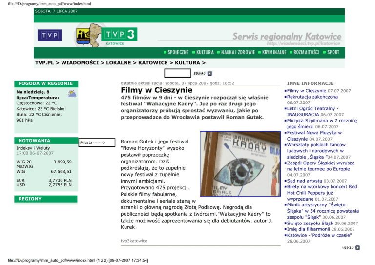 file:///D|/programy/imm_auto_pdf/www/index.html SOBOTA, 7 LIPCA 2007 TVP.PL > WIADOMOŚCI > LOKALNE > KATOWICE > KULTURA > POGODA W REGIONIE ostatnia aktualizacja: sobota, 07 lipca 2007 godz. 18:52 Filmy w Cieszynie Na niedzielę, 8 lipca:Temperatura: Częstochowa: 22 °C Katowice: 23 °C BielskoBiała: 22 °C Ciśnienie: 981 hPa NOTOWANIA Miasta -------> Indeksy i Waluty 17:00 06-07-2007 WIG 20 MIDWIG WIG EUR USD REGIONY 475 filmów w 9 dni - w Cieszynie rozpoczął się właśnie festiwal "Wakacyjne Kadry". Już po raz drugi jego organizatorzy próbują sprostać wyzwaniu, jakie po przeprowadzce do Wrocławia postawił Roman Gutek. 3.899,59 67.568,51 3,7730 PLN 2,7755 PLN Roman Gutek i jego festiwal "Nowe Horyzonty" wysoko postawił poprzeczkę organizatorom. Dziś podkreślają, że to zupełnie nowy festiwal z zupełnie innymi ambicjami. Przygotowano 475 projekcji. Polskie filmy fabularne, dokumentalne i seriale staną w szranki o główną nagrodę Złotą Podkowę. Nagrodą dla publiczności będą spotkania z twórcami."Wakacyjne Kadry" to także możliwość zaprezentowania się dla debiutantów. autor J. Kurek tvp3katowice file:///D|/programy/imm_auto_pdf/www/index.html (1 z 2) [09-07-2007 17:34:54] INNE INFORMACJE Filmy w Cieszynie 07.07.2007 Rekrutacja zakończona 06.07.2007 Letni Ogród Teatralny INAUGURACJA 06.07.2007 Muzyka Szpilmana w 7 rocznicę jego śmierci 06.07.2007 Festiwal Nowa Muzyka w Cieszynie 04.07.2007 Warsztaty polskich tańców ludowych i narodowych w siedzibie „Śląska ”04.07.2007 Zespół Opery Śląskiej wyrusza na letnie tournee po Europie 04.07.2007 Sąd nad artystą 03.07.2007 Bilety na wtorkowy koncert Red Hot Chili Peppers już wyprzedane 01.07.2007 Piknik artystyczny "Święto Śląska" w 54 rocznicę powstania zespołu "Śląsk" 30.06.2007 Święto zespołu Śląsk 29.06.2007 Imię dla filharmonii 28.06.2007 Katowice -"Podróże w czasie" 28.06.2007