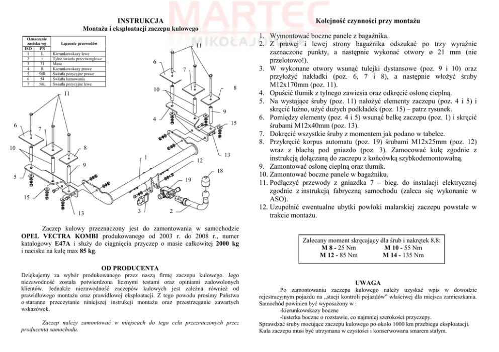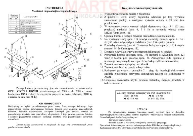 INSTRUKCJA Kolejność czynności przy montaŜu MontaŜu i eksploatacji zaczepu kulowego Oznaczenie zacisku wg ISO PN 1 L 2 + 3 31 4 R 5 58R 6 54 7 58L Łączenie przewodów 11 Kierunkowskazy lewe Tylne światła przeciwmgłowe Masa Kierunkowskazy prawe Światła pozycyjne prawe Światła hamowania Światła pozycyjne lewe 6 7 8 10 11 9 4 6 15 7 8 10 13 1 12 9 18 5 19 15 13 3 2 Zaczep kulowy przeznaczony jest do zamontowania w samochodzie OPEL VECTRA KOMBI produkowanego od 2003 r. do 2008 r., numer katalogowy E47A i słuŜy do ciągnięcia przyczep o masie całkowitej 2000 kg i nacisku na kulę max 85 kg. 1. Wymontować boczne panele z bagaŜnika. 2. Z prawej i lewej strony bagaŜnika odszukać po trzy wyraźnie zaznaczone punkty, a następnie wykonać otwory ø 21 mm (nie przelotowo!). 3. W wykonane otwory wsunąć tulejki dystansowe (poz. 9 i 10) oraz przyłoŜyć nakładki (poz. 6, 7 i 8), a następnie włoŜyć śruby M12x170mm (poz. 11). 4. Opuścić tłumik z tylnego zawiesia oraz odkręcić osłonę cieplną. 5. Na wystające śruby (poz. 11) nałoŜyć elementy zaczepu (poz. 4 i 5) i skręcić luźno, uŜyć duŜych podkładek (poz. 15) – patrz rysunek. 6. Pomiędzy elementy (poz. 4 i 5) wsunąć belkę zaczepu (poz. 1) i skręcić śrubami M12x40mm (poz. 13). 7. Dokręcić wszystkie śruby z momentem jak podano w tabelce. 8. Przykręcić korpus automatu (poz. 19) śrubami M12x25mm (poz. 12) wraz z blachą pod gniazdo (poz. 3). Zamocować kulę zgodnie z instrukcją dołączaną do zaczepu z końcówką szybkodemontowalną. 9. Zamontować osłonę cieplną oraz tłumik. 10. Zamontować boczne panele w bagaŜniku. 11. Podłączyć przewody z gniazdka 7 – bieg. do instalacji elektrycznej zgodnie z instrukcją fabryczną samochodu (zaleca się wykonanie w ASO). 12. Uzupełnić ewentualne ubytki powłoki malarskiej zaczepu powstałe w trakcie montaŜu. Zalecany moment skręcający dla śrub i nakrętek 8,8: M 8 - 25 Nm M 10 - 55 Nm M 12 - 85 Nm M 14 - 135 Nm OD PRODUCENTA Dziękujemy za wybór produkowanego przez naszą firmę zaczepu kulowego. Jego niezawodność została potwierdzona licznymi testami oraz opiniami zadowolonych klientów. JednakŜe niezawodność zaczepów kulowych jest zaleŜna równieŜ od prawidłowego montaŜu oraz prawidłowej eksploatacji. Z tego powodu prosimy Państwa o staranne przeczytanie niniejszej instrukcji montaŜu oraz przestrzeganie zawartych wskazówek. Zaczep naleŜy zamontować w miejscach do tego celu przeznaczonych przez producenta samochodu. UWAGA Po zamontowaniu zaczepu kulowego naleŜy uzyskać wpis w dowodzie rejestracyjnym pojazdu na „stacji kontroli pojazdów” właściwej dla miejsca zamieszkania. Samochód powinien być wyposaŜony w : -kierunkowskazy boczne -lusterka boczne o rozstawie, co najmniej szerokości przyczepy. Sprawdzać śruby mocujące zaczepu kulowego po około 1000 km przebiegu eksploatacji. Kula zaczepu musi być utrzymana w czystości i konserwowana smarem stałym. PPUH AUTO-HAK S. J. WyposaŜenie zaczepu: Produkcja Zaczepów Kulowych Henryk & Zbigniew Nejman 76-200 SŁUPSK ul. Słoneczna 16K tel/fax (059) 8-414-414; 8-414-413 E-mail: [email protected] www.autohak.com.pl Zaczep kulowy bez wyposaŜenia elektrycznego E47A Klasa: A50-X Nr kat. Przeznaczony do zamontowania w samochodzie: Producent: OPEL Model: VECTRA Typ: KOMBI produkowanego od 2003r. do 2008r. Dane techniczne: Wartość siły D : 10,7 kN maksymalna masa przyczepy: 2000 kg maksymalny nacisk na kulę: 85 kg Numer homologacji zgodnie z Dyrektywą 94/20/WE: e20*94/20*0021*01 KARTA GWARANCYJNA Producent udziela gwarancji niniejszą kartą gwarancyjną na okres 24 miesięcy licząc od dnia zakupu zaczepu kulowego do samochodu: OPEL VECTRA KOMBI produkowanego od 2003r. do 2008r. Data produkcji .............................. Data zakupu.................................. Zakres gwarancji obejmuje wyłącznie wady jakościowe wynikające z winy producenta. Gwarancja nie obejmuje natomiast uszkodzeń zawinionych przez nabywcę, wynikających z niewłaściwego montaŜu, uŜytkowania lub konserwacji, uszkodzeń mechanicznych, normalnego zuŜycia podczas eksploatacji itp. Gwarancja udzielona na zakupiony towar nie wyłącza, nie ogranicza ani nie zawiesza uprawnień kupującego wynikających z niezgodności towaru z umową. Reklamacje naleŜy zgłaszać w punkcie sprzedaŜy, składając jednocześnie kartę gwarancyjną. Usunięcie "wady" następuje po stwierdzeniu przez punkt sprzedaŜy wspólnie z producentem słuszności złoŜonej reklamacji. Reklamacja powinna być załatwiona w ciągu czternastu dni od dnia uznania reklamacji. Karta gwarancyjna jest niewaŜna jeŜeli nie jest wypełniona i podpisana. Data zgłoszenia reklamacji: ................................................................... INFORMACJA WSTĘPNA Zaczep kulowy jest skonstruowany zgodnie z zasadami bezpieczeństwa ruchu drogowego. Zaczep kulowy jest elementem wpływającym na bezpieczeństwo jazdy i moŜe zostać zainstalowany wyłącznie przez personel wyspecjalizowany. Niedopuszczalne jest dokonywanie jakichkolwiek zmian w konstrukcji zaczepu. Powoduje to wygaśniecie dopuszczenia do stosowania. W przypadku obecności masy izolacyjnej lub osłony podwozia w miejscu przylegania zaczepu, naleŜy ją usunąć. Nieosłonięte miejsca karoserii oraz wywiercone otwory naleŜy pomalować farbą antykorozyjną. Informacjami wiąŜącymi odnośnie wartości obciąŜeń są dane podawane przez producenta samochodu, względnie wartości maksymalnej masy przyczepy oraz maksymalnego nacisku na kulę, przy czym wartości parametrów zaczepu kulowego nie mogą być przekroczone. Wzór do obliczania wartości siły D: Maks. masa przyczepy [kg] x Masa całkowita samochodu [kg] 9,81 = X + 1000 Maks. masa przyczepy [kg] + Masa całkowita samochodu [kg] + D [kN]