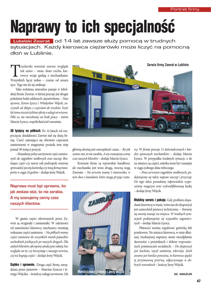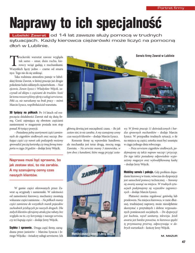 Portret firmy Naprawy to ich specjalność Lubelski Zawrat od 14 lat zawsze służy pomocą w trudnych sytuacjach. Każdy kierowca ciężarówki może liczyć na pomocną dłoń w Lublinie. T Serwis firmy Zawrat w Lublinie ruckerski warsztat zawsze wygląda tak samo – smar, dużo ruchu, kierowcy wciąż gadają z mechanikami. Wszystkich łączy jedno – czarne od smaru ręce. Tego nie da się uniknąć. Taka rodzinna atmosfera panuje w lubelskiej firmie Zawrat, w której pracuje już drugie pokolenie ludzi oddanych ciężarówkom. – Nasi ojcowie, Zenon Łyszcz i Władysław Wójcik, zaczynali od sklepu z częściami do trucków. Sześć lat temu rozszerzyliśmy ofertę o usługi serwisowe. Póki co, nie narzekamy na brak pracy – mówi Marcin Łyszcz, współwłaściciel warsztatu. 30 tysięcy na półkach. Po 14 latach od rozpoczęcia działalności Zawrat stał się dużą firmą. Cześć zajmująca się obrotem częściami zamiennymi w magazynie posiada non stop ponad 30 tysięcy pozycji. – Posiadamy pełny asortyment części zamiennych do ciągników siodłowych oraz naczep. Brakujące części czy nawet całe podzespoły możemy sprowadzić pocztą kurierską czy inną formą transportu w ciągu 24 godzin – dodaje Jerzy Wójcik. główną dewizą jest oszczędność czasu. – Bo jak zestaw stoi, to nie zarabia. A my szanujemy cenny czas naszych klientów – dodaje Marcin Łyszcz. Korzenie firmy są wprawdzie handlowe, ale mechanika jest teraz drugą, mocną nogą Zawratu. – Na serwisie mamy 3 stanowiska, w tym dwa z kanałami, które mogą przyjąć zesta- Naprawa musi być sprawna, bo jak zestaw stoi, to nie zarabia. A my szanujemy cenny czas naszych klientów. Mobilny serwis i pokoje. Gdy problem dopadanie kierowcę w trasie, wówczas do dyspozycji jest samochód pomocy technicznej. – Staramy się awarię usunąć na miejscu. W trudnych sytuacjach podejmujemy się wyjazdów zagranicznych – dodaje Marcin Łyszcz. Płatności można regulować gotówką lub przelewem. Na miejscu kierowca, w razie dłuższej, trudniejszej naprawy, może nieodpłatnie skorzystać z przytulnych i dobrze wyposażonych pomieszczeń socjalnych. – Do dyspozycji jest kuchnia, węzeł sanitarny, telewizja. Jeżeli awaria jest bardzo poważna, to kierowca spędzi tę przymusową przerwę, odpoczywając w dobrych warunkach – kończy Jerzy Wójcik. W gamie części oferowanych przez Zawrat są oryginały i zamienniki. W zależności od zamożności kierowcy, mechanicy montują wskazane części zamienne. – Na półkach mamy części zamienne do wszystkich marek pojazdów zachodnich jeżdżących po naszych drogach. Dla stałych klientów oferujemy atrakcyjne rabaty, bez względu na to, czy korzystają z naszego serwisu, czy też kupują części – dodaje Jerzy Wójcik. Szybko i sprawnie. Druga część firmy, zarządzana przez juniorów – Marcina Łyszcza i Jerzego Wójcika – świadczy usługi serwisowe. Ich wy. W firmie pracuje 11 doświadczonych i bardzo sprawnych mechaników – dodaje Marcin Łyszcz. W przypadku trudnych sytuacji, o ile na miejscu są części, usterka musi być usunięta w ciągu jednego dnia roboczego. – Poza serwisem ciągników siodłowych, podejmujemy się także napraw naczep i przyczep. Do tego także posiadamy odpowiednio wyposażony magazyn oraz wykwalifikowaną kadrę – dodaje Jerzy Wójcik. Marcin Łyszcz (z lewej) i Jerzy Wójcik M. Mazur 47