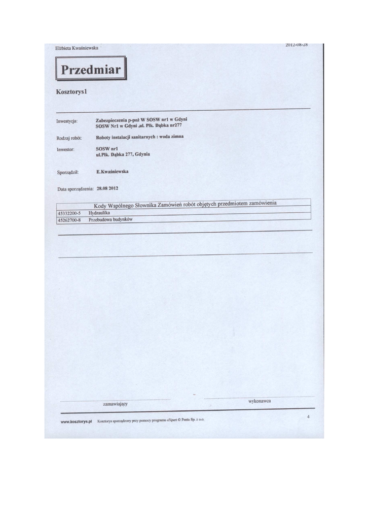 -1- Charakterystyka robót SOSW NR1 przy ul. Płk. Dąbka 277 w Gdyni INSTALACJE WODOCIĄGOWE P.POś.-hydranty wewnętrzne 1. STAN ISTNIEJĄCY W chwili obecnej dla potrzeb zewnętrznego gaszenia poŜaru przy ul. Płk. Dąbka w odległości ca 20m i ca 70m od budynku usytuowane są hydranty podziemneD80. Ponadto hydranty podziemne D80 usytuowane są przy ul Kwiatkowskiego (w odl. ca 150m) oraz przy pawilonach w odległości ca 80m.na terenie W budynku SOSW nr1 brak jest wewnętrznej instalacji hydrantowej – potrzeby p.poŜ. zabezpieczone są wyłącznie gaśnicami pianowymi usytuowanymi w w korytarzu. Budynek wyposaŜony jest w instalację wodociągową – przyłącze wody D40 wprowadzone jest do piwnicy i posiada wodomierz IS-3,5,- Dn25 o charakterystyce: - przepływ nominalny Qn = 3,5m3/h,- przepływ maksymalny Qmax=7,0m3/h W budynku instalacja wody zimnej wykonana jest z rur stalowych ocynkowanych – główny poziom D40 biegnie przez pomieszczenia piwnicy oraz w kanale (pom. kuchni). 2. ROZWIĄZANIA TECHNICZNE Przepływ p.poŜ. - maksymalny –przy czynnych 2-u hydrantach D-25 równocześnie; Qp.poŜ = 2x 1,0 = 2,-l/s ( 7,2 m3/h ) Wodomierz główny-istniejący:IS3,5, DN25 zabezpiecza zasadniczo potrzeby p.poŜ. Instalację p.poŜ. projektuje się z rur stalowych ocynkowanych łączonych przez skręcanie o średnicy Dn32,Dn25 mm. Instalację hydrantową naleŜy prowadzić po wierzchu ścian – patrz część rysunkowa. Projektuje się szafki hydrantowe –szt.4 zintegrowane z gaśnicą 6kg. WyposaŜenie szafki wnękowej (W) lub zewnętrznej (Z) zgodnie z PN-EN671-1(W -25/30G w : o wymiarach 1050x700x250mm ( lub 900x700x250mm –w przypadku szafek firmy SUPRON): • zawór hydrantowy D25, • prądownicę o średnicy wylotu 6mm, • bęben oraz wąŜ półsztywny dł.30m. Wysokość zaworu hydrantowego w szafce =1,35m od posadzki. Miejsce ustawienia szafek hydrantowych oznakować znakiem bezpieczeństwa ,,hydrant wewnętrzny”. Uwaga; w projekcie przewidziano 2 szafki zewnętrzne (piwnica ,parter) oraz 2 szafki wnękowe ( parter przy sali gimnastycznej oraz piętro). -2- Szafkę na piętrze wychodzącą na salę lekcyjną wkomponować w istniejącą zabudowę meblową. 3. ODBIÓR ROBÓT ,UWAGI -Odbiór robót naleŜy przeprowadzić przy udziale Zarządcy budynku - Sprawdzenie szczelności , wydajności wodnej ( przy ciśnieniu nie mniejszym niŜ 1,0 Mpa),podłączenia węŜy i rozwinięcia linii gaśniczej naleŜy wykonać przy udziale specjalistycznej firmy posiadającej odpowiednie uprawnienia oraz przedstawicieli StraŜy PoŜarnej – sporządzić odpowiedni protokół. -Odbiór instalacji winien być wykonany w oparciu o warunki techniczne wykonania i odbiory robót budowlano-montaŜowych cz.II - ,, Instalacje sanitarne i przemysłowe''. Przedmiar robót-SOSW nr1 w Gdyni Lp. Nr specyfikacji technicznej Wyszczególnienie elementów rozliczeniowych 1 3 4 Jednostka Nazwa Ilość 5 6 Cena jednostkowa Wartość 7 8 1. Roboty instalacyjne 1.1. Instalacje wody zimnej - hydrantowe 1.1.1 SST-IS1 Rurociągi stalowe ocynkowane o 100 m połączeniach gwintowanych, na ścianach w budynkach niemieszkalnych rurociąg o średnicy nominalnej 25 mm. 0,6 0,00 1.1.2 SST-IS1 Rurociągi stalowe D32ocynkowane o 100 m połączeniach gwintowanych, na ścianach w budynkach niemieszkalnych rurociąg o średnicy nominalnej 32 mm. 0,1 0,00 1.1.3 SST-IS1 Wstawienie trójnika z Ŝeliwa ciągliwego ocynkowanego o średnicy 40 mm. 1 0,00 1.1.4 SST-IS1 Zawory przelotowe z połączeniem na 10 szt. dwuzłączkę zawór o średnicy nominalnej 32 mm. 0,1 0,00 1.1.5 SST-IS1 Szafka hydrantowa naścienna szt. 1050x700x250mm wraz zwyposaŜeniem wg dokumentacji (prądownica D25, wąŜ półsztywny l=30m ,zwijacz +gaśnica) 2 0,00 szt. 1.1.6 SST-IS1 Szafka hydrantowa wnękowa szt. 1050x700x250mm wraz zwyposaŜeniem wg dokumentacji (prądownica D25, wąŜ półsztywny l=30m ,zwijacz +gaśnica) 2 0,00 1.1.7 SST-IS1 Próba szczelności instalacji 100 m wodociągowych z rur Ŝeliwnych, stalowych, miedzianych próba instalacji w budynkach niemieszkalnych, rurociąg o średnicy 65 mm. 0,8 0,00 1.1.8 SST-IS1 Próba instalacji hydrantowej wraz ze próba sprawdzeniem wydajności wodnej i rozwinięciem linii gaśniczej przy udziale specjalistycznej firmy-analogia. 4 0,00 1.1.9 SST-IS1 Płukanie instalacji wodociągowej płukanie instalacji wodociągowej w budynkach niemieszkalnych. 80 0,00 m 1.2. Przekucia, roboty budowlane 1.2.1 SST-IS1 Przebicie otworów o grubości 40 cm w elementach z betonu Ŝwirowego o powierzchni do 0,05 m2 szt. 5 0,00 1.2.2 SST-IS1 Zabetonowanie powierzchni otworów do szt. 0,1 m2 przy głębokości ponad 10 cm w stropach i ścianach, przy uŜyciu Ŝurawia okiennego. 5 0,00 1.2.3 SST-IS1 Wykucie otworów na skrzynki hydrantowe w ścianach z cegieł o grubości ponad 1/2 cegły na zaprawie cementowej. m3 0,4 0,00 1.2.4 SST-IS1 Zabetonowanie powierzchni otworów do szt. 0,1 m2 przy głębokości ponad 10 cm w przy uŜyciu Ŝurawia okiennego. 2 0,00 1.2.5 SST-IS1 Wywóz śmieci na wysypisko.-kontener 3,5t 1 0,00 Razem : kurs 0,00
