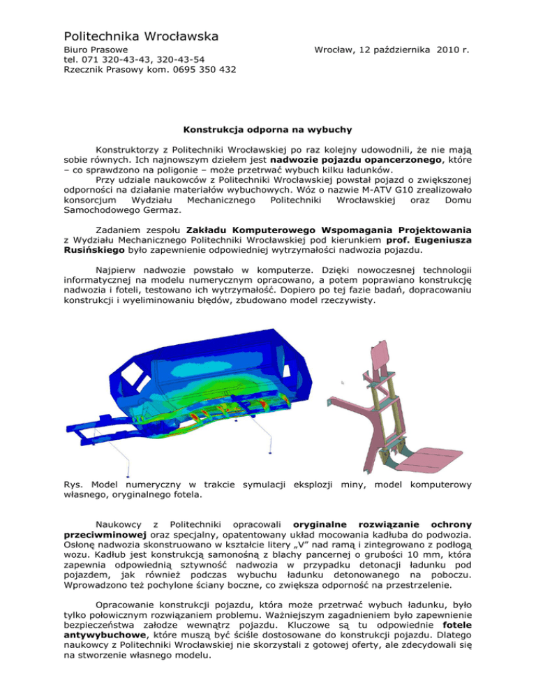 Politechnika Wrocławska Biuro Prasowe tel. 071 320-43-43, 320-43-54 Rzecznik Prasowy kom. 0695 350 432 Wrocław, 12 października 2010 r. Konstrukcja odporna na wybuchy Konstruktorzy z Politechniki Wrocławskiej po raz kolejny udowodnili, że nie mają sobie równych. Ich najnowszym dziełem jest nadwozie pojazdu opancerzonego, które – co sprawdzono na poligonie – może przetrwać wybuch kilku ładunków. Przy udziale naukowców z Politechniki Wrocławskiej powstał pojazd o zwiększonej odporności na działanie materiałów wybuchowych. Wóz o nazwie M-ATV G10 zrealizowało konsorcjum Wydziału Mechanicznego Politechniki Wrocławskiej oraz Domu Samochodowego Germaz. Zadaniem zespołu Zakładu Komputerowego Wspomagania Projektowania z Wydziału Mechanicznego Politechniki Wrocławskiej pod kierunkiem prof. Eugeniusza Rusińskiego było zapewnienie odpowiedniej wytrzymałości nadwozia pojazdu. Najpierw nadwozie powstało w komputerze. Dzięki nowoczesnej technologii informatycznej na modelu numerycznym opracowano, a potem poprawiano konstrukcję nadwozia i foteli, testowano ich wytrzymałość. Dopiero po tej fazie badań, dopracowaniu konstrukcji i wyeliminowaniu błędów, zbudowano model rzeczywisty. Rys. Model numeryczny w trakcie symulacji eksplozji miny, model komputerowy własnego, oryginalnego fotela. Naukowcy z Politechniki opracowali oryginalne rozwiązanie ochrony przeciwminowej oraz specjalny, opatentowany układ mocowania kadłuba do podwozia. Osłonę nadwozia skonstruowano w kształcie litery „V” nad ramą i zintegrowano z podłogą wozu. Kadłub jest konstrukcją samonośną z blachy pancernej o grubości 10 mm, która zapewnia odpowiednią sztywność nadwozia w przypadku detonacji ładunku pod pojazdem, jak również podczas wybuchu ładunku detonowanego na poboczu. Wprowadzono też pochylone ściany boczne, co zwiększa odporność na przestrzelenie. Opracowanie konstrukcji pojazdu, która może przetrwać wybuch ładunku, było tylko połowicznym rozwiązaniem problemu. Ważniejszym zagadnieniem było zapewnienie bezpieczeństwa załodze wewnątrz pojazdu. Kluczowe są tu odpowiednie fotele antywybuchowe, które muszą być ściśle dostosowane do konstrukcji pojazdu. Dlatego naukowcy z Politechniki Wrocławskiej nie skorzystali z gotowej oferty, ale zdecydowali się na stworzenie własnego modelu. Politechnika Wrocławska Fotel został wyposażony w 4-punktowe pasy bezpieczeństwa oraz układ pochłaniający energię podczas eksplozji. Podobnie jak w przypadku nadwozia testy przeprowadzono najpierw na modelu numerycznym. Dodatkowym efektem opracowania własnej konstrukcji foteli było zwiększenie funkcjonalności wnętrza pojazdu. Fotele mocowane są w tylnej części kabiny, na specjalnych szynach. Dzięki temu łatwa jest zmiana położenia każdego fotela lub ich demontaż. Układ szyn mocujących pozwala na zamontowanie zamiast foteli innych elementów wyposażenia, np. noszy do przewożenia rannych. Montaż foteli na szynach zamocowanych do ścian bocznych zwiększa też bezpieczeństwo (podwozie najszybciej w przypadku wybuchu ulega zniszczeniu). Po przeprowadzeniu analiz i symulacji komputerowych przyszedł czas na wykonanie prototypu pojazdu i przetestowanie go na poligonie. Pojazd, fotel i manekina, którego posadzono wewnątrz, wyposażono w czujniki rejestrujące przebieg i efekty próby. Fot. Próby na poligonie: manekin we wnętrzu pojazdu, wybuch ładunków. W czasie testów poligonowych zdetonowano w newralgicznych miejscach pod podwoziem, cztery ładunki wybuchowe od masie 10kg TNT. Podwozie pojazdu uległo zniszczeniu, ale nadwozie wytrzymało wszystkie próby bez widocznych śladów uszkodzeń. O jego odporności może świadczyć fakt, że egzemplarz nadwozia poddany próbom poligonowym został wystawiony na międzynarodowych targach przemysłu obronnego MSPO 2010 w Kielcach. Wóz z nadwoziem skonstruowanym przez naukowców z Politechniki jest do obejrzenia i sfotografowania po wcześniejszym umówieniu się. Informacji w tej sprawie udziela dr inż. Tadeusz Lewandowski, mail: [email protected], tel. 71/320-24-65, kom. 605-959-516. *** Pojazd powstał na podwoziu terenowego Mercedesa, używanego w wojsku. Pojemność silnika: 4,8 l. Liczba osób: 2+8 Informacje dla mediów umieszczane są na stronie: http://www.portal.pwr.wroc.pl/komunikaty_prasowe,241.dhtml