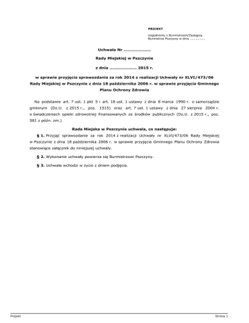 PROJEKT Uzgodniony z Burmistrzem/Zastępcą Burmistrza Pszczyny w dniu .............. Uchwała Nr .................... Rady Miejskiej w Pszczynie z dnia .................... 2015 r. w sprawie przyjęcia sprawozdania za rok 2014 z realizacji Uchwały nr XLVI/473/06 Rady Miejskiej w Pszczynie z dnia 18 października 2006 r. w sprawie przyjęcia Gminnego Planu Ochrony Zdrowia Na podstawie art. 7 ust. 1 pkt 5 i art. 18 ust. 1 ustawy z dnia 8 marca 1990 r. o samorządzie gminnym (Dz.U. z 2015 r., poz. 1515) oraz art. 7 ust. 1 ustawy z dnia 27 sierpnia 2004 r. o świadczeniach opieki zdrowotnej finansowanych ze środków publicznych (Dz.U. z 2015 r., poz. 581 z późn. zm.) Rada Miejska w Pszczynie uchwala, co następuje: § 1. Przyjąć sprawozdanie za rok 2014 z realizacji Uchwały nr XLVI/473/06 Rady Miejskiej w Pszczynie z dnia 18 października 2006 r. w sprawie przyjęcia Gminnego Planu Ochrony Zdrowia stanowiące załącznik do niniejszej uchwały. § 2. Wykonanie uchwały powierza się Burmistrzowi Pszczyny. § 3. Uchwała wchodzi w życie z dniem podjęcia. Projekt Strona 1 Uzasadnienie Zgodnie z zapisem w Gminnym Planie Ochrony Zdrowia istnieje obowiązek corocznego sporządzenia opracowania na temat działań przeprowadzonych w ramach planu. Sprawozdanie ma zostać sporządzone w formie liczbowej i opisowej wraz z wnioskami. Niniejsze sprawozdanie jest realizacją powyższego zapisu. Projekt Strona 2 Załącznik do Uchwały Nr .................... Rady Miejskiej w Pszczynie z dnia....................2015 r. SPRAWOZDANIE z realizacji w 2014 r. Uchwały nr XLVI/473/06 Rady Miejskiej w Pszczynie z dnia 18 października 2006 r. w sprawie przyjęcia Gminnego Planu Ochrony Zdrowia. ROZDZIAŁ 1. REALIZACJA W 2014 R. GMINNEGO PLANU OCHRONY ZDROWIA (GPOZ) § 1. Podstawowym założeniem programowym GPOZ jest podniesienie zdrowia mieszkańców gminy i zmiana świadomości zdrowotnej poprzez stworzenie infrastruktury technicznej oraz wdrożenie długookresowych programów profilaktycznych i informacyjnych. § 2. Zgodnie z zapisem art. 7 ustawy z dnia 27 sierpnia 2004 r. o świadczeniach opieki zdrowotnej finansowanych ze środków publicznych (Dz.U. z 2015 r., poz. 581 z późn. zm.) do zadań własnych gminy w zakresie zapewnienia równego dostępu do świadczeń opieki zdrowotnej należy m. in. opracowywanie i realizacja oraz ocena efektów programów zdrowotnych wynikających z rozpoznanych potrzeb zdrowotnych i stanu zdrowia mieszkańców gminy. Wyznaczenie jednoznacznych kierunków działań rozwoju opieki zdrowotnej na terenie naszej gminy nastąpiło w Gminnym Planie Ochrony Zdrowia przyjętym Uchwałą nr XVLI/473/06 Rady Miejskiej w Pszczynie z dnia 18 października 2006 r. Realizując zapis powyższej ustawy i przyjętego Gminnego Planu Ochrony Zdrowia, Rada Miejska w Pszczynie podjęła 26 sierpnia 2010 r. uchwałę w sprawie przyjęcia Gminnego Programu Profilaktyki i Promocji Zdrowia na lata 2010 - 2014 r., w ramach którego mają być realizowane następujące programy w zakresie profilaktyki zdrowotnej: 1. Program – Przesiewowe Badania Wad Postawy u Dzieci na lata 2010 – 2014, 2. Program Profilaktyki Przerostu Prostaty na lata 2010 - 2014, 3. Program Profilaktyki i Wczesnego Wykrywania Nowotworów Płuc, Gruźlicy i Pylicy Płuc na lata 2010-2014. § 3. Główne podmioty realizujące Gminny Plan Ochrony Zdrowia w 2014 r.: 1. Referat Zdrowia, 2. Referat Rozwoju i Funduszy Europejskich, 3. Miejski Ośrodek Rekreacji i Sportu. § 4. Realizacja w 2014 r. zadań Gminnego Planu Ochrony Zdrowia w poszczególnych wydziałach i jednostkach organizacyjnych Gminy Pszczyna przedstawiała się następująco: 1. REFERAT ZDROWIA 1) Dział 851 Ochrona zdrowia, rozdział 85149 Programy polityki zdrowotnej. W 2013 r. w wyniku przeprowadzonych postępowań konkursowych w trybie art. 48 ustawy zdrowotnej zawarto umowy na realizację poniższych programów zdrowotnych: Projekt Strona 3 a) Program – Przesiewowe Badania Wad Postawy u Dzieci na lata 2010 – 2014. Koszt programu w 2014 r.: zaplanowano - 8.000,00 zł, według zawartej umowy – 7.961,90 zł, wykonano – 4.830,70 zł. Celem programu było przeprowadzenie badań przesiewowych w celu wykrycia wad postawy u dzieci w wieku szkolnym. Populacja badana – dzieci w wieku 7 i 8 lat z terenu gminy Pszczyna. Populacja tych dzieci wynosiła 583 siedmiolatków i 190 ośmiolatków nie objętych badaniem w 2013 r., łącznie 773 dzieci. Badaniem metodą oglądową, palpacyjnie, przez lekarza ortopedę, z wykorzystaniem tablic do badań postawy ciała, objęto 469 dzieci (pozostałe dzieci były nieobecne w szkole w dniu badania lub rodzice nie wyrazili zgody na przeprowadzenie badania). Stwierdzono: Kręgosłup Klatka piersiowa Barki Łopatki Opis wykrytych wad skoliozy utrwalone, podejrzenie skoliozy obserwacja lejkowata, plecy okrągłe, płaskie plecy asymetria barków – do diagnostyki odstające – do diagnostyki asymetria – do diagnostyki Ilość wykrytych wad 330 266 325 364 Miednica Kolana Stopy przodopoch ylenie miednicy koślawość kolan, szpotowat e podudzia koślawość stopy, stopa płaskokoślawa, płaskostopie poprzeczne, wady rozwojowe 294 352 406 Rodzice dzieci, którym wykonano badanie otrzymali wyniki badań oraz zalecenia co do dalszego postępowania. b) Program Profilaktyki Przerostu Prostaty na lata 2010 - 2014. Koszt programu w 2014 r.: plan – 3.160,00 zł, według zawartej umowy – 3.151,00 zł, wykonano 1.656,00 zł. Celem programu było obniżenie zachorowań i umieralności mieszkańców gminy z powodu nowotworów złośliwych prostaty poprzez wczesne wykrywanie choroby. Populacja badana – mężczyźni - mieszkańcy gminy Pszczyna, powyżej 45 r. ż. Osoby zainteresowane badaniami zgłaszały się bez skierowań od lekarza p. o. z. W wyniku przeprowadzonego u 144 mężczyzn, przesiewowego badania PSA w 13 przypadkach stwierdzono istotnie podwyższony poziom PSA, (9,03 % ogółem przebadanych), kwalifikujący d
