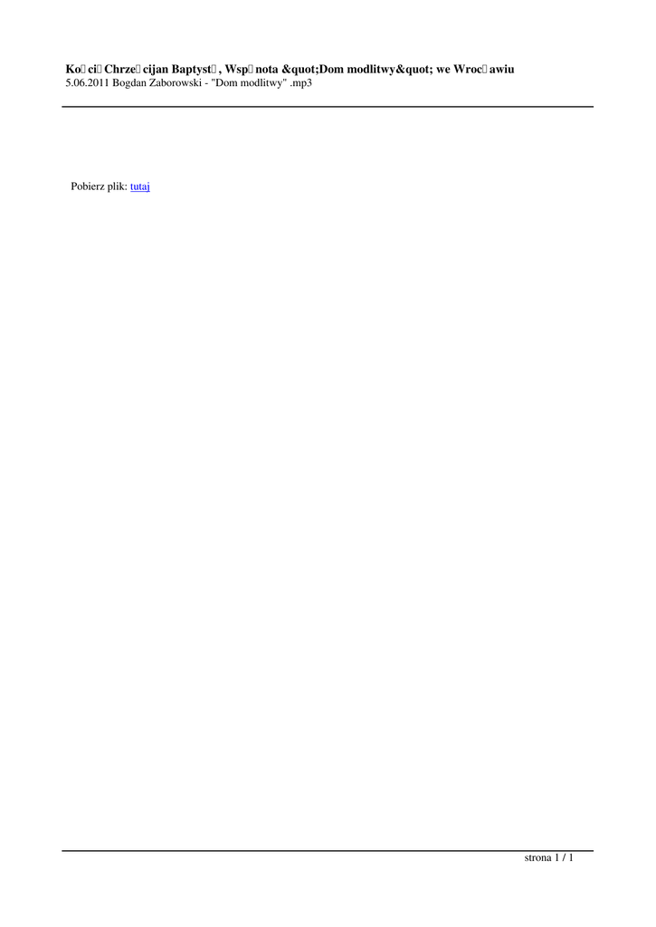 Ko�ci�Chrze�cijan Baptyst�, Wsp�nota "Dom modlitwy" we Wroc�awiu 5.06.2011 Bogdan Zaborowski - "Dom modlitwy" .mp3 Pobierz plik: tutaj strona 1 / 1