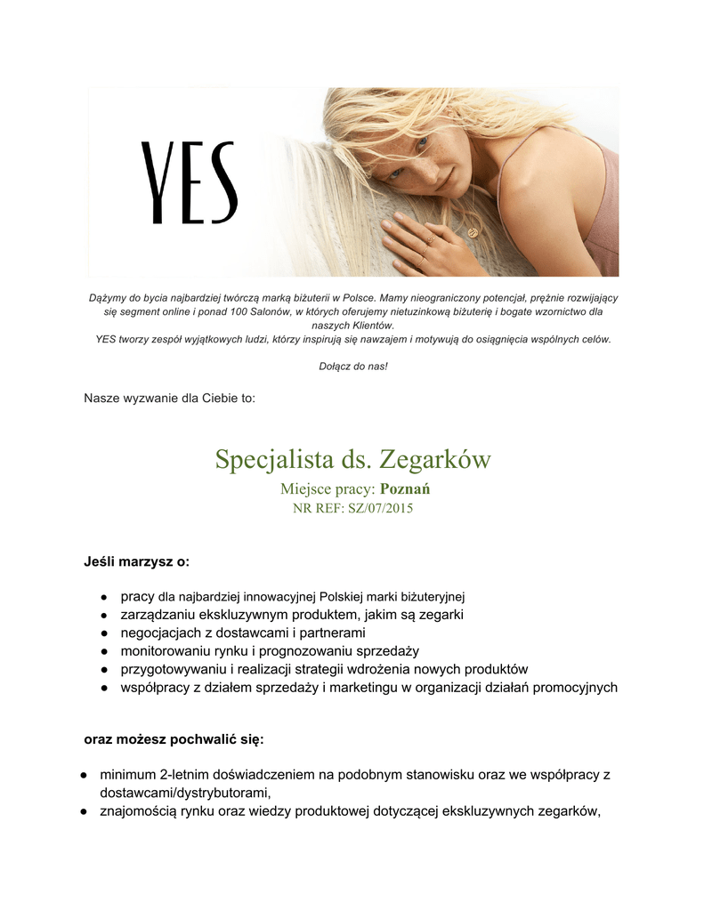 Dążymy do bycia najbardziej twórczą marką biżuterii w Polsce. Mamy nieograniczony potencjał, prężnie rozwijający się segment online i ponad 100 Salonów, w których oferujemy nietuzinkową biżuterię i bogate wzornictwo dla naszych Klientów. YES tworzy zespół wyjątkowych ludzi, którzy inspirują się nawzajem i motywują do osiągnięcia wspólnych celów. Dołącz do nas! Nasze wyzwanie dla Ciebie to: Specjalista ds. Zegarków Miejsce pracy: Poznań NR REF: SZ/07/2015 Podstawowe zadania zatrudnionej osoby: Jeśli marzysz o: ● ● ● ● ● ● pracy dla najbardziej innowacyjnej Polskiej marki biżuteryjnej zarządzaniu ekskluzywnym produktem, jakim są zegarki negocjacjach z dostawcami i partnerami monitorowaniu rynku i prognozowaniu sprzedaży przygotowywaniu i realizacji strategii wdrożenia nowych produktów współpracy z działem sprzedaży i marketingu w organizacji działań promocyjnych oraz możesz pochwalić się: ● minimum 2-letnim doświadczeniem na podobnym stanowisku oraz we współpracy z dostawcami/dystrybutorami, ● znajomością rynku oraz wiedzy produktowej dotyczącej ekskluzywnych zegarków, ● umiejętnościami analitycznymi, ● swobodnym posługiwaniem się językiem angielskim a także: ● jesteś gotowy brać udział w wyjazdach na targi ● dobrze się czujesz w środowisku MS Office i Google Docs ● posiadasz prawo jazdy kat. B Oferujemy: OFERUJEMY … to chętnie powitamy Cię w naszym Teamie! YES wspiera na co dzień tych, którzy poszukują wyzwań, a kariera w naszej firmie to wykorzystanie unikalnej szansy rozwoju zawodowego. Szukamy osób nieprzeciętnych, zaangażowanych, z pasją. Prześlij nam swoje CV do dnia 31.07.2014 na adres: [email protected] Prosimy Kandydatów o dodanie w tytule maila numeru referencyjnego ogłoszenia. Informujemy, że odpowiadamy tylko na wybrane oferty. Prosimy o zawarcie klauzuli: Wyrażam zgodę na przetwarzanie danych osobowych zawartych w niniejszym dokumencie dla potrzeb niezbędnych do realizacji obecnego jak i przyszłych procesów rekrutacyjnych zgodnie z ustawą z dnia 29.08.1997 o Ochronie Danych Osobowych, (Dz. Ustaw nr 133 poz. 883, z art. 23 i następnych ww. ustawy).