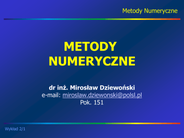 Metody Numeryczne METODY NUMERYCZNE dr inż. Mirosław Dziewoński e-mail: [email protected] Pok. 151 Wykład 2/1 Metody Numeryczne Aproksymacja funkcji jednej zmiennej Wykład 2/2 Aproksymacja funkcji jednej zmiennej Dana jest funkcja jednej zmiennej y f ( x) gdzie x [ a, b] Funkcja ta podana jest w postaci wzoru analitycznego lub w postaci zbioru punktów f ( x1 ) y1 , f ( x2 ) y2 , ... , f ( xn ) yn Celem aproksymacji jest dobór takiej funkcji F ( x, p0 , ... , pk ), x [a, b] aby w sensie przyjętego kryterium funkcja ta możliwie dokładnie odtwarzała przebieg funkcji f (x). Wykład 2/3 Aproksymacja funkcji jednej zmiennej Jeżeli funkcja dana jest w postaci dyskretnej (zbioru punktów) to aproksymację nazywamy punktową, a jeżeli w postaci wzoru analitycznego, to mówimy o aproksymacji integralnej. Wykład 2/4 Aproksymacja funkcji jednej zmiennej Kryteria aproksymacji punktowej dla funkcji jednej zmiennej konstruuje się tak, aby zminimalizować różnice pomiędzy wartościami danej funkcji f (x) w punktach (xi, yi), i = 1, 2 ,…, n a wartościami funkcji F (x, p0, …, pk ) w tych samych punktach. Wprowadzamy pojęcie odchyłki: i F ( xi , p0 , ... , pk ) yi min , i 1, 2,..., n Należy tak dobrać parametry p0, …, pk wzoru empirycznego, aby spełnione było kryterium minimalizacji odchyłki. Wykład 2/5 Aproksymacja funkcji jednej zmiennej Wykład 2/6 Aproksymacja funkcji jednej zmiennej W literaturze można spotkać następujące kryteria minimalizacji odchyłek • metoda wybranych punktów, • metoda średnich, • metoda sumowania bezwzględnych wartości, • metoda najmniejszych kwadratów. Wykład 2/7 Metoda najmniejszych kwadratów Kryterium tej metody polega na takim doborze współczynników funkcji F (x, p0, …, pk ), aby n n S ( p0 , ... , pk ) F ( xi , p0 , ... , pk ) yi min i 1 Wykład 2/8 2 i i 1 2 Aproksymacja liniowa funkcji jednej zmiennej Rozpatrujemy zbiór punktów ( x1 , y1 ), ( x2 , y2 ), ..., ( xn , yn ) którego aproksymacją ma być funkcja liniowa y p0 p1 x Zgodnie z kryterium metody najmniejszych kwadratów n S ( p0 , p1 ) p0 p1 xi yi min i 1 Wykład 2/9 2 Aproksymacja liniowa funkcji jednej zmiennej Warunkiem koniecznym dla istnienia ekstremum funkcji dwóch zmiennych jest zerowanie się odpowiednich pochodnych cząstkowych: S ( p0 , p1 ) 0 p 0 S ( p0 , p1 ) 0 p1 Otrzymujemy zatem następujący układ równań: n S p 2 p0 p1 xi yi 0 i 1 0 n S 2 p0 p1 xi yi xi 0 p1 i 1 Wykład 2/10 Aproksymacja liniowa funkcji jednej zmiennej Układ ten można zapisać w następującej postaci: n n p0 n p1 xi yi i 1 i 1 n n n 2 p x p x 0 i 1 i xi yi i 1 i 1 i 1 lub macierzowo: n n xi i 1 Wykład 2/11 n xi yi p0 i 1 i 1 n n 2 p1 xi xi yi i 1 i 1 n Aproksymacja liniowa funkcji jednej zmiennej Rozwiązując układ równań dowolną metodą można obliczyć parametry p0 i p1 np.: X P Y P X 1 Y Wykład 2/12 Aproksymacja kwadratowa funkcji jednej zmiennej Przykład 1: Dla zbioru punktów Pi ( xi , yi ), i 1,2, ... , n dobrać wzór aproksymujący w postaci: y p0 p1 x p2 x 2 Wykład 2/13 Aproksymacja kwadratowa funkcji jednej zmiennej Wykorzystując kryterium metody najmniejszych kwadratów 2 S ( p0 , p1 , p2 ) p0 p1 xi p2 xi2 yi = min n i 1 możemy zapisać następujący układ równań: n S 2 2 p p x p x 0 1 i 2 i yi 1 0 p i 1 0 n S 2 p0 p1 xi p2 xi2 yi xi 0 i 1 p1 n S 2 p0 p1 xi p2 xi2 yi xi2 0 i 1 p2 Wykład 2/14 Aproksymacja kwadratowa funkcji jednej zmiennej Zapis macierzowy: n n xi i 1 n 2 xi i 1 n x i 1 i n 2 x i i 1 n 3 x i i 1 n 2 xi yi i 1 p0 i 1 n n 3 x y x p i 1 i i i 1 p2 i 1 n n 2 4 xi xi yi i 1 i 1 n Z powyższego układu równań wyznacza się Wykład 2/15 p0, p1, p2. Aproksymacja funkcji jednej zmiennej Przykład 2: Dla zbioru punktów Pi ( xi , yi ), i 1,2, ... , n dobrać wzór aproksymujący w postaci: 1 y b0 b1 2 b2 x 2 x Wykład 2/16 Aproksymacja funkcji jednej zmiennej Wykorzystując kryterium metody najmniejszych kwadratów 2 1 2 S (b0 , b1 , b2 ) b0 b1 2 b2 xi yi = min xi i 1 n zapisujemy następujący układ równań: n S 1 2 2 b0 b1 2 b2 xi yi 1 0 xi i 1 b0 S n 1 1 2 2 b0 b1 2 b2 xi yi 2 0 xi i 1 xi b1 S n 2 1 2 2 b0 b1 2 b2 xi yi xi 0 xi b2 i 1 Wykład 2/17 Aproksymacja funkcji jednej zmiennej Zapis macierzowy: n n 1 x 2 i 1 i n 2 xi i 1 n 1 2 i 1 xi n 1 4 i 1 xi n n x yi i 1 b0 i 1 n yi n b1 2 b2 i 1 xi n n 2 4 xi xi yi i 1 i 1 n 2 i Z powyższego układu równań wyznacza się Wykład 2/18 b0, b1, b2. Metody Numeryczne Interpolacja funkcji jednej zmiennej Wykład 2/19 Interpolacja - definicja Dana jest funkcja: y f ( x) , x x0 , xn dla której znamy tablicę jej wartości f ( x0 ) y0 , f ( x1 ) y1 , ..., f ( xn ) yn Wartości tworzące n +1 par punktów ( x0 , y0 ),( x1 , y1 ), ...,( xn , yn ) zwane są węzłami interpolacji. Wykład 2/20 Interpolacja - definicja Celem interpolacji jest wyznaczenie takiej funkcji W(x), aby: W ( x0 ) y0 , W ( x1 ) y1 ,..., W ( xn ) yn Funkcja ta nazywana jest wielomianem interpolacyjnym i węzłach interpolacji przyjmuje takie same wartości co funkcja y = f (x). Wykład 2/21 Interpolacja - definicja Wielomian interpolacyjny definiuje się jako kombinację liniową n + 1 funkcji bazowych i współczynników ai n W ( x) ai i ( x) i 0 ai – współczynniki wielomianu interpolacyjnego i(x) – przyjęte funkcje bazowe Wykład 2/22 Interpolacja - definicja Definiując: Φ 0 ( x), 1 ( x), 2 ( x),..., n ( x) 0 ( x0 ) 1 ( x0 ) (x ) (x ) 1 1 X 0 1 ... ... 0 ( xn ) 1 ( xn ) ... n ( x0 ) ... n ( x1 ) ... ... ... n ( xn ) a0 a A 1 an wtedy: XA Y W ( x) X1Y Wykład 2/23 y0 y Y 1 yn Interpolacja naturalna Funkcje bazowe: 0 ( x) x0 1, 1 ( x) x, 2 ( x) x 2 , ..., n ( x) x n Postać wielomianu interpolacyjnego: W ( x) a0 a1 x a2 x 2 ... an x n Wykład 2/24 Interpolacja naturalna Opierając się na warunku koniecznym istnienia interpolacji: a0 a1 x0 a2 x02 ... an x0n y0 a0 a1 x1 a2 x12 ... an x1n y1 a0 a1 xn a2 xn2 ... an xnn yn można zapisać, że AX Y Wykład 2/25 1 1 X ... 1 a0 y0 x0 ... x0n a y x1 ... x1n A 1 Y 1 .