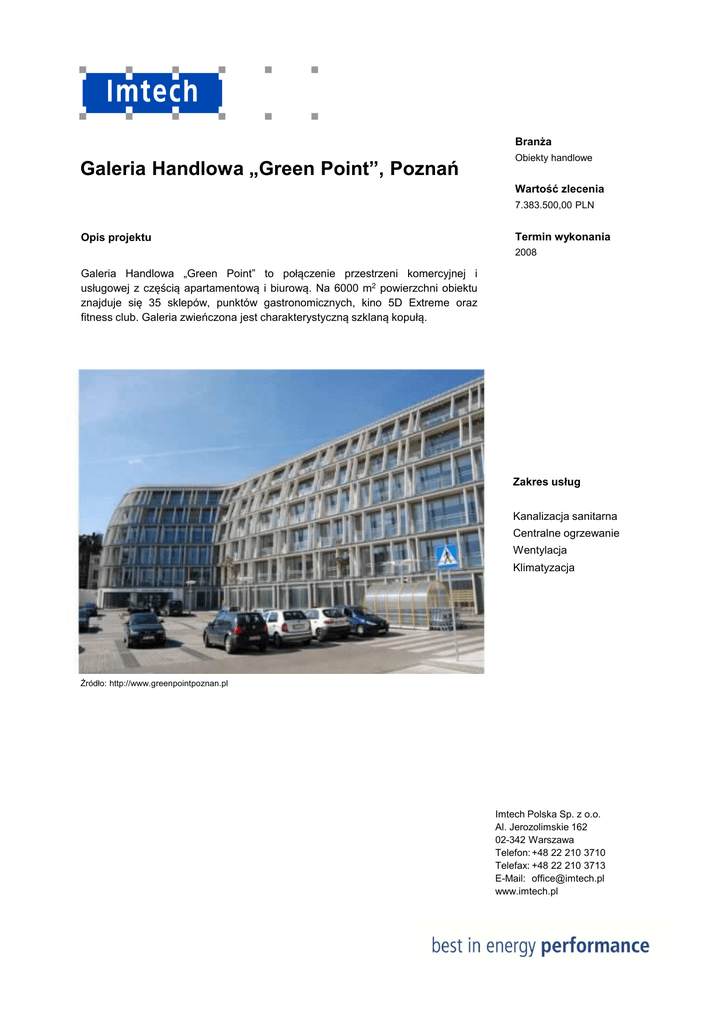 Branża Galeria Handlowa „Green Point”, Poznań Obiekty handlowe Wartość zlecenia 7.383.500,00 PLN Opis projektu Termin wykonania 2008 Galeria Handlowa „Green Point” to połączenie przestrzeni komercyjnej i usługowej z częścią apartamentową i biurową. Na 6000 m2 powierzchni obiektu znajduje się 35 sklepów, punktów gastronomicznych, kino 5D Extreme oraz fitness club. Galeria zwieńczona jest charakterystyczną szklaną kopułą. Zakres usług Kanalizacja sanitarna Centralne ogrzewanie Wentylacja Klimatyzacja Źródło: http://www.greenpointpoznan.pl Imtech Polska Sp. z o.o. Al. Jerozolimskie 162 02-342 Warszawa Telefon: +48 22 210 3710 Telefax: +48 22 210 3713 E-Mail: [email protected] www.imtech.pl