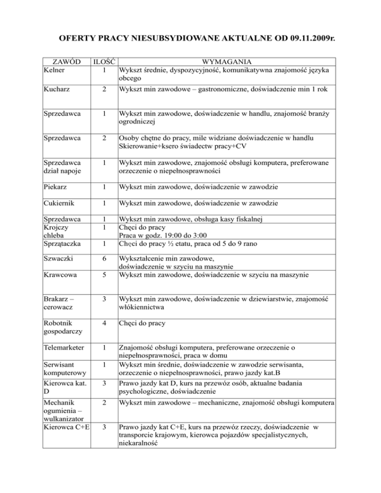 OFERTY PRACY NIESUBSYDIOWANE AKTUALNE OD 09.11.2009r. ZAWÓD Kelner ILOŚĆ WYMAGANIA 1 Wykszt średnie, dyspozycyjność, komunikatywna znajomość języka obcego Kucharz 2 Wykszt min zawodowe – gastronomiczne, doświadczenie min 1 rok Sprzedawca 1 Wykszt min zawodowe, doświadczenie w handlu, znajomość branży ogrodniczej Sprzedawca 2 Osoby chętne do pracy, mile widziane doświadczenie w handlu Skierowanie+ksero świadectw pracy+CV Sprzedawca dział napoje 1 Wykszt min zawodowe, znajomość obsługi komputera, preferowane orzeczenie o niepełnosprawności Piekarz 1 Wykszt min zawodowe, doświadczenie w zawodzie Cukiernik 1 Wykszt min zawodowe, doświadczenie w zawodzie Sprzedawca Krojczy chleba Sprzątaczka 1 1 Wykszt min zawodowe, obsługa kasy fiskalnej Chęci do pracy Praca w godz. 19:00 do 3:00 Chęci do pracy ½ etatu, praca od 5 do 9 rano Szwaczki 6 Krawcowa 5 Brakarz – cerowacz 3 Wykszt min zawodowe, doświadczenie w dziewiarstwie, znajomość włókiennictwa Robotnik gospodarczy 4 Chęci do pracy Telemarketer 1 Serwisant komputerowy Kierowca kat. D 1 Znajomość obsługi komputera, preferowane orzeczenie o niepełnosprawności, praca w domu Wykszt min średnie, doświadczenie w zawodzie serwisanta, orzeczenie o niepełnosprawności, prawo jazdy kat.B Prawo jazdy kat D, kurs na przewóz osób, aktualne badania psychologiczne, doświadczenie Mechanik ogumienia – wulkanizator Kierowca C+E 2 Wykszt min zawodowe – mechaniczne, znajomość obsługi komputera 3 Prawo jazdy kat C+E, kurs na przewóz rzeczy, doświadczenie w transporcie krajowym, kierowca pojazdów specjalistycznych, niekaralność 1 3 Wykształcenie min zawodowe, doświadczenie w szyciu na maszynie Wykszt min zawodowe, doświadczenie w szyciu na maszynie PRACE SPOŁECZNIE UŻYTECZNE w okresie od 09.11.2009 do 13.11.2009 podejmie 162 osób bezrobotnych – klienci OPS ZGŁOSZENIE WOLNEGO MIEJSCA PRACY AKTUALNE OD 09.11.2009 ZAWÓD Referent do spraw produkcji Asystent maklera ILOŚĆ WYMAGANIA 1 Wykszt wyższe techniczne, znajomość pakietu Ms Office, AutoCad, rysunku technicznego, mile widziana znajomość języka angielskiego CV+l.motywacyjny w godz. 10-11:00 1 Wykszt wyższe preferowane ekonomiczne, bankowość, finanse, obsługa komputera, mile widziana znajomość języka obcego. Mail: [email protected] Doradca 1 Wykszt min średnie, komunikatywność, dobra organizacja pracy, mile finansowy widziane prawo jazdy kat B, praca teren woj. lubuskiego ubezpieczyciel Mail: [email protected] Technik 1 Wykszt średnie – techniczne, prawo jazdy kat B, zdolności manualne instalator Dyspozytor spedytor 1 Telemarketer 1 Technolog 1 Asystent inspektora robót drogowych Mechanik samochodowy 1 Elektromechan ik-elektronik 4 Wykszt zawodowe – elektromechanik samochodowy, uprawnienia elektroniczne Pracownik produkcyjny 5 Ustawiacz maszyn 3 Ślusarzspawacz 1 Wykszt min zawodowe,doświadczenie w pracy przy produkcji szkła, podstawowa znajomość rysunku technicznego, odpowiedzialność, mile widziane uprawnienia elektryczne do 1 kV bądź na wózki widłowe MAIL: [email protected] Wykszt średnie lub zawodowe o profilu:mechanik, elektromechanik,elektromonter,elektronik, ogólna wiedza techniczna, umiejętność posługiwaniem się rys technicznym, przyrządami pomiarowymi MAIL: [email protected] Wykszt min zawodowe, uprawnienia spawalnicze, mile widziane doświadczenie Szlifierz 1 Wykszt zawodowe, szlifowanie elementów metalowych Spawacz 1 Wykszt zawodowe, uprawnienia spawalnicze metodą MAG 1 Wykszt min średnie, doświadczenie w pracy min2 lata, bardzo dobra znaj j.niemieckiego bądź angielskiego, podstawy znajomości j.rosyjskiego Wykszt średnie, komunikatywność, łatwość nawiązywania kontaktów, praca w domu Wykszt min średnie – techniczne, 5-letnie doświadczenie w budowie dróg i mostów Praca w Łęknicy Mail: [email protected] Wykszt min średnie techniczne , 2-letnie doświadczenie w budowie dróg Praca w Łęknicy Mail: [email protected] Wykszt średnie lub technikum szkoły zawodowej, podstawowa obsługa pojazdów samochodowych Ślusarz 1 Wykszt zawodowe, praca z elementami metalowymi Kierowca kat Cz uprawnieniami HDS Dekarz - cieśla 1 Wykszt zawodowe, prawo jazdy kat C, uprawnienia HDS 4 Doświadczenie w pracach budowlanych, chęci do pracy Tokarz - frezer 1 Wykszt min zawodowe, doświadczenie w pracy Elektromonter 1 Pracownik fizyczny 6 Wykszt min zawodowe, 3-letnie doświadczenie w zawodzie, znajomość elektryki przemysłowej, narzędzi pomiarowych, uprawnienia do 1 kV Chęci do pracy, osoby z terenu Żar i okolic, uregulowana służba wojskowa Pracownik biurowy Sprzedawca materiałów budowlanych Fryzjerka 1 Wykszt średnie, doświadczenie w pracy biurowej i obsłudze klienta 1 Wykszt średnie, doświadczenie w handlu, niekaralność 1 Wykszt min zawodowe - kierunkowe Kierowca C+E 2 Wykszt min zawodowe, prawo jazdy kat C+E Transport krajowy i międzynarodowy Kierowca C+E 1 Prawo jazdy kat C+E, kurs na przewóz rzeczy, podstawowa znajomość języka niemieckiego Operator dźwigu 1 Prawo jazdy kat C, uprawnienia do obsługi dźwigu Informacja o wolnym miejscu pracy dla nauczycieli ZAWÓD Inżynier technologii żywienia ILOŚĆ WYMAGANIA 1 Wykszt wyższe - kierunkowe Oferty pracy subsydiowanej (Kontakt osobisty w pokoju nr 15) Asystent Lidera Klubu Pracy 1 Wyksz. wyższe, komunikatywność, oferta stażu Pracownik prac wykończeniowych (szwalnia) 1 Orzeczenie o stopniu niepełnosprawności