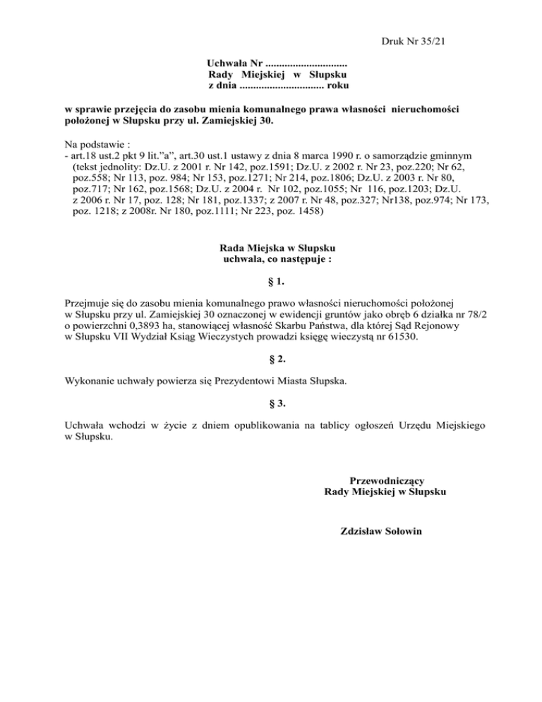 Druk Nr 35/21 Uchwała Nr .............................. Rady Miejskiej w Słupsku z dnia ............................... roku w sprawie przejęcia do zasobu mienia komunalnego prawa własności nieruchomości położonej w Słupsku przy ul. Zamiejskiej 30. Na podstawie : - art.18 ust.2 pkt 9 lit.”a”, art.30 ust.1 ustawy z dnia 8 marca 1990 r. o samorządzie gminnym (tekst jednolity: Dz.U. z 2001 r. Nr 142, poz.1591; Dz.U. z 2002 r. Nr 23, poz.220; Nr 62, poz.558; Nr 113, poz. 984; Nr 153, poz.1271; Nr 214, poz.1806; Dz.U. z 2003 r. Nr 80, poz.717; Nr 162, poz.1568; Dz.U. z 2004 r. Nr 102, poz.1055; Nr 116, poz.1203; Dz.U. z 2006 r. Nr 17, poz. 128; Nr 181, poz.1337; z 2007 r. Nr 48, poz.327; Nr138, poz.974; Nr 173, poz. 1218; z 2008r. Nr 180, poz.1111; Nr 223, poz. 1458) Rada Miejska w Słupsku uchwala, co następuje : § 1. Przejmuje się do zasobu mienia komunalnego prawo własności nieruchomości położonej w Słupsku przy ul. Zamiejskiej 30 oznaczonej w ewidencji gruntów jako obręb 6 działka nr 78/2 o powierzchni 0,3893 ha, stanowiącej własność Skarbu Państwa, dla której Sąd Rejonowy w Słupsku VII Wydział Ksiąg Wieczystych prowadzi księgę wieczystą nr 61530. § 2. Wykonanie uchwały powierza się Prezydentowi Miasta Słupska. § 3. Uchwała wchodzi w życie z dniem opublikowania na tablicy ogłoszeń Urzędu Miejskiego w Słupsku. Przewodniczący Rady Miejskiej w Słupsku Zdzisław Sołowin UZASADNIENIE : 1. Stan istniejący : Nieruchomość położona w Słupsku przy ul. Zamiejskiej 30, oznaczona w ewidencji gruntów jako obręb 6 działka nr 78/2 o powierzchni 0,3893 ha, zabudowana strzelnicą sportową stanowi własność Skarbu Państwa. Szkoła Policji, która od 1966 roku była zarządcą nieruchomości, udostępniała obiekty strzelnicy w nieodpłatnie użytkowanie Klubowi Strzeleckiemu „Gryf Słupski”. Ponieważ obiekty strzelnicy nie znajdowały zastosowania do szkolenia strzeleckiego słuchaczy, Szkoła Policji wnioskiem z dnia 18.10.2006 r. wystąpiła o wygaszenie prawa trwałego zarządu na działce nr 78/2. W związku z tym decyzją Prezydenta Miasta Słupska wykonującego zadania z zakresu administracji rządowej z dnia 20.02.2006 r. prawo to zostało wygaszone. W celu kontynuacji działalności Klub Strzelecki wnioskiem z dnia 18.10.2006 r. wystąpił o przekazanie nieruchomości na rzecz Klubu. Wojewoda Pomorski Zarządzeniem Nr 68/2007 wyraził zgodę Prezydentowi Miasta Słupska na użyczenie przedmiotowej nieruchomości na czas nieoznaczony na rzecz Klubu Strzeleckiego „Gryf Słupski”. W dniu 27.04.2007 r. została zawarta umowa użyczenia przedmiotowej nieruchomości na czas nieoznaczony z przeznaczeniem na działalność statutową Klubu. Klub Strzelecki „Gryf Słupki” korzystający z przedmiotowej nieruchomości działa w Słupsku od 50 lat, i szczyci się wieloma sukcesami. Aktualnie Klub zrzesza łącznie 300 zawodników. Raz w miesiącu organizowane są zawody masowe. Poza tym, Klub realizuje duże zawody sportowe dla zawodników zrzeszonych w Polskim Związku Strzeleckim. Między innymi Ogólnopolskie Zawody o Puchar Prezydenta Rzeczypospolitej Polskiej oraz Ogólnopolskie Zawody o Puchar Prezydenta Miasta Słupska. Ponadto w Klubie zrzeszone jest także „Bractwo Strzeleckie” liczące około 60 osób. 2. Potrzeba i cel podjęcia uchwały : W Wieloletnim Planie Inwestycyjnym na lata 2009 - 2012 ujęte jest zadanie „Przebudowa i modernizacja strzelnicy sportowej „Gryf Słupski”. Inwestycja będąca obecnie na etapie wykonywania prac projektowych finansowana będzie ze środków Gminy Miejskiej Słupsk z niewielkim udziałem środków Klubu Strzeleckiego „Gryf Słupski”. Przejęcie nieruchomości do zasobu mienia komunalnego podwyższy skuteczność realizacji zadań własnych Miasta w zakresie rozpowszechniania kultury fizycznej oraz aktywizacji społeczeństwa w różnym wieku. Podejmowanie działań w tym zakresie należy do władz samorządowych, jako reprezentanta interesów społeczności lokalnej. Uchwała Rady Miejskiej o woli przejęcia nieruchomości do zasobów mienia komunalnego, stanowić będzie podstawę do wystąpienia do Wojewody Pomorskiego z wnioskiem o przekazanie Gminie Miejskiej Słupsk prawa własności nieruchomości, co z kolei umożliwi wykonywanie zadań własnych w celu zaspokajania zbiorowych potrzeb mieszkańców. Realizacja wyżej wymienionego zadania ujęta jest w Wieloletnim Planie Inwestycyjnym. 3. Różnica między dotychczasowym a projektowanym stanem prawnym : Obecnie właścicielem nieruchomości jest Skarb Państwa. Z chwilą komunalizacji Gmina Miejska stanie się właścicielem nieruchomości. 4. Przewidywane skutki społeczne i gospodarcze : Przejęcie prawa własności nieruchomości stanowić będzie podstawę prawną do inwestowania przez Gminę w nieruchomość, i tym samym umożliwi realizowanie zadań z zakresu krzewienia kultury fizycznej, zgodnie z celami i zadaniami określonymi w statucie miasta. 5. Skutki finansowe, związane z wejściem w życie uchwały : Nie występują. 6. Źródła finansowania : Nie występują.