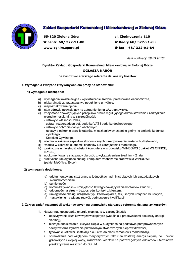 ZZaakkłłaadd G Goossppooddaarrkkii K Koom muunnaallnneejj ii M Miieesszzkkaanniioow weejj w w ZZiieelloonneejj G Góórrzzee 65-120 Zielona Góra al. Zjednoczenia 110 centr. 68/ 322-91-00 Kadry 68/ 322-91-68 www.zgkim.zgora.pl fax 68/ 322-91-84 data publikacji: 29.09.2010r. Dyrektor Zakładu Gospodarki Komunalnej i Mieszkaniowej w Zielonej Górze OGŁASZA NABÓR na stanowisko starszego referenta ds. analizy kosztów 1. Wymagania związane z wykonywaniem pracy na stanowisku: 1) wymagania niezbędne: a) b) c) d) e) f) g) h) i) j) wymagania kwalifikacyjne - wykształcenie średnie, preferowane ekonomiczne, niekaralność za przestępstwa popełnione umyślnie, nieposzlakowana opinia, stan zdrowia pozwalający na zatrudnienie na w/w stanowisku, znajomość obowiązujących przepisów prawa regulującego administrowanie i zarządzanie nieruchomościami, a w szczególności: - ustawy o własności lokali, - ustaw i rozporządzeń dot. podatku VAT i podatku dochodowego, - ustawy o ochronie danych osobowych, - ustawy o ochronie praw lokatorów, mieszkaniowym zasobie gminy i o zmianie kodeksu cywilnego, - Kodeksu Cywilnego, wiedza w zakresie aspektów ekonomicznych funkcjonowania zakładu budŜetowego, wiedza w zakresie ekonomii, finansów lub zarządzania i marketingu, praktyczna umiejętność obsługi komputera w środowisku WINDOWS ( pakiet MS OFFICE, EXCEL), udokumentowany staŜ pracy dla osób z wykształceniem średnim - 2 lata, praktyczna umiejętność obsługi komputera w obszarze środowiska WINDOWS (pakiet MsOffice, Excel). 2) wymagania dodatkowe: a) udokumentowany staŜ pracy w jednostkach administrujących lub zarządzających nieruchomościami, b) sumienność, c) komunikatywność – umiejętność łatwego nawiązywania kontaktów z ludźmi, d) odporność na stres – bezpośredni kontakt z klientem, e) umiejętność obsługi urządzeń typu kserokopiarka, fax, i innych urządzeń biurowych, f) nastawienie na własny rozwój, podnoszenie kwalifikacji. 2. Zakres zadań (czynności) wykonywanych na stanowisku starszego referenta ds. analizy kosztów: 1. Nadzór nad gospodarką energią cieplną, a w szczególności: odczytywanie liczników węzłów cieplnych (wspólnie z pracownikami dostawcy energii cieplnej), bieŜące analizowanie zuŜycia ciepła w budynkach na podstawie przeprowadzonych odczytów oraz zgłaszanie przełoŜonym stwierdzonych nieprawidłowości, typowanie kotłowni i instalacji c.o. i c.w. do planu remontów i modernizacji, sprawdzanie pod względem merytorycznym faktur za dostawę energii cieplnej do celów grzewczych i ciepłej wody, rozliczanie kosztów na poszczególnych odbiorców i terminowe przekazywanie rozliczeń do ZGKiM. 2. 3. 5. 6. 7. 8. 9. 10. 11. ustalanie i rozliczanie kosztów na poszczególnych odbiorców oraz na wspólną nieruchomość oraz przygotowywanie materiałów do ustalania opłaty za c.o. i c.w, wprowadzanie danych, drukowanie rozliczeń i powiadomień indywidualnym odbiorcom. Przygotowywanie danych (przypisów, kosztów oraz współczynników korekt) dla firm rozliczających budynki w pełni opomiarowane. Przyjmowanie i załatwianie zgłoszeń dot: instalacji centralnego ogrzewania i ciepłej wody (awarie, naprawy, itp.) niedogrzania lokali mieszkalnych i lokali uŜytkowych. Prowadzenie całości spraw dotyczących prac na instalacji centralnego ogrzewania w lokalach budynków wspólnot mieszkaniowych. Wystawianie faktur oraz dowodów RW dotyczących rozliczenia centralnego ogrzewania i ciepłej wody oraz prac na instalacjach dla mieszkańców i uŜytkowników obcych. Opracowywanie niezbędnych materiałów z działalności zarządu wspólnot mieszkaniowych na roczne zebrania współwłaścicieli. BieŜąca realizacja analizy porównawczej przypisu rzeczywistego z kosztami na budynek oraz zgłaszanie przełoŜonym stwierdzonych nieprawidłowości. Opracowywanie i spisywanie treści uchwał wspólnot mieszkaniowych Opracowywanie treści powiadomień o podjętych uchwałach wspólnot mieszkaniowych i wykonywanie czynności związanych z ich wysyłką. Prowadzenie spraw dotyczących kancelarii. 3. Wymagane dokumenty i oświadczenia: 1) list motywacyjny (oryginał), 2) curriculum vitae (oryginał), 3) kwestionariusz osobowy dostępny na stronie www.zgkim.zgora.pl/druki/(oryginał), 4) kserokopia dowodu osobistego, 5) kopie dokumentów potwierdzających wykształcenie, 6) kopie dokumentów potwierdzających kwalifikacje zawodowe, 7) oświadczenie o niekaralności, 8) oświadczenie o stanie zdrowia, 9) oświadczenie o wyraŜeniu zgody na przetwarzanie danych osobowych zawartych w dokumentach składanych w związku z naborem, dla potrzeb niezbędnych dla realizacji procesu rekrutacji zgodnie z ustawą z dnia 29 sierpnia 1997 roku o ochronie danych osobowych (Dz. U. Z 2002 r. Nr 101, poz. 926 ze zm.). 10. udokumentowany staŜ pracy dla osób z wykształceniem średnim - 2 lata, 4. Termin i sposób składania dokumentów aplikacyjnych: 1) termin: faktycznego wpływu aplikacji do ZGKiM do 11.10.2010 r. 2) sposób składania dokumentów aplikacyjnych: w zamkniętej kopercie z napisem: „Nabór na stanowisko starszego referenta ds. analizy kosztów ”, osobiście lub listem poleconym: 3) miejsce Zakład Gospodarki Komunalnej i Mieszkaniowej al. Zjednoczenia 110A 65-120 Zielona Góra pok.002 KANCELARIA (parter). 5. Dodatkowe informacje: 1) 2) 3) kontakt z inspektorem ds. osobowych: tel. 068 322 91 68; aplikacje, które wpłyną do ZGKiM po wskazanym terminie nie będą rozpatrywane. kandydaci spełniający wymogi formalne zostaną pisemnie poinformowani o terminie postępowania sprawdzającego. 4) informacja o wyniku naboru będzie ogłoszona na tablicy informacyjnej w ZGKiM w Zielonej Górze al. Zjednoczenia 110 A przy pok. 103 I piętro, oraz na stronie internetowej Zakładu www.bip.zgkim.zgora.pl. 5) dokumenty aplikacyjne kandydatów, którzy nie zakwalifikowali się do postępowania sprawdzającego zostaną odesłane pocztą. mgr inŜ