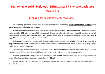 Znamy już wyniki I Halowych Mistrzostw SP 6 w Lekkoatletyce klas III i IV PUCHAR KLASY MISTRZÓW NALEŻY DO KLASY IV c Do klasyfikacji generalnej branych było 15 najlepszych wyników z danej klasy. Klasa IV c okazała się najlepsza, aż 10 uczniów otrzymało wynik powyżej <200pkt. Najlepszym zawodnikiem Halowych Mistrzostw, został uczeń klasy IV a - Krupitowicz Oskar uzyskując największą sumę punktów 252 pkt, ze wszystkich konkurencji. Okazał się również najlepszym spośród uczniów w dwóch konkurencjach, w rzucie piłką lekarską w tył (3kg) uzyskując wynik 6,35 m oraz wykonał największą liczbę brzuszków w ciągu 30 sekund (siady z leżenia tyłem)– zrobił ich 29. Najszybszym zawodnikiem spośród osób biorących udział w mistrzostwach został Wiktor Załoga, kl. IV c uzyskując w biegu wahadłowym 4x10m czas 00:10:38 s. Wiktor uzyskał również dobre rezultaty w innych konkurencjach, dzięki czemu zdobył srebrny krążek – II miejsce. Zaskoczeniem mistrzostw okazał się uczeń klasy III d – Rajkowski Mateusz (rocznik 2006), który dzięki wysokim wynikom wszystkich konkurencji (suma 237pkt.) plasował się na III miejsce otrzymując brązowy medal. Najdłuższy skok w dal z miejsca oddała dziewczyna – Laura Schudaj uczennica klasy IV c, pozostawiając wszystkich, nawet chłopaków, daleko z tyłu, skacząc prawie 2 metry (196cm). Puchar również trafił do najmłodszego zawodnika, była to Julia Hubert z klasy III d. Puchar ufundował sponsor – firma A.Z. Grawer. WYNIKI I HALOWYCH MISTRZOSTW SP 6 W LEKKIEJ ATLETYCE NAJLEPSZY ZAWODNIK Miejsce Imię i Nazwisko KLASA MISTRZÓW punkty I II III Krupitowicz Oskar Załoga Wiktor Rajkowski Mateusz IV Czachorowski Aleksander 231 V Schudaj Laura 231 VI Skrzypczak Piotr 227 VII Minko Jakub VIII Tarasewicz Klaudia 226 224 IX Kowalkowski Miłosz X Poradowska Aleksandra 223 223 XI Świderek Jagoda 223 XII XIII Martuszewski Igor Leszkiewicz Michalina 221 220 XIV Marciniak Piotr 219 XV Waścińska Ewa 218 XVI Czechowicz Zofia 217 XVII XVIII Melak Michał Dubois-Placak Franciszek 217 216 XIX Jaremowicz Julia 216 XX Mikszta Lukrecja 214 kl. IV a kl. IV c kl. III d 252 247 237 Po Miejsce KLASA suma pkt I II III IV V VI VII VIII IV C IV A III C IV B III D IV D III B III A 3146 2998 2845 2787 2696 2614 2448 2436 ds um ow ują c, wI Ha lo wy ch Mi str zos opracowali: ach SP 6 w Lekkoatletyce wzięło udział 146 uczniów (71 z klas III i 75 z klas IV). Piotr Bogdanowicz Joanna Skicińska tw Zawody nie mogłyby się odbyć, gdyby nie nauczyciele wychowania fizycznego, którzy wszystkie konkurencje sędziowali i sprawowali, by zawody przebiegły bezpiecznie oraz sprawnie. Dariusz Cholka Joanna Skicińska Bogdanowicz Piotr