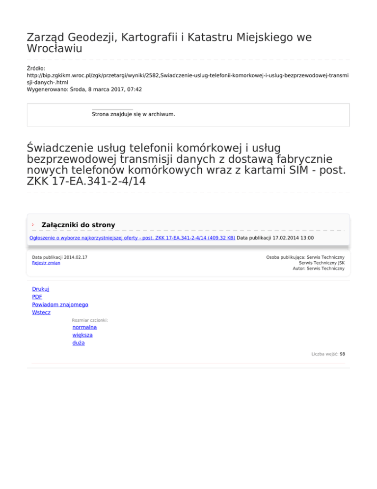 Zarząd Geodezji, Kartografii i Katastru Miejskiego we Wrocławiu Źródło: http://bip.zgkikm.wroc.pl/zgk/przetargi/wyniki/2582,Swiadczenie-uslug-telefonii-komorkowej-i-uslug-bezprzewodowej-transmi sji-danych-.html Wygenerowano: Środa, 8 marca 2017, 07:42 Strona znajduje się w archiwum. Świadczenie usług telefonii komórkowej i usług bezprzewodowej transmisji danych z dostawą fabrycznie nowych telefonów komórkowych wraz z kartami SIM - post. ZKK 17-EA.341-2-4/14 Załączniki do strony Ogłoszenie o wyborze najkorzystniejszej oferty - post. ZKK 17-EA.341-2-4/14 (409.32 KB) Data publikacji 17.02.2014 13:00 Data publikacji 2014.02.17 Rejestr zmian Osoba publikująca: Serwis Techniczny Serwis Techniczny JSK Autor: Serwis Techniczny Drukuj PDF Powiadom znajomego Wstecz Rozmiar czcionki: normalna większa duża Liczba wejść: 98