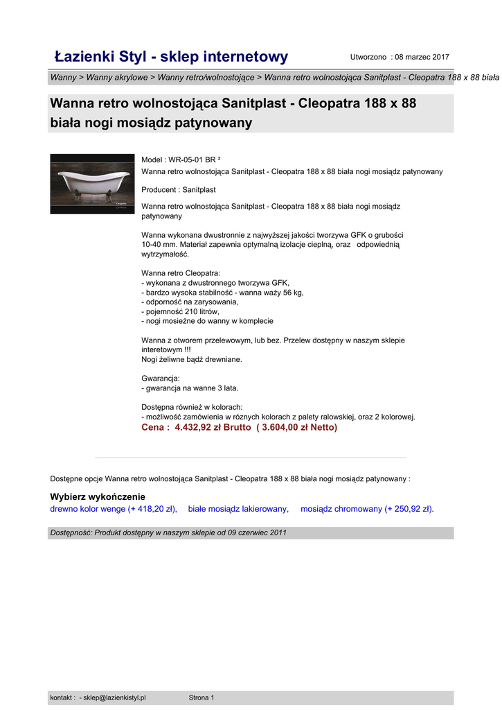 Łazienki Styl - sklep internetowy Utworzono : 08 marzec 2017 Wanny > Wanny akrylowe > Wanny retro/wolnostojące > Wanna retro wolnostojąca Sanitplast - Cleopatra 188 x 88 biała Wanna retro wolnostojąca Sanitplast - Cleopatra 188 x 88 biała nogi mosiądz patynowany Model : WR-05-01 BR ² Wanna retro wolnostojąca Sanitplast - Cleopatra 188 x 88 biała nogi mosiądz patynowany Producent : Sanitplast Wanna retro wolnostojąca Sanitplast - Cleopatra 188 x 88 biała nogi mosiądz patynowany Wanna wykonana dwustronnie z najwyższej jakości tworzywa GFK o grubości 10-40 mm. Materiał zapewnia optymalną izolacje cieplną, oraz odpowiednią wytrzymałość. Wanna retro Cleopatra: - wykonana z dwustronnego tworzywa GFK, - bardzo wysoka stabilność - wanna waży 56 kg, - odporność na zarysowania, - pojemność 210 litrów, - nogi mosieżne do wanny w komplecie Wanna z otworem przelewowym, lub bez. Przelew dostępny w naszym sklepie interetowym !!! Nogi żeliwne bądż drewniane. Gwarancja: - gwarancja na wanne 3 lata. Dostępna również w kolorach: - możliwość zamówienia w róznych kolorach z palety ralowskiej, oraz 2 kolorowej. Cena : 4.432,92 zł Brutto ( 3.604,00 zł Netto) Dostępne opcje Wanna retro wolnostojąca Sanitplast - Cleopatra 188 x 88 biała nogi mosiądz patynowany : Wybierz wykończenie drewno kolor wenge (+ 418,20 zł), białe mosiądz lakierowany, Dostępność: Produkt dostępny w naszym sklepie od 09 czerwiec 2011 kontakt : - [email protected] Strona 1 mosiądz chromowany (+ 250,92 zł).