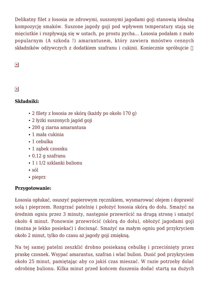 Delikatny filet z łososia ze zdrowymi, suszonymi jagodami goji stanowią idealną kompozycję smaków. Suszone jagody goji pod wpływem temperatury stają się mięciutkie i rozpływają się w ustach, po prostu pycha… Łososia podałam z mało popularnym (A szkoda !) amarantusem, który zawiera mnóstwo cennych składników odżywczych z dodatkiem szafranu i cukinii. Koniecznie spróbujcie Składniki: 2 filety z łososia ze skórą (każdy po około 170 g) 2 łyżki suszonych jagód goji 200 g ziarna amarantusa 1 mała cukinia 1 cebulka 1 ząbek czosnku 0,12 g szafranu 1 i 1/2 szklanki bulionu sól pieprz Przygotowanie: Łososia opłukać, osuszyć papierowym ręcznikiem, wysmarować olejem i doprawić solą i pieprzem. Rozgrzać patelnię i położyć łososia skórą do dołu. Smażyć na średnim ogniu przez 3 minuty, następnie przewrócić na drugą stronę i smażyć około 4 minut. Ponownie przewrócić (skórą do dołu), obłożyć jagodami goji (można je lekko posiekać) i docisnąć. Smażyć na małym ogniu pod przykryciem około 2 minut, tylko do czasu aż jagody goji zmiękną. Na tej samej patelni zeszklić drobno posiekaną cebulkę i przeciśnięty przez praskę czosnek. Wsypać amarantus, szafran i wlać bulion. Dusić pod przykryciem około 25 minut, pamiętając aby co jakiś czas mieszać. W razie potrzeby dolać odrobinę bulionu. Kilka minut przed końcem duszenia dodać startą na dużych oczkach cukinię i wymieszać. Gdy amarantus wchłonie cały płyn doprawić pieprzem i ewentualnie solą. Smacznego Patelnię do niskotłuszczowego smażenia można nabyć w internetowym sklepie: www. sklep.dajar.pl
