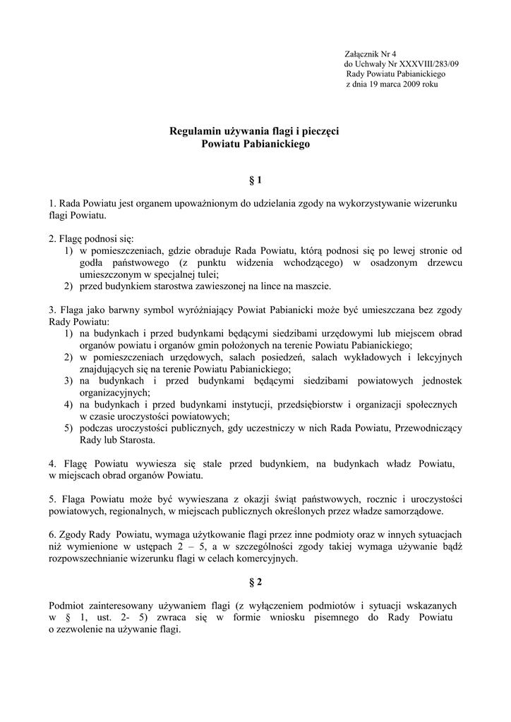 Załącznik Nr 4 do Uchwały Nr XXXVIII/283/09 Rady Powiatu Pabianickiego z dnia 19 marca 2009 roku Regulamin używania flagi i pieczęci Powiatu Pabianickiego §1 1. Rada Powiatu jest organem upoważnionym do udzielania zgody na wykorzystywanie wizerunku flagi Powiatu. 2. Flagę podnosi się: 1) w pomieszczeniach, gdzie obraduje Rada Powiatu, którą podnosi się po lewej stronie od godła państwowego (z punktu widzenia wchodzącego) w osadzonym drzewcu umieszczonym w specjalnej tulei; 2) przed budynkiem starostwa zawieszonej na lince na maszcie. 3. Flaga jako barwny symbol wyróżniający Powiat Pabianicki może być umieszczana bez zgody Rady Powiatu: 1) na budynkach i przed budynkami będącymi siedzibami urzędowymi lub miejscem obrad organów powiatu i organów gmin położonych na terenie Powiatu Pabianickiego; 2) w pomieszczeniach urzędowych, salach posiedzeń, salach wykładowych i lekcyjnych znajdujących się na terenie Powiatu Pabianickiego; 3) na budynkach i przed budynkami będącymi siedzibami powiatowych jednostek organizacyjnych; 4) na budynkach i przed budynkami instytucji, przedsiębiorstw i organizacji społecznych w czasie uroczystości powiatowych; 5) podczas uroczystości publicznych, gdy uczestniczy w nich Rada Powiatu, Przewodniczący Rady lub Starosta. 4. Flagę Powiatu wywiesza się stale przed budynkiem, na budynkach władz Powiatu, w miejscach obrad organów Powiatu. 5. Flaga Powiatu może być wywieszana z okazji świąt państwowych, rocznic i uroczystości powiatowych, regionalnych, w miejscach publicznych określonych przez władze samorządowe. 6. Zgody Rady Powiatu, wymaga użytkowanie flagi przez inne podmioty oraz w innych sytuacjach niż wymienione w ustępach 2 – 5, a w szczególności zgody takiej wymaga używanie bądź rozpowszechnianie wizerunku flagi w celach komercyjnych. §2 Podmiot zainteresowany używaniem flagi (z wyłączeniem podmiotów i sytuacji wskazanych w § 1, ust. 2- 5) zwraca się w formie wniosku pisemnego do Rady Powiatu o zezwolenie na używanie flagi. §3 We wniosku, o którym mowa w § 2, wnioskodawca: 1) podaje dokładne określenie podmiotu, który będzie używał flagę (imiona i nazwiska, adresy zamieszkania osób fizycznych; nazwy i siedziby osób prawnych). 2) podaje okres, w którym zamierza używać flagę Powiatu, 3) wskazuje cel, dla którego chce używać flagę i określa miejsce jej umieszczenia. §4 1. Uchwała Rady Powiatu Pabianickiego stanowi podstawę zawarcia umów o wzajemnych prawach i korzyściach wynikających z korzystania z flagi Powiatu, określających w szczególności warunki używania bądź komercyjnego rozpowszechniania flagi, czas trwania umowy oraz ewentualne warunki odpłatności z tego tytułu. 2. Rada Powiatu, wyrażając szczególne wyróżnienie dla osób fizycznych, prawnych, innych podmiotów gospodarczych, instytucji społeczno – kulturalnych i charytatywnych, prowadzących działalność leżącą w interesie Powiatu, jej mieszkańców lub wiążącą się z jego historią lub promocją, może wyrazić zgodę na nieodpłatne korzystanie z flagi Powiatu na warunkach określonych przez Radę Powiatu. §5 1. Rada Powiatu może wyrażoną zgodę zawiesić lub cofnąć, szczególnie jeżeli uprawniony podmiot naraża na szkodę prestiż lub interes Powiatu. 2. W kwestiach nieunormowanych niniejszym regulaminem, a dotyczących zasad używania flagi Powiatu Pabianickiego rozstrzyga Rada Powiatu Pabianickiego. §6 Flaga może pozostawać na maszcie od świtu do zmroku, a jeśli pozostaje dłużej, musi być dobrze oświetlona. Flaga nie może dotykać podłoża. §7 W dniach żałoby ogłoszonej przez władze państwowe lub lokalne należy: 1) rano podnieść flagę na szczyt masztu, a następnie opuścić ją do połowy wysokości masztu, 2) wieczorem podnieść chorągiew do szczytu masztu, a następnie powoli opuszczać na dół, 3) jeśli flaga umieszczona jest na maszcie skośnym należy przewiązać ją czarną wstęgą. §8 1. Na jednym maszcie można podnieść zasadniczo tylko jedną flagę. 2. W przypadku podniesienia kilku różnych flag należy kierować się następującymi zasadami: 1) kolejność powinna odpowiadać hierarchii – państwowa, wojewódzka, powiatowa, gminna, służbowa i inne (np. szkoły, klubu sportowego, przedsiębiorstwa), 2) wśród flag zajmujących w hierarchii identyczne miejsce pierwszeństwa przysługuje zawsze fladze gospodarza, 3) wszystkie maszty muszą być jednakowej wysokości, a odległość między masztami nie może być mniejsza niż 1/5 wysokości masztu, 4) wszystkie flagi muszą mieć jednakową szerokość. §9 Wywieszona flaga musi mieć czytelne barwy i wzór, być czysta i nie pomięta ani też postrzępiona. Flagę zużytą należy spalić, jest to jedyny, właściwy sposób jej zniszczenia. § 10 1. Rada Powiatu może zakazać używania flagi, gdy uprawniony do ich używania podmiot wykorzystuje jej wizerunek w sposób niezgodny z określonymi zasadami, a także gdy uzna, że podmiot ten używa któregoś z symboli powiatu w sytuacjach naruszających dobre obyczaje lub dobre imię powiatu. 2. W przypadku ustalenia używania flagi Powiatu Pabianickiego przez podmioty nieuprawnione, Powiat Pabianicki może wystąpić na drogę sądową. § 11 1. Pieczęcie urzędowe są symbolem władzy samorządowej. 2. Dysponentem pieczęci urzędowych z godłem herbu Powiatu Pabianickiego są organy powiatu, Starosta Pabianicki i Starostwo Powiatowe w Pabianicach, stosownie do napisu w otoku pieczęci. 3. W posiadaniu dysponentów pieczęci urzędowych, o których mowa w ust. 2, mogą znajdować się tłoki pieczętne do odciskania w tuszu, tłoki pieczętne do odciskania w materiale plastycznym (wosk, lak) oraz tłoki pieczętne do wykonywania odcisków tłoczonych w papierze. 4. Odciśnięcie właściwej pieczęci urzędowej z godłem herbu pod dokumentem kończy cykl kancelaryjnych prac nad dokumentem, jest poświadczeniem przeprowadzeni