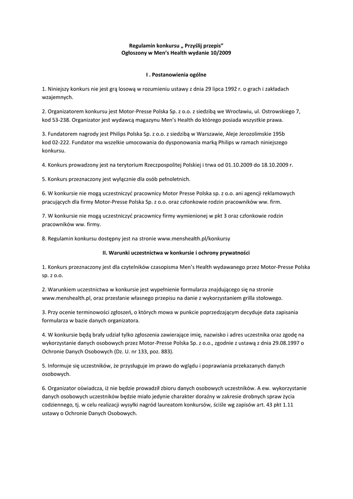 Regulamin konkursu „ Przyślij przepis” Ogłoszony w Men’s Health wydanie 10/2009 I . Postanowienia ogólne 1. Niniejszy konkurs nie jest grą losową w rozumieniu ustawy z dnia 29 lipca 1992 r. o grach i zakładach wzajemnych. 2. Organizatorem konkursu jest Motor-Presse Polska Sp. z o.o. z siedzibą we Wrocławiu, ul. Ostrowskiego 7, kod 53-238. Organizator jest wydawcą magazynu Men’s Health do którego posiada wszystkie prawa. 3. Fundatorem nagrody jest Philips Polska Sp. z o.o. z siedzibą w Warszawie, Aleje Jerozolimskie 195b kod 02-222. Fundator ma wszelkie umocowania do dysponowania marką Philips w ramach niniejszego konkursu. 4. Konkurs prowadzony jest na terytorium Rzeczpospolitej Polskiej i trwa od 01.10.2009 do 18.10.2009 r. 5. Konkurs przeznaczony jest wyłącznie dla osób pełnoletnich. 6. W konkursie nie mogą uczestniczyd pracownicy Motor Presse Polska sp. z o.o. ani agencji reklamowych pracujących dla firmy Motor-Presse Polska Sp. z o.o. oraz członkowie rodzin pracowników ww. firm. 7. W konkursie nie mogą uczestniczyd pracownicy firmy wymienionej w pkt 3 oraz członkowie rodzin pracowników ww. firmy. 8. Regulamin konkursu dostępny jest na stronie www.menshealth.pl/konkursy II. Warunki uczestnictwa w konkursie i ochrony prywatności 1. Konkurs przeznaczony jest dla czytelników czasopisma Men’s Health wydawanego przez Motor-Presse Polska sp. z o.o. 2. Warunkiem uczestnictwa w konkursie jest wypełnienie formularza znajdującego się na stronie www.menshealth.pl, oraz przesłanie własnego przepisu na danie z wykorzystaniem grilla stołowego. 3. Przy ocenie terminowości zgłoszeo, o których mowa w punkcie poprzedzającym decyduje data zapisania formularza w bazie danych organizatora. 4. W konkursie będą brały udział tylko zgłoszenia zawierające imię, nazwisko i adres uczestnika oraz zgodę na wykorzystanie danych osobowych przez Motor-Presse Polska Sp. z o.o., zgodnie z ustawą z dnia 29.08.1997 o Ochronie Danych Osobowych (Dz. U. nr 133, poz. 883). 5. Informuje się uczestników, że przysługuje im prawo do wglądu i poprawiania przekazanych danych osobowych. 6. Organizator oświadcza, iż nie będzie prowadził zbioru danych osobowych uczestników. A ew. wykorzystanie danych osobowych uczestników będzie miało jedynie charakter doraźny w zakresie drobnych spraw życia codziennego, tj. w celu realizacji wysyłki nagród laureatom konkursów, ściśle wg zapisów art. 43 pkt 1.11 ustawy o Ochronie Danych Osobowych. III. Nagrody 1. Nagrodą w konkursie jest: Grill stołowy Philips HD 4419 – wartość 449 pln brutto 2. Jeżeli wartośd nagród przyznawanych w konkursie nie przekracza kwoty 760 zł, nagrody te zgodnie z art. 21 ust. 1 pkt 68) ustawy z dnia 26 lipca 1991 r. o podatku dochodowym od osób fizycznych są zwolnione z opodatkowania, w pozostałych przypadkach koszty związane z opodatkowaniem nagrody ponoszą laureaci nagród, którzy zobowiązani są do uiszczenia podatku w wysokości 10 % wartości nagrody przed jej wydaniem, przez Fundatora. IV. Zasady wyłonienia zwycięzców spośród uczestników konkursu 1. Skład komisji konkursowej ustala Organizator. 2. Wyłonienie zwycięzców konkursu odbywa się następująco: Wśród wszystkich uczestników konkursu, których zgłoszenia zawierają wszystkie wymienione w dziale II Regulaminu elementy, komisja konkursowa dokona wyboru zgłoszenia, które jej zdaniem zawiera najciekawszy przepis na danie. 3. Uczestnik, którzy zdaniem komisji wyśle najlepsze zgłoszenie nabiera praw do otrzymania nagrody – jeśli: a) uczestnik, po skontaktowaniu się z nim przez Organizatora, potwierdzi fakt uczestnictwa w konkursie 4. W przypadku gdy: a) Organizator skontaktuje się z osobą wskazaną w dziale IV punkt 2, a ta nie potwierdzi (nie będzie wiedziała) o fakcie uczestniczenia w konkursie Organizatora b) Próby skontaktowania się Organizatora z osobą wskazaną w dziale IV punkt 2 będą bezskuteczne. Komisja konkursowa dokona ponownego wyłonienia zwycięzcy wśród pozostałych uczestników. V. Przekazanie nagrody 1. Fundator nagrody zobowiązuje się do przekazania osobom wskazanym w dziale IV punkt 2, nagród w terminie 30 dni od daty otrzymania od Organizatora listy zwycięzców. 2. Komisja konkursowa wybrana przez organizatora konkursu sporządzi protokół z przebiegu konkursu. VI. Reklamacje i właściwość sądu 1. Reklamacje mogą byd zgłaszane w formie pisemnej bezpośrednio na adres Organizatora konkursu w terminie 30 dni od daty wymagalności wydania nagród. 2. Postępowanie reklamacyjne trwa 14 dni. O wyniku postępowania reklamacyjnego Komisja pisemnie powiadamia uczestnika konkursu. 3. Po wyczerpaniu postępowania reklamacyjnego uczestnikowi przysługuje prawo do dochodzenia nie uwzględnionych roszczeo w sądzie właściwym dla siedziby organizatora konkursu. 4. Osoba wskazana w dziale IV punkt 2, nie może skutecznie domagad się od organizatora konkursu wydania nagrody, jeżeli upłynęło 60 dni od daty zakooczenia konkursu, a osoba wskazana w dziale IV punkt 2 nie odebrała nagrody w wyznaczonym terminie z przyczyn niezależnych od organizatora konkursu. Po tym terminie nagroda przepada na rzecz organizatora.