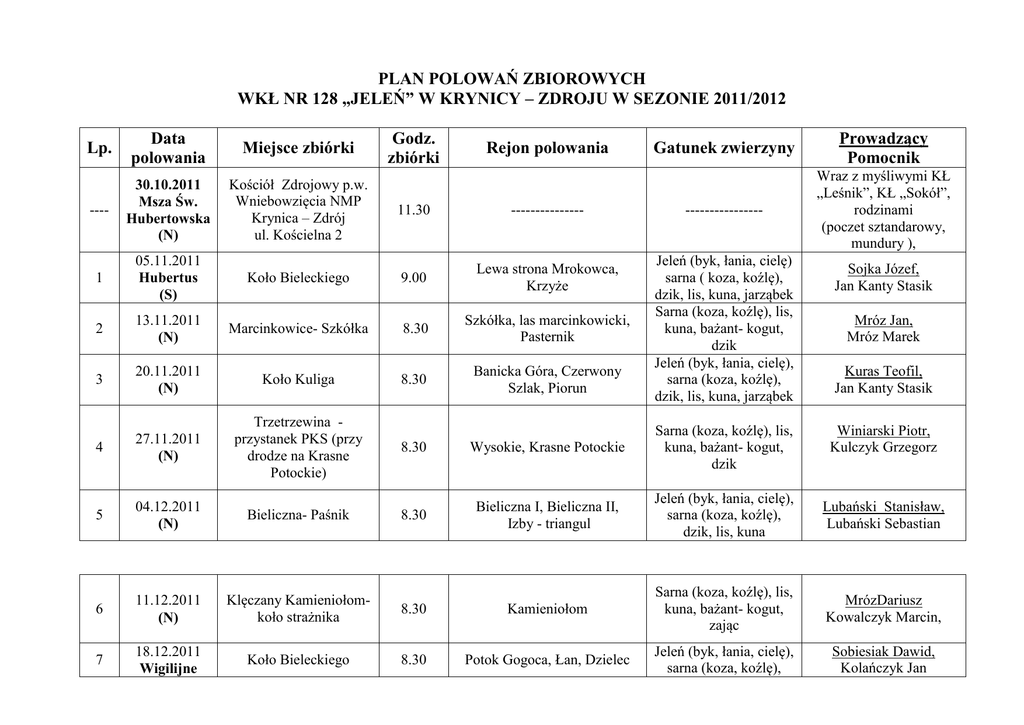 PLAN POLOWAŃ ZBIOROWYCH WKŁ NR 128 „JELEŃ” W KRYNICY – ZDROJU W SEZONIE 2011/2012 Lp. Data polowania Miejsce zbiórki ---- 30.10.2011 Msza Św. Hubertowska (N) Kościół Zdrojowy p.w. Wniebowzięcia NMP Krynica – Zdrój ul. Kościelna 2 1 05.11.2011 Hubertus (S) 2 3 Godz. zbiórki Rejon polowania Gatunek zwierzyny Prowadzący Pomocnik ---------------- Wraz z myśliwymi KŁ „Leśnik”, KŁ „Sokół”, rodzinami (poczet sztandarowy, mundury ), 11.30 --------------- Koło Bieleckiego 9.00 Lewa strona Mrokowca, Krzyże 13.11.2011 (N) Marcinkowice- Szkółka 8.30 Szkółka, las marcinkowicki, Pasternik 20.11.2011 (N) Koło Kuliga 8.30 Banicka Góra, Czerwony Szlak, Piorun 4 27.11.2011 (N) Trzetrzewina przystanek PKS (przy drodze na Krasne Potockie) 8.30 Wysokie, Krasne Potockie Sarna (koza, koźlę), lis, kuna, bażant- kogut, dzik Winiarski Piotr, Kulczyk Grzegorz 5 04.12.2011 (N) Bieliczna- Paśnik 8.30 Bieliczna I, Bieliczna II, Izby - triangul Jeleń (byk, łania, cielę), sarna (koza, koźlę), dzik, lis, kuna Lubański Stanisław, Lubański Sebastian 6 11.12.2011 (N) Klęczany Kamieniołomkoło strażnika 8.30 Kamieniołom Sarna (koza, koźlę), lis, kuna, bażant- kogut, zając MrózDariusz Kowalczyk Marcin, 7 18.12.2011 Wigilijne Koło Bieleckiego 8.30 Potok Gogoca, Łan, Dzielec Jeleń (byk, łania, cielę), sarna (koza, koźlę), Sobiesiak Dawid, Kolańczyk Jan Jeleń (byk, łania, cielę) sarna ( koza, koźlę), dzik, lis, kuna, jarząbek Sarna (koza, koźlę), lis, kuna, bażant- kogut, dzik Jeleń (byk, łania, cielę), sarna (koza, koźlę), dzik, lis, kuna, jarząbek Sojka Józef, Jan Kanty Stasik Mróz Jan, Mróz Marek Kuras Teofil, Jan Kanty Stasik (N) dzik, lis, kuna 8 24.12.2011 (S) Rdziostów- Szkoła Glinianka, las na Hasznej Sarna (koza, koźlę), lis, kuna, bażant- kogut, dzik Orzechowski Paweł, Czarnopiński Marcin 9 01.01.2012 (N) Droga betonowa (przy drodze na Dzielec) 8.30 Wrzosy, leśniczówka Jeleń (byk, łania, cielę), sarna ( koza, koźlę), dzik, lis, kuna Gorczowski Krzysztof, Kożuch Piotr 10 08.01.2012 (N) Trzetrzewina parking koło Kościoła 8.30 Potoki trzetrzewiańskie, las ( lewa i prawa strona) przy polu Ligaszewskiego Sarna (koza, koźlę), lis, kuna, bażant- kogut, dzik Czarnopiński Krzysztof, Żak Piotr 11 14.01.2012 Zakończenie sezonu – domek myśliwski (S) Izby – triangul, Bieliczna I, Bieliczna II Jeleń (byk, łania, cielę), sarna ( koza, koźlę), dzik, lis, kuna Lubańskie Sebastian, Mitręga Kazimierz Izby- stadnina 8.30 8.30 UWAGI: 1.W zależności od stopnia realizacji RPŁ Zarząd Koła może zwiększyć lub zmniejszyć ilość polowań zbiorowych. 2.W polowaniu na zające nie biorą udziału psy. 3.Każdy myśliwy, biorący udział w polowaniu zbiorowym , zobowiązany jest do posiadania na ubiorze elementów jaskrawych (np. opaska, czapka, kamizelka itp.). 4.Prowadzący polowanie wyznacza myśliwego noszącego apteczkę (torbę sanitarną). 5.Liczba naganki wynosi w zależności od potrzeb do czterech osób (pełnoletnich). 6. (S) – sobota; (N) – niedziela. Za Zarząd Koła