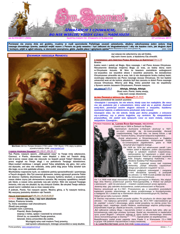 UWAŻAJCIE I CZUWAJCIE, BO NIE WIECIE, KIEDY CZAS […] NADEJDZIE« » NR XLVIII/2011 (502) GAZETKA PARAFII ŚW. ZYGMUNTA W SŁOMCZYNIE 27 LISTOPADA 2011 Ponieważ nie znamy dnia ani godziny, musimy w myśl upomnienia Pańskiego czuwać ustawicznie, abyśmy zakończywszy jeden jedyny bieg naszego ziemskiego żywota, zasłużyli wejść razem z Panem na gody weselne i być zaliczeni do błogosławionych i aby nie kazano nam, jak sługom złym i leniwym, pójść w ogień wieczny, w ciemności zewnętrzne, gdzie „będzie płacz i zgrzytanie zębów”Sobór Watykański II, konst. Lumen gentium, 48. [KKK, 1036] PIERWSZA NIEDZIELA ADWENTU Już więcej nie odwrócimy się od Ciebie, daj nam nowe życie, a będziemy Cię chwalili. Z PIERWSZEGO LISTU ŚWIĘTEGO PAWŁA APOSTOŁA DO KORYNTIAN1 Kor 1, 3-9 Bracia: Łaska wam i pokój od Boga, Ojca naszego, i od Pana Jezusa Chrystusa. Nieustannie dziękuję mojemu Bogu za was, za łaskę daną wam w Chrystusie Jezusie. W Nim to bowiem zostaliście wzbogaceni we wszystko: we wszelkie słowo i wszelkie poznanie, bo świadectwo Chrystusowe utrwaliło się w was, tak iż nie doznajecie braku żadnej łaski, oczekując objawienia się Pana naszego Jezusa Chrystusa. On też będzie umacniał was aż do końca, abyście byli bez zarzutu w dzień Pana naszego Jezusa Chrystusa. Wierny jest Bóg, który powołał nas do wspólnoty z Synem swoim Jezusem Chrystusem, Panem naszym. AKLAMACJAPs 85, 8 Alleluja, Alleluja, Alleluja Okaż nam, Panie, łaskę swoją, i daj nam swoje zbawienie. SŁOWA EWANGELII WEDŁUG ŚW. MARKAMk 13, 33-37 Jezus powiedział do swoich uczniów: »Uważajcie i czuwajcie, bo nie wiecie, kiedy czas ten nadejdzie. Bo rzecz ma się podobnie jak z człowiekiem, który udał się w podróż. Zostawił swój dom, powierzył swoim sługom staranie o wszystko, każdemu wyznaczył zajęcie, a odźwiernemu przykazał, żeby czuwał. Czuwajcie więc, bo nie wiecie, kiedy pan domu przyjdzie: z wieczora czy o północy, czy o pianiu kogutów, czy rankiem. By niespodzianie przyszedłszy, nie zastał was śpiących. Lecz co wam mówię, mówię wszystkim: Czuwajcie«. PATRON TYGODNIA: BŁ. LUDWIK ROCH GIETYNGIER, MĘCZENNIK BÓG OJCIEC, BATONI, Pompeo Girolamo (1708, Lukka - 1787, Rzym), 1779, olejny na płótnie, prywatna kolekcja; źródło: www.topofart.com Z KSIĘGI PROROKA IZAJASZAIz 63, 16b-17. 19b; 64, 3-7 Tyś, Panie, naszym ojcem, „Odkupiciel nasz” to Twoje imię odwieczne. Czemuż, o Panie, dozwalasz nam błądzić z dala od Twoich dróg, tak iż serce nasze staje się nieczułe na bojaźń przed Tobą? Odmień się przez wzgląd na Twoje sługi i na pokolenia Twojego dziedzictwa. Obyś rozdarł niebiosa i zstąpił, przed Tobą skłębiłyby się góry. Ani ucho nie słyszało, ani oko nie widziało, żeby jakiś bóg poza Tobą działał tyle dla tego, co w nim pokłada ufność. Wychodzisz naprzeciw tych, co radośnie pełnią sprawiedliwość i pamiętają o Twych drogach. Oto Tyś zawrzał gniewem, żeśmy zgrzeszyli przeciw Tobie od dawna i byliśmy zbuntowani. My wszyscy byliśmy skalani, a wszystkie nasze dobre czyny jak skrwawiona szmata. My wszyscy opadliśmy zwiędli jak liście, a nasze winy poniosły nas jak wicher. Nikt nie wzywał Twojego imienia, nikt się nie zbudził, by się chwycić Ciebie. Bo skryłeś Twoje oblicze przed nami i oddałeś nas w moc naszej winy. A jednak, Panie, Tyś naszym ojcem. Myśmy gliną, a Ty naszym twórcą. My wszyscy jesteśmy dziełem rąk Twoich. PSALM RESPONSORYJNYPs 80, 2ac i 3b,15-16,18-19 REFREN: Odnów nas, Boże, i daj nam zbawienie Usłysz, Pasterzu Izraela, Ty, który zasiadasz nad cherubinami. Zbudź swą potęgę i przyjdź nam z pomocą. Powróć, Boże Zastępów, wejrzyj z nieba, spójrz i nawiedź tę winorośl. Chroń to, co zasadziła Twoja prawica, latorośl, którą umocniłeś dla siebie. Wyciągnij rękę nad mężem Twej prawicy, nad synem człowieczym, którego umocniłeś w swej służbie. Portal parafialny: www.swzygmunt.knc.pl Urodził się w 1904 w Żarkach na Śląsku. Seminarium duchowne w Kielcach ukończył w 1927, po czym przeniósł się do nowo-powstałej diecezji częstochowskiej. Tego też roku, na Jasnej Górze, z rąk bpa Teodora Kubiny, otrzymał święcenia kapłańskie… Został wikariuszem w Strzemieszycach w Zagłębiu Dąbrowskim. Jednocześnie kontynuował studia na Uniwersytecie Jagiellońskim, gdzie w 1929 otrzymał tytuł magistra teologii… Od 1929 do 1934 był wikariuszem parafii i prefektem szkół w Będzinie, potem nauczycielem religii w szkołach średnich Częstochowy. Jednocześnie był kapelanem u sióstr zmartwychwstanek. Pełnił też obowiązki asystenta Koła Związku Inteligencji Katolickiej i moderatora Sodalicji Pań Nauczycielek. Ok. 1937 rozpoczął pracę nad rozprawą doktorską „Dzieje dekanatu częstochowskiego pod zaborem rosyjskim” na UJ… Wielość podjętych zobowiązań i związane z nimi obciążenie sprawiły, iż podupadł na zdrowiu i w 1939 musiał poddać się leczeniu klinicznemu w Krakowie… Od 1.IX.1939 miał objąć stanowisko dyrektora gimnazjum w Wieluniu. Nie zdążył: tego dnia Niemcy przekroczyli granice Rzeczypospolitej, a Wieluń był jednym z pierwszych – jeśli nie pierwszym – miastem zaatakowanym przez agresora… Jesienią więc, gdy zabrakło duszpasterza, został proboszczem w Raczynie. Niemcy aresztowali go 6.X.1941. Przewieziono go, z wszystkimi pozostałymi kapłanami powiatu wieluńskiego, do obozu przejściowego w Konstantynowie, a następnie 30.X znalazł się w niemieckim obozie koncentracyjnym KL Dachau. Odtąd był już tylko numerem: 28288. W Dachau męczeńska śmierć przyszła szybko. Po przybyciu do obozu jego stan zdrowia – nie najlepszy generalnie - pogorszył się. 30.XI.1941 odprowadzono go do „szpitala” („rewiru”) obozowego, gdzie został powalony na ziemię przez funkcyjnego kapo, niejakiego Józefa Heidena, austriackiego więźnia politycznego. Zwyr