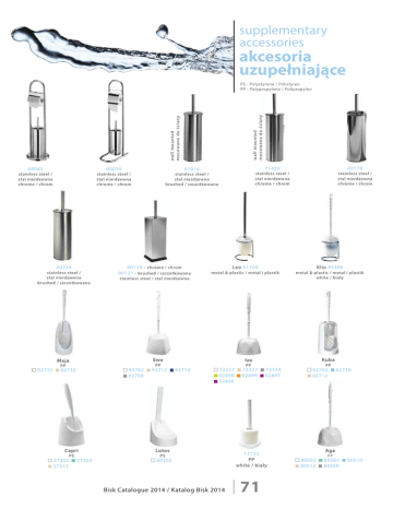 supplementary accessories akcesoria uzupełniające wall m o u nted mocowana do ś c iany wall m o unted m ocowana do ś cia ny PS - Polystyrene / Polistyren PP - Polypropylene / Polipropylen 00085 00039 01016 71429 00176 stainless steel / stal nierdzewna chrome / chrom stainless steel / stal nierdzewna chrome / chrom stainless steel / stal nierdzewna brushed / szczotkowana stainless steel / stal nierdzewna chrome / chrom stainless steel / stal nierdzewna chrome / chrom 00234 stainless steel / stal nierdzewna brushed / szczotkowana 02722 00119 - chrome / chrom 00121 - brushed / szczotkowana Leo 61100 Klio 93300 metal & plastic / metal i plastik metal & plastic / metal i plastik white / biały stainless steel / stal nierdzewna Maja Ewa Iza PP PP PP 02732 93702 93709 93712 Capri Lotos PS PS 27302 27312 27303 93714 72327 02898 02896 80202 Bisk Catalogue 2014 / Katalog Bisk 2014 72337 02899 Kuba PP 72334 02897 17152 PP white / biały 71 02702 02712 02710 Aga PP 80502 80512 80503 80509 80510