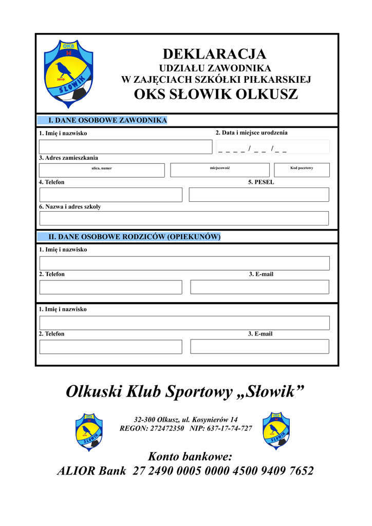 DEKLARACJA UDZIAŁU ZAWODNIKA W ZAJĘCIACH SZKÓŁKI PIŁKARSKIEJ OKS SŁOWIK OLKUSZ I. DANE OSOBOWE ZAWODNIKA 2. Data i miejsce urodzenia 1. Imię i nazwisko _ _ _ _ / _ _ /_ _ 3. Adres zamieszkania ulica, numer miejscowość 4. Telefon Kod pocztowy 5. PESEL 6. Nazwa i adres szkoły II. DANE OSOBOWE RODZICÓW (OPIEKUNÓW) 1. Imię i nazwisko 2. Telefon 3. E-mail 1. Imię i nazwisko 2. Telefon 3. E-mail Olkuski Klub Sportowy „Słowik” 32-300 Olkusz, ul. Kosynierów 14 REGON: 272472350 NIP: 637-17-74-727 Konto bankowe: ALIOR Bank 27 2490 0005 0000 4500 9409 7652 IV. ORGANIZATORZY NIE PONOSZĄ ODPOWIDZIALNOŚCI ZA WARTOŚCIOWE RZECZY (W TYM TELEFONY KOMÓRKOWE) POZOSTAWIONE LUB ZAGUBIONE PRZEZ UCZESTNIKÓW ZAJĘĆ. V. OŚWIADCZENIE RODZICÓW (OPIEKUNÓW) 1. Wyrażam zgodę na uczestnictwo mojego dziecka w zajęciach szkółki piłkarskiej OKS „SŁOWIK” Olkusz. 2. Wyrażam zgodę na przetwarzanie moich danych osobowych zawartych w deklaracji udziału Szkółki Piłkarskiej OKS „SŁOWIK” w celach związanych z działalnością OKS „SŁOWIK”, zgodnie z ustawą z dnia 29/08/1997 o Ochronie Danych Osobowych (Dz.U.nr 133 poz. 883). 3. Oświadczam, że wyrażam zgodę na umieszczanie zdjęć i filmów zawierających wizerunek mojego dziecka zarejestrowany podczas realizacji zajęć, zawodów, obozów i uroczystości organizowanych oraz w których bierze udział Olkuski Klub Sportowy „SŁOWIK” do celów związanych z promocją i funkcjonowaniem Klubu. Wyrażenie zgody jest jednoznaczne z tym, że fotografie, filmy lub nagrania wykonane podczas zajęć mogą zostać umieszczone na stronie internetowej Klubu, wykorzystane w materiałach promocyjnych (broszurach, ulotkach, gazetkach, itp.) oraz opublikowane w mediach tj. telewizji i prasie. Oświadczam, że niniejszą zgodę udzielam dobrowolnie i nieodpłatnie. 4. Zobowiązuję się do aktualizowania w razie konieczności danych kontaktowych zawartych w niniejszej deklaracji ponieważ mogą być one wykorzystane dla bezpieczeństwa mojego dziecka. 5. Zapoznałem się i zgadzam się z zamieszczonym poniżej regulaminem Szkółki Piłkarskiej OKS „SŁOWIK”. 6. Potwierdzam poprawność danych i dobrowolność zgłoszenia. OLKUSKI KLUB SPORTOWY „SŁOWIK” Regulamin Szkółki Piłkarskiej OKS „SŁOWIK” 1. Zajęcia treningowe Szkółki Piłkarskiej OKS SŁOWIK odbywają się w ramach Olkuskiego Klubu Sportowego 2. „SŁOWIK”. Wpisowe pobierane od nowych członków Szkółki Piłkarskiej OKS „SŁOWIK” wynosi 35 PLN. 3. Składka członkowska za uczestnictwo w zajęciach Szkółki Piłkarskiej OKS „SŁOWIK” w kolejnych miesiącach 4. 5. 6. 7. 8. 9. jest odgórnie ustalona i należy ją wpłacać z góry do 10-tego każdego miesiąca na konto Klubu. Wysokość składki może ulec zmianie - regulacje w tym względzie należą do Zarządu OKS „SŁOWIK”. Szkółka Piłkarska OKS „SŁOWIK” nie dokonuje zwrotu składki za nieobecność zawodnika na zajęciach (wyjątek stanowi nieobecność przez cały miesiąc - bez opłat). Zawodnicy mogą po promocyjnych cenach kupić sprzęt sportowy (w tym stroje). Sprzęt zakupiony przez zawodnika lub jego opiekuna stanowi ich własność. Zawodnicy zobowiązani są godnie reprezentować Szkółkę Piłkarską OKS „SŁOWIK” na zajęciach sportowych i w życiu codziennym. Zawodnicy są zobowiązani do podnoszenia swoich umiejętności sportowych i taktycznych. Rodzice i opiekunowie uczestniczący w zajęciach zobowiązani są do kulturalnego zachowania, nie wchodzenia na boisko, nie przeszkadzania w zajęciach. Złamanie regulaminu może być podstawą do zaprzestania szkolenia zawodnika. Podpis rodzica i kandydata do Szkółki Piłkarskiej OKS „Słowik” Olkusz