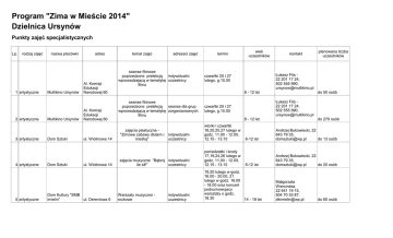 Program "Zima w Mieście 2014" Dzielnica Ursynów Punkty zajęć specjalistycznych Lp. rodzaj zajęć 1 artystyczne 2 artystyczne 3 artystyczne 4 artystyczne 5 artystyczne nazwa placówki Multikino Ursynów Multikino Ursynów Dom Sztuki Dom Sztuki adres Al. Komisji Edukacji Narodowej 60 Al. Komisji Edukacji Narodowej 60 ul. Wiolinowa 14 ul. Wiolinowa 14 Dom Kultury "SMB Imielin" ul. Dereniowa 6 temat zajęć adresaci zajęć seanse filmowe poprzedzone prelekcją indywidualni wprowadzającą w tematykę uczestnicy filmu termin wiek uczestników kontakt Łukasz Fila 22 201 17 24, 502 555 990, [email protected] czwartki 20 i 27 lutego, g.10.00 8 - 12 lat seanse filmowe poprzedzone prelekcją seanse dla grup wprowadzającą w tematykę zorganizowanych filmu 8 - 12 lat indywidualni uczestnicy zajęcia muzyczne "Bębnij indywidualni ile sił!" uczestnicy poniedziałki i środy 17,19,24,26 lutego w godz. 11.00 - 12.00, 12.15 - 13.15 Warszaty muzyczno rockowe indywidualni uczestnicy do 50 osób Łukasz Fila 22 201 17 24, 502 555 990, [email protected] czwartki 20 i 27 lutego, g.10.00 wtorki i czwartki 18,20,25,27 lutego w godz. 11.00 - 12.00, 12.15 - 13.15 zajęcia plastyczne "Zimowe zabawy dłutem i kredką" planowana liczba uczestników do 270 osób 6-12 lat Andrzej Bukowiecki, 22 643 79 35, [email protected] do 13 osób 6-12 lat Andrzej Bukowiecki, 22 643 79 35, [email protected] do 20 osób 19,20 lutego w godz. 16.00 - 20.00, 21 lutego w godz. 16.00 - 18.00 oraz koncert podsumowujacy warsztaty o godz. 18.30 14 - 18 lat Małgorzata Wiercinska, 22 641 19 15, 504 70 30 87, [email protected] do 60 osób 6 sportowe 7 sportowe 8 sportowe Szkoła Podstawowa nr 340 ul. Lokajskiego 3 Zajęcia z piłki nożnej. W godz. 9.00-11.00 – zajęcia dla dzieci w wieku 6-7 lat, 11.00 -13.00 – dla dzieci w wieku 8-10 lat, 13.00-15.00 – zajęcia dla dzieci w wieku 11-13 lat, 15.00-17.00 – zajęcia dla młodzieży w wieku 14-16 lat. Lodowisko Kampus Szkoły Głównej Gospodarstwa Wiejskiego Bezpłatne udostępnianie lodowiska dla uczestników akcji "Zima w Mieście". 21 i 28 lutego od godz. 12.00 prowadzone będą łyżwiarskie konkursy ul. sprawnościowe pod opieką Nowoursynowska instruktorów. Wypożyczenie 161 łyżew odpłatne. Lodowisko "Figlowisko" ul. Komisji Edukacji Narodowej 60, obok "Multikina" Bezpłatne udostepnianie lodowiska dla dzieci i młodziezy w wieku do 19 lat. Wypożyczenie łyżew odpłatne. od poniedziałku do piątku - 17.02.201428.02.2014, g. 9.0017.00 indywidualni uczestnicy 6-16 lat Mikołaj Winnicki, 607 751 134, [email protected] do 60 osób 6-18 lat Karolina Rejniak, 606 977 850, [email protected] do 250 osób do 19 lat Lodowisko Figlowisko Biuro, 504245910, [email protected] do 450 osób od poniedziałku do piątku - 17.02.201428.02.2014, g. 10.0015.00 indywidualni uczestnicy oraz grupy zorganizowane indywidualni uczestnicy oraz grupy zorganizowane od poniedziałku do piątku - 17.02.201428.02.2014, g. 9.0012.00