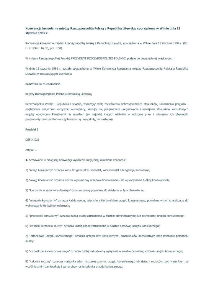 Konwencja konsularna między Rzecząpospolitą Polską a Republiką Litewską, sporządzona w Wilnie dnia 13 stycznia 1992 r. Konwencja konsularna między Rzecząpospolitą Polską a Republiką Litewską, sporządzona w Wilnie dnia 13 stycznia 1992 r. (Dz. U. z 1994 r. Nr 30, poz. 108) W imieniu Rzeczypospolitej Polskiej PREZYDENT RZECZYPOSPOLITEJ POLSKIEJ podaje do powszechnej wiadomości: W dniu 13 stycznia 1992 r. została sporządzona w Wilnie Konwencja konsularna między Rzecząpospolitą Polską a Republiką Litewską w następującym brzmieniu: KONWENCJA KONSULARNA między Rzecząpospolitą Polską a Republiką Litewską Rzeczpospolita Polska i Republika Litewska, wyrażając wolę zacieśnienia dobrosąsiedzkich stosunków, umocnienia przyjaźni i pogłębienia wzajemnie korzystnej współpracy, kierując się pragnieniem uregulowania i rozwijania stosunków konsularnych między obydwoma Państwami na zasadach jak najdalej idących ułatwień w ochronie praw i interesów ich obywateli, postanowiły zawrzeć Konwencję konsularną i uzgodniły, co następuje: Rozdział I DEFINICJE Artykuł 1 1. Stosowane w niniejszej konwencji wyrażenia mają niżej określone znaczenie: 1) "urząd konsularny" oznacza konsulat generalny, konsulat, wicekonsulat lub agencję konsularną; 2) "okręg konsularny" oznacza obszar wyznaczony urzędowi konsularnemu do wykonywania funkcji konsularnych; 3) "kierownik urzędu konsularnego" oznacza osobę powołaną do działania w tym charakterze; 4) "urzędnik konsularny" oznacza każdą osobę, włącznie z kierownikiem urzędu konsularnego, powołaną w tym charakterze do wykonywania funkcji konsularnych; 5) "pracownik konsularny" oznacza każdą osobę zatrudnioną w służbie administracyjnej lub technicznej urzędu konsularnego; 6) "członek personelu służby" oznacza każdą osobę zatrudnioną w służbie domowej urzędu konsularnego; 7) "członkowie urzędu konsularnego" oznacza urzędników konsularnych, pracowników konsularnych oraz członków personelu służby; 8) "członek personelu prywatnego" oznacza osobę zatrudnioną wyłącznie w służbie prywatnej członka urzędu konsularnego; 9) "członek rodziny" oznacza małżonka albo małżonkę członka urzędu konsularnego, ich dzieci i rodziców, pod warunkiem że wspólnie z nim zamieszkują i są na utrzymaniu członka urzędu konsularnego; 10) "pomieszczenia konsularne" oznacza budynki lub części budynków, łącznie z rezydencją kierownika urzędu, i tereny przyległe do nich, niezależnie od tego, czyją są własnością, jeśli są używane wyłącznie dla celów urzędu konsularnego; 11) "archiwa konsularne" oznacza wszystkie pisma, dokumenty, korespondencję, książki, filmy, techniczne zasoby gromadzenia i wykorzystania informacji, rejestru urzędu konsularnego oraz szyfry i kody, kartoteki, jak również przedmioty wyposażenia dla ich ochrony i przechowywania; 12) "statek" oznacza każdą cywilną jednostkę pływającą, upoważnioną do podnoszenia bandery Państwa wysyłającego i zarejestrowaną w tym Państwie; 13) "statek powietrzny" oznacza każdą cywilną jednostkę latającą uprawnioną do używania oznaki przynależności Państwa wysyłającego i zarejestrowaną w tym Państwie. 2. Postanowienia niniejszej konwencji dotyczące obywateli Państwa wysyłającego mają odpowiednie zastosowanie również do osób prawnych, włącznie ze spółkami handlowymi, które ustanowione są zgodnie z ustawami i innymi przepisami Państwa wysyłającego i mają siedzibę w tym Państwie. Rozdział II USTANOWIENIE URZĘDÓW KONSULARNYCH ORAZ 0 MIANOWANIE CZŁONKÓW URZĘDU KONSULARNEGO Artykuł 2 1. Urząd konsularny może być ustanowiony na terytorium Państwa przyjmującego jedynie za zgodą tego Państwa. 2. Siedziba urzędu konsularnego, jego klasa i okręg konsularny są ustalane przez Państwo wysyłające i podlegają aprobacie Państwa przyjmującego. 3. Późniejsze zmiany siedziby urzędu konsularnego, jego klasy i okręgu konsularnego mogą być dokonywane przez Państwo wysyłające za zgodą Państwa przyjmującego. Artykuł 3 1. Kierownik urzędu konsularnego będzie dopuszczony do wykonywania swych funkcji po przedłożeniu listów komisyjnych i po udzieleniu exequatur przez Państwo przyjmujące. 2. Państwo wysyłające przekazuje listy komisyjne o wyznaczeniu kierownika urzędu konsularnego za pośrednictwem swojego przedstawicielstwa dyplomatycznego lub inną stosowną drogą ministerstwu spraw zagranicznych Państwa przyjmującego. Listy komisyjne zawierają imiona, nazwisko i stopień kierownika urzędu konsularnego, obywatelstwo, okręg konsularny, w którym ma on wykonywać swoje funkcje, oraz siedzibę urzędu konsularnego. 3. Po złożeniu listów komisyjnych o wyznaczeniu kierownika urzędu konsularnego Państwo przyjmujące udzieli mu w możliwie najkrótszym czasie exequatur. 4. Do czasu udzielenia exequatur Państwo przyjmujące może wydać kierownikowi urzędu konsularnego zgodę na tymczasowe wykonywanie jego funkcji. 5. Kierownik urzędu konsularnego może przystąpić do wykonywania swych funkcji wówczas, gdy Państwo przyjmujące wyda mu exequatur lub inne upoważnienie. 6. Z chwilą dopuszczenia do wykonywania funkcji, nawet tymczasowo, władze Państwa przyjmującego podejmą niezbędne środki, aby kierownik urzędu konsularnego mógł wykonywać swoje funkcje. Artykuł 4 1. Państwo wysyłające powiadamia ministerstwo spraw zagranicznych Państwa przyjmującego o imieniu, nazwisku, obywatelstwie, stopniu i stanowisku urzędnika konsularnego, wysyłanego do urzędu konsularnego nie w charakterze kierownika urzędu, a także o imieniu, nazwisku, obywatelstwie i stanowisku pracownika konsularnego. 2. Właściwe organy Państwa przyjmującego wydają bezpłatnie każdemu urzędnikowi konsularnemu dokument stwierdzający jego tożsamość i stopień. 3. Postanowienia ust. 2 niniejszego artykułu stosuje się także do pracowników konsularnyc