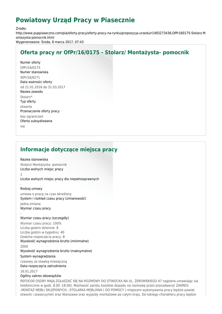 Powiatowy Urząd Pracy w Piasecznie Źródło: http://www.puppiaseczno.com/pia/oferty-pracy/oferty-pracy-na-rynku/propozycja-urzedu/r1493273436,OfPr160175-Stolarz-M ontazysta-pomocnik.html Wygenerowano: Środa, 8 marca 2017, 07:43 Oferta pracy nr OfPr/16/0175 - Stolarz/ Montażysta- pomocnik Numer oferty OfPr/16/0175 Numer stanowiska StPr/16/6271 Data ważności oferty od 21.01.2016 do 31.03.2017 Nazwa zawodu Stolarz* Typ oferty otwarta Przenaczenie oferty pracy bez ograniczeń Oferta subsydiowana nie Informacje dotyczące miejsca pracy Nazwa stanowiska Stolarz/ Montażysta- pomocnik Liczba wolnych miejsc pracy 1 Liczba wolnych miejsc pracy dla niepełnosprawnych Rodzaj umowy umowa o pracę na czas określony System i rozkład czasu pracy (zmianowość) jedna zmiana Wymiar czasu pracy Wymiar czasu pracy (szczegóły) Wymiar czasu pracy: 100% Liczba godzin dziennie: 8 Liczba godzin w tygodniu: 40 Godzina rozpoczęcia pracy: 8 Wysokość wynagrodzenia brutto (minimalne) 2000 Wysokość wynagrodzenia brutto (maksymalne) System wynagradzania czasowy ze stawką miesięczną Data rozpoczęcia zatrudnienia 16.01.2017 Ogólny zakres obowiązków REFDO30 OSOBY MAJĄ ZGŁASZAĆ SIĘ NA ROZMOWY DO OTWOCKA NA UL. ŻEROMSKIEGO 47 najpierw umawiając się telefonicznie w godz. 8.00 -18.00). Możliwość zwrotu kosztów dojazdu na rozmowę przez pracodawcę! ZAKRES: -MONTAŻ MEBLI SKLEPOWYCH, -STOLARKA MEBLOWA ( DO POMOCY ) miejscem wykonywania pracy będzie powiat otwocki i piaseczyński oraz Warszawa oraz wyjazdy montażowe po całym kraju. Do takiego charakteru pracy będzie więc mile widziane prawo jazdy kat. B lub chęć do ich zrobienia Miejsce pracy ul. Rudka 16, 05-462 Wiązowna, tel.: 697932474 Oczekiwania pracodawcy Poziom wykształcenia podstawowe Kierunek wyksztalcenia Wymagania Uprawnienia: prawo jazdy kat B Pracodawca zapewnia pracownikowi zakwaterowanie Pracodawca ponosi koszty zakwaterowania Pracodawca zapewnia pracownikowi wyżywienie Finasowanie kosztów podróży lub przeprowadzki Aplikowanie Sposób aplikowania na ofertę pracy Za pośrednictwem PUP Język aplikowania polski Wymagane dokumenty skierowanie do pracy Pracodawca YAKASHAFA Łukasz Duliński ul. Danków 27, 66-500 Danków - Osoba kontaktowa w urzędzie pracy Kamińska Małgorzata 227376233 w. 233 Drukuj Generuj PDF Powiadom znajomego Wstecz
