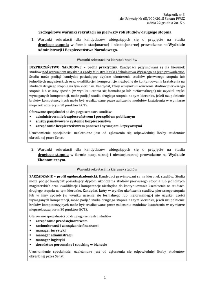 Załącznik nr 3 do Uchwały Nr 65/000/2015 Senatu PWSZ z dnia 22 grudnia 2015 r. Szczegółowe warunki rekrutacji na pierwszy rok studiów drugiego stopnia 1. Warunki rekrutacji dla kandydatów ubiegających się o przyjęcie na studia drugiego stopnia w formie stacjonarnej i niestacjonarnej prowadzone na Wydziale Administracji i Bezpieczeństwa Narodowego. Warunki rekrutacji na kierunek studiów BEZPIECZEŃSTWO NARODOWE – profil praktyczny. Kandydaci przyjmowani są na kierunek studiów pod warunkiem uzyskania zgody Ministra Nauki i Szkolnictwa Wyższego na jego prowadzenie. Studia może podjąć kandydat posiadający dyplom ukończenia studiów pierwszego stopnia lub jednolitych magisterskich oraz kwalifikacje i kompetencje niezbędne do kontynuowania kształcenia na studiach drugiego stopnia na tym kierunku. Kandydat, który w wyniku ukończenia studiów pierwszego stopnia lub w inny sposób (w wyniku uczenia się formalnego lub nieformalnego) nie uzyskał części wymaganych kompetencji, może podjąć studia drugiego stopnia na tym kierunku, jeżeli uzupełnienie braków kompetencyjnych może być zrealizowane przez zaliczenie modułów kształcenia w wymiarze nieprzekraczającym 30 punktów ECTS. Oferowane specjalności od drugiego semestru studiów: administrowanie bezpieczeństwem i porządkiem publicznym służby państwowe w systemie bezpieczeństwa zarządzanie bezpieczeństwem państwa i sytuacjami kryzysowymi Uruchomienie specjalności uzależnione jest od zgłoszenia się odpowiedniej liczby studentów określonej przez Senat. 2. Warunki rekrutacji dla kandydatów ubiegających się o przyjęcie na studia drugiego stopnia w formie stacjonarnej i niestacjonarnej prowadzone na Wydziale Ekonomicznym. Warunki rekrutacji na kierunek studiów ZARZĄDZANIE – profil ogólnoakademicki. Kandydaci przyjmowani są na kierunek studiów. Studia może podjąć kandydat posiadający dyplom ukończenia studiów pierwszego stopnia lub jednolitych magisterskich oraz kwalifikacje i kompetencje niezbędne do kontynuowania kształcenia na studiach drugiego stopnia na tym kierunku. Kandydat, który w wyniku ukończenia studiów pierwszego stopnia lub w inny sposób (w wyniku uczenia się formalnego lub nieformalnego) nie uzyskał części wymaganych kompetencji, może podjąć studia drugiego stopnia na tym kierunku, jeżeli uzupełnienie braków kompetencyjnych może być zrealizowane przez zaliczenie modułów kształcenia w wymiarze nieprzekraczającym 30 punktów ECTS. Oferowane specjalności od drugiego semestru studiów: zarządzanie przedsiębiorstwem rachunkowość i zarządzanie finansami manager turystyki manager administracji manager logistyki doradztwo personalne i coaching w biznesie Uruchomienie specjalności uzależnione jest od zgłoszenia się odpowiedniej liczby studentów określonej przez Senat. 1 Załącznik nr 3 do Uchwały Nr 65/000/2015 Senatu PWSZ z dnia 22 grudnia 2015 r. FINANSE I RACHUNKOWOŚC – profil praktyczny. Kandydaci przyjmowani są na kierunek studiów pod warunkiem uzyskania zgody Ministra Nauki i Szkolnictwa Wyższego na jego prowadzenie. Studia może podjąć kandydat posiadający dyplom ukończenia studiów pierwszego stopnia lub jednolitych magisterskich oraz kwalifikacje i kompetencje niezbędne do kontynuowania kształcenia na studiach drugiego stopnia na tym kierunku. Kandydat, który w wyniku ukończenia studiów pierwszego stopnia lub w inny sposób (w wyniku uczenia się formalnego lub nieformalnego) nie uzyskał części wymaganych kompetencji, może podjąć studia drugiego stopnia na tym kierunku, jeżeli uzupełnienie braków kompetencyjnych może być zrealizowane przez zaliczenie modułów kształcenia w wymiarze nieprzekraczającym 30 punktów ECTS. Oferowane specjalności od drugiego semestru studiów: doradztwo finansowo-księgowe rachunkowość i finanse przedsiębiorstw bankowość i doradztwo inwestycyjne Uruchomienie specjalności uzależnione jest od zgłoszenia się odpowiedniej liczby studentów określonej przez Senat. 3. Warunki rekrutacji dla kandydatów ubiegających się o przyjęcie na studia drugiego stopnia w formie stacjonarnej i niestacjonarnej prowadzone na Wydziale Humanistycznym. Warunki rekrutacji na kierunek studiów FILOLOGIA POLSKA – profil ogólnoakademicki. Kandydaci przyjmowani są na kierunek studiów. Studia może podjąć kandydat posiadający dyplom ukończenia studiów pierwszego stopnia lub jednolitych magisterskich oraz kwalifikacje i kompetencje niezbędne do kontynuowania kształcenia na studiach drugiego stopnia na tym kierunku. Kandydat, który w wyniku ukończenia studiów pierwszego stopnia lub w inny sposób (w wyniku uczenia się formalnego lub nieformalnego) nie uzyskał części wymaganych kompetencji, może podjąć studia drugiego stopnia na tym kierunku, jeżeli uzupełnienie braków kompetencyjnych może być zrealizowane przez zaliczenie modułów kształcenia w wymiarze nieprzekraczającym 30 punktów ECTS. Oferowane specjalności od drugiego semestru studiów: nauczycielska komunikacja medialna Uruchomienie specjalności uzależnione jest od zgłoszenia się odpowiedniej liczby studentów określonej przez Senat. PEDAGOGIKA – profil praktyczny. Kandydaci przyjmowani są na kierunek studiów pod warunkiem uzyskania zgody Ministra Nauki i Szkolnictwa Wyższego na jego prowadzenie. Studia może podjąć kandydat posiadający dyplom ukończenia studiów pierwszego stopnia lub jednolitych magisterskich oraz kwalifikacje i kompetencje niezbędne do kontynuowania kształcenia na studiach drugiego stopnia na tym kierunku. Kandydat, który w wyniku ukończenia studiów pierwszego stopnia lub w inny sposób (w wyniku uczenia się formalnego lub nieformalnego) nie uzyskał części wymaganych kompetencji, może podjąć studia drugiego stopnia na tym kierunku, jeżeli uzupełnienie braków kompetencyjnych może być zrealizowane przez zaliczenie modułów kształcenia w wymiarze nieprzekracz