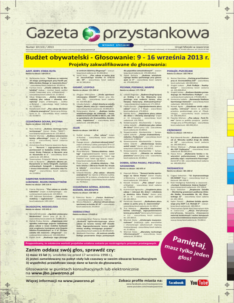 Gazeta przystankowa Urząd Miejski w Jaworznie Numer 10 (13) / 2013 Biuro Promocji i Informacji, ul. Grunwaldzka 33, 43-600 Jaworzno, tel. (32) 61 81 585 Materiały informacyjne pochodzą z miejskiego serwisu informacyjnego www.jaworzno.pl Budżet obywatelski - Głosowanie: 9 - 16 września 2013 r. Projekty zakwalifikowane do głosowania: AZOT, BORY, STARA HUTA Kwota na obszar: 149 255 zł 1) Bańkowska Anna - "Budowa co najmniej 10 miejsc parkingowych przy Parafii pw. Miło-sierdzia Bożego w Jaworznie-Bory" - szacunkowy koszt zadania ok. 30.000 zł; 2) Furman Anna - „Chwila oddechu na Bielańskiej” (zakup i montaż ławek wzdłuż ścieżki rowerowej przy ul.Bielańskiej) szacunkowy koszt zadania ok. 21.000 zł; 3) Gibas Małgorzata - „Dolina młodości rodzinny plac zabaw z siłownią zewnętrzną” (rejon ul.Tetmajera - wzdłuż ul.Bielany) - szacunkowy koszt zadania ok. 73.800 zł; 4) Kwiatkowski Józef - „Plac zabaw dla dzieci i siłownia zewnętrzna” (teren przy Gimnazjum nr 2) - szacunkowy koszt zadania ok. 55.000 zł. CEZARÓWKA DOLNA, BYCZYNA Kwota na obszar: 142 420 zł 1) Bury Andrzej - „Budowa ziemnego kortu tenisowego” (teren Klubu "NIKO") szacunkowy koszt zadania ok. 123.000 zł; 2) Maźnio Mariusz - „Budowa (utworzenie) boiska piłkarskiego” (rejon ul. Ćwiklińskiej) - szacunkowy koszt zadania ok. 61.500 zł; 3) Ochotnicza Straż Pożarna Jaworzno-Byczyna - "Remont i zagospodaro-wanie pomieszczeń w budynku remizy Ochotniczej Straży Pożarnej w Byczynie przy ul. Kaczeńców nr 1" - szacunkowy koszt zadania ok. 135.300 zł; 4) Towarzystwo Przyjaciół Miasta Jaworzna Koło w Byczynie - „Wydanie albumu pn. Byczynianie w starej fotografii, wystawa archiwalnych fotografii i dokumentów i strona internetowa - wirtualna Izba Pamięci” - szacunkowy koszt zadania ok. 53.000 zł. DĄBROWA NARODOWA, ŁUBOWIEC, REJON ENERGETYKÓW w centrum dzielnicy Długoszyn” - szacunkowy koszt zadania ok. 50.000,00 zł; 4) Saran Anna - „Plac zabaw w parku przy ul. Jaszuńskiego działka nr 579/16 obr. 54” - szacunkowy koszt zadania ok. 61.500,00 zł. GIGANT, LEOPOLD DŁUGOSZYN, NIEDZIELISKA Kwota na obszar: 171 730 zł 1) Lutecki Zbigniew - „Budowa drogi łączącej ul. Krótką i ul. Św. Wojciecha oraz parkingu oraz nadanie nazwy: ulica Świętej Katarzyny Aleksandryjskiej” - szacunkowy koszt zadania ok. 171.000 zł; 2) Piętka Dorota - „Zagospodarowanie placu zabaw” (rejon ul. 3 Maja) - szacunkowy koszt zadania ok. 170.000 zł; 3) Samiec Anna - „Stworzenie placu zabaw dla dzieci z siłownią zewnętrzną” (rejon ul. 11 Listopada) - szacunkowy koszt zadania ok. 110.700 zł; 4) Stowarzyszenie Absolwentów i Sympatyków Jedynki - „Dzielnicowy plac zabaw dla dzieci” (teren przy I LO) - szacunkowy koszt zadania ok. 50.000 zł; 5) Stowarzyszenie Absolwentów i Sympatyków Jedynki - „Festyn środowiskowy Jedynka z Podwalem" - szacunkowy koszt zadania ok. 6.000 zł; 6) Stowarzyszenie Absolwentów i Sympatyków Jedynki - „Modernizacja terenu wokół szkoły” (teren przy I LO) - szacunkowy koszt zadania ok. 100.000 zł; 7) Stowarzyszenie Absolwentów i Sympatyków Jedynki - „Siłownia na wolnym powietrzu” (teren przy I LO) - szacunkowy koszt zadania ok. 20.000 zł. JELEŃ Kwota na obszar: 144 955 zł 1) Dubiel Łukasz - „Plac zabaw” (rejon ul.Kosów) - szacunkowy koszt zadania ok. 73.800 zł; 2) Papuga Janusz - „Centrum rekreacji Jeleń” (rejon ul.Wiosny Ludów, pomiędzy SP nr 22 a DK w Jeleniu) - szacunkowy koszt zadania ok. 143.900 zł; 3) Pluta Martyna - "Zielona dzielnica - JeleńŁęg" (zagospodarowanie terenu wokół przystanków autobusowych "Jeleń Łęg Pawilon" oraz "Jeleń Łęg Pętla") - szacunkowy koszt zadania ok. 30.000 zł; 4) Pluta Lucyna - „Urodziny dzielnicy - 750lecie Jelenia i 100-lecie Parafii Św. Krzyża w Jeleniu” - szacunkowy koszt zadania ok. 40.000 zł; 5) Urbanik Monika - „Plac zabaw - siłownia zewnętrzna” (w rejonie ul.Wiosny Ludów, pomiędzy DK w Jeleniu a budynkiem byłej Hali Sportowej) - szacunkowy koszt zadania ok. 79.950 zł. CEZARÓWKA GÓRNA, JEZIORKI, KOŹMIN, WILKOSZYN Kwota na obszar: 130 385 zł 1) Paleczna Beata – „Festyn Rodzinny” - szacunkowy koszt zadania ok. 7.000 zł; 2) Wrona Nikodem – „Montaż infrastruktury sportowej na boisku SP 19” – szacunkowy koszt zadania ok. 24.600 zł. Kwota na obszar: 135 635 zł OSIEDLE STAŁE 1) Michalik Mirosław - „Ogródek edukacyjny Niedzieliska” (teren przy SP Nr 3) szacunkowy koszt zadania ok. 73.800,00 zł; 2) Opitek-Proksa Dorota - „Organizacja mini ogródka rodzinnego poprzez rozbudowę placu zabaw o nowe mobilne huśtawki oraz urządzenia treningowe przy Zespole Szkolno-Przedszkolnym nr 2 ul. Chropaczówka 101 Jaworzno - Długoszyn” - szacunkowy koszt zadania ok. 100.000,00 zł; 3) Piątek Jacek - „Realizacja ciągu pieszego PECHNIK, PODWALE, WARPIE Kwota na obszar: 151 020 zł 1) Długosz Mieczysław - „Strefa sportoworekreacyjna GIGANT” (teren przy blokach TBS) - szacunkowy koszt zadania ok. 150.000,00 zł; 2) Litewka Sylwia – „Dzień dziecka w osiedlu Gigant „Mama, tata i ja – razem weselej” szacunkowy koszt zadania ok. 10.000,00 zł; 3) Stolarzewicz Marian – „Budowa boiska wielofunkcyjnego do siatkówki – koszykówki na terenie działki nr 68/17, obr. 144 w sąsiedztwie ulic Grunwaldzka, Szczakowska, Cegielniana” – szacunkowy koszt zadania ok. 120.000,00 zł. Kwota na obszar: 149 110 zł 1) Czarny Marzena - "Plac zabaw w osiedlu Łubowiec" (rejon ul.Zubrzyckiego) - szacunkowy koszt zadania ok. 123.000 zł; 2) OSP Dąbrowa Narodowa - „Zakup sceny mobilnej i nagłośnienia” - szacunkowy koszt zadania ok. 149.110 zł. dla pojazdów samochodowych” - szacunkowy koszt zadania ok. 170.000,00 zł; 3) Ziętek Barbara - „Budowa wielofunkcyjnego boiska sportowego przy gimnazjum nr 5” - szacunkowy koszt zadania ok. 170.000,00 zł. Kwota na obszar: 174 425 zł 1) Ochotnicza Straż Pożarna Os