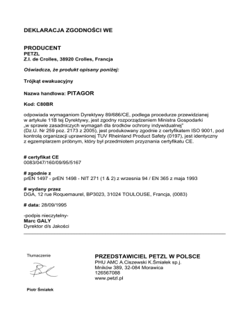 DEKLARACJA ZGODNOŚCI WE PRODUCENT PETZL Z.I. de Crolles, 38920 Crolles, Francja Oświadcza, że produkt opisany poniżej: Trójkąt ewakuacyjny Nazwa handlowa: PITAGOR Kod: C80BR odpowiada wymaganiom Dyrektywy 89/686/CE, podlega procedurze przewidzianej w artykule 11B tej Dyrektywy, jest zgodny rozporządzeniem Ministra Gospodarki „w sprawie zasadniczych wymagań dla środków ochrony indywidualnej” (Dz.U. Nr 259 poz. 2173 z 2005), jest produkowany zgodnie z certyfikatem ISO 9001, pod kontrolą organizacji uprawnionej TUV Rheinland Product Safety (0197), jest identyczny z egzemplarzem próbnym, który był przedmiotem przyznania certyfikatu CE. # certyfikat CE 0083/047/160/09/95/5167 # zgodnie z prEN 1497 - prEN 1498 - NIT 271 (1 & 2) z wrzesnia 94 / EN 365 z maja 1993 # wydany przez DGA, 12 rue Roquemaurel, BP3023, 31024 TOULOUSE, Francja, (0083) # data: 28/09/1995 -podpis nieczytelnyMarc GALY Dyrektor d/s Jakości ________________________________________________________________________ Tłumaczenie PRZEDSTAWICIEL PETZL W POLSCE PHU AMC A.Ciszewski K.Śmiałek sp.j. Mników 389, 32-084 Morawica 126567088 www.petzl.pl Piotr Śmiałek