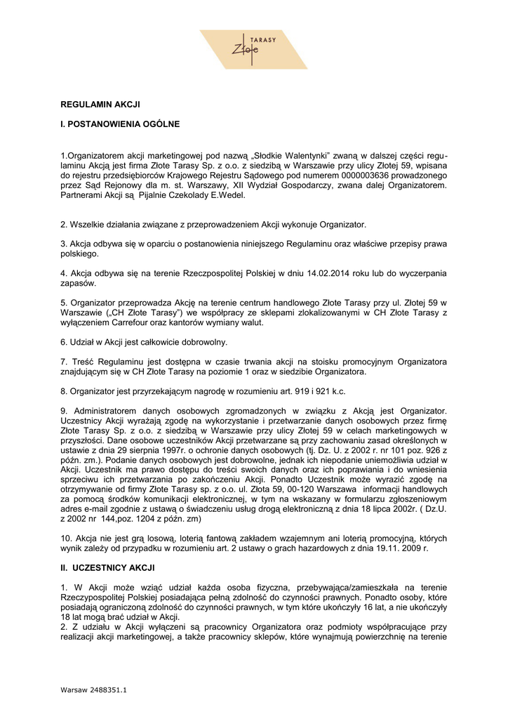 REGULAMIN AKCJI I. POSTANOWIENIA OGÓLNE 1.Organizatorem akcji marketingowej pod nazwą „Słodkie Walentynki” zwaną w dalszej części regulaminu Akcją jest firma Złote Tarasy Sp. z o.o. z siedzibą w Warszawie przy ulicy Złotej 59, wpisana do rejestru przedsiębiorców Krajowego Rejestru Sądowego pod numerem 0000003636 prowadzonego przez Sąd Rejonowy dla m. st. Warszawy, XII Wydział Gospodarczy, zwana dalej Organizatorem. Partnerami Akcji są Pijalnie Czekolady E.Wedel. 2. Wszelkie działania związane z przeprowadzeniem Akcji wykonuje Organizator. 3. Akcja odbywa się w oparciu o postanowienia niniejszego Regulaminu oraz właściwe przepisy prawa polskiego. 4. Akcja odbywa się na terenie Rzeczpospolitej Polskiej w dniu 14.02.2014 roku lub do wyczerpania zapasów. 5. Organizator przeprowadza Akcję na terenie centrum handlowego Złote Tarasy przy ul. Złotej 59 w Warszawie („CH Złote Tarasy”) we współpracy ze sklepami zlokalizowanymi w CH Złote Tarasy z wyłączeniem Carrefour oraz kantorów wymiany walut. 6. Udział w Akcji jest całkowicie dobrowolny. 7. Treść Regulaminu jest dostępna w czasie trwania akcji na stoisku promocyjnym Organizatora znajdującym się w CH Złote Tarasy na poziomie 1 oraz w siedzibie Organizatora. 8. Organizator jest przyrzekającym nagrodę w rozumieniu art. 919 i 921 k.c. 9. Administratorem danych osobowych zgromadzonych w związku z Akcją jest Organizator. Uczestnicy Akcji wyrażają zgodę na wykorzystanie i przetwarzanie danych osobowych przez firmę Złote Tarasy Sp. z o.o. z siedzibą w Warszawie przy ulicy Złotej 59 w celach marketingowych w przyszłości. Dane osobowe uczestników Akcji przetwarzane są przy zachowaniu zasad określonych w ustawie z dnia 29 sierpnia 1997r. o ochronie danych osobowych (tj. Dz. U. z 2002 r. nr 101 poz. 926 z późn. zm.). Podanie danych osobowych jest dobrowolne, jednak ich niepodanie uniemożliwia udział w Akcji. Uczestnik ma prawo dostępu do treści swoich danych oraz ich poprawiania i do wniesienia sprzeciwu ich przetwarzania po zakończeniu Akcji. Ponadto Uczestnik może wyrazić zgodę na otrzymywanie od firmy Złote Tarasy sp. z o.o. ul. Złota 59, 00-120 Warszawa informacji handlowych za pomocą środków komunikacji elektronicznej, w tym na wskazany w formularzu zgłoszeniowym adres e-mail zgodnie z ustawą o świadczeniu usług drogą elektroniczną z dnia 18 lipca 2002r. ( Dz.U. z 2002 nr 144,poz. 1204 z późn. zm) 10. Akcja nie jest grą losową, loterią fantową zakładem wzajemnym ani loterią promocyjną, których wynik zależy od przypadku w rozumieniu art. 2 ustawy o grach hazardowych z dnia 19.11. 2009 r. II. UCZESTNICY AKCJI 1. W Akcji może wziąć udział każda osoba fizyczna, przebywająca/zamieszkała na terenie Rzeczypospolitej Polskiej posiadająca pełną zdolność do czynności prawnych. Ponadto osoby, które posiadają ograniczoną zdolność do czynności prawnych, w tym które ukończyły 16 lat, a nie ukończyły 18 lat mogą brać udział w Akcji. 2. Z udziału w Akcji wyłączeni są pracownicy Organizatora oraz podmioty współpracujące przy realizacji akcji marketingowej, a także pracownicy sklepów, które wynajmują powierzchnię na terenie Warsaw 2488351.1 Centrum Handlowego Złote Tarasy i pracownicy ochrony oraz ich małżonkowie, powinowaci w linii prostej pierwszego stopnia. 3. Prawo udziału w Akcji przysługuje wyłącznie osobom spełniającym warunki określone Regulaminem. 4. Osoby fizyczne, które spełnią wskazane w Regulaminie warunki uczestnictwa w Akcji zwane będą w dalszej części Regulaminu "Uczestnikami". III. ZASADY UCZESTNICTWA W AKCJI I PRZYZNAWANIA KUPONÓW PROMOCYJNYCH. 1. Aby wziąć udział w Akcji należy spełnić łącznie wszystkie poniższe warunki: a) zakupić dowolny towar w sklepach zlokalizowanych na terenie CH Złote Tarasy na kwotę minimum 150 zł brutto w dniu 14.02.2014 z wyłączeniem zakupów dokonanych w Carrefour i oraz transakcji dokonanych w kantorach walut; b) zachować dowód zakupu w postaci paragonu; c) zgłosić się z oryginalnym dowodem zakupu do stoiska promocyjnego w CH Złote Tarasy zlokalizowanego na poziomie 0 w godzinach od 12:00 do 19:00 w celu potwierdzenia jego oryginalności poprzez otrzymanie z tyłu paragonu pieczątki Organizatora; d) zgodnie z klauzulą zawartą w formularzu zgłoszeniowym można wypełnić i można wyrazić zgodę na przetwarzanie swoich danych osobowych przez Organizatora oraz/lub otrzymanie informacji handlowych drogą elektroniczną oraz potwierdzić odbiór kuponu; 2. Uczestnicy Akcji, mogą się ubiegać o produkty promocyjne do wyczerpania ich zapasów. 3. W Akcji będzie przyznana następująca pula produktów promocyjnych: a. 700 osób, które w sposób prawidłowy dokonają zakupu za kwotę min 150 zł brutto i przedstawią do weryfikacji jego dowód na stoisku promocyjnym Organizatora oraz spełnią pozostałe warunki Regulaminu otrzymają słodki upominek w formie torciku waflowoczekoladowego wyprodukowanego przez firmę E. Wedel wraz z indywidualną dedykacją, wskazaną przez uczestnika Akcji. b. Uczestnik Akcji, po spełnieniu warunków określonych w niniejszym regulaminie będzie upoważniony do odbioru jednego z produktów promocyjnych wskazanych w punkcie a powyżej. 4. Produkt promocyjny otrzymany w Akcji należy odebrać osobiście na stoisku promocyjnym w CH Złote Tarasy znajdującym się na poziomie 0 w dniu 14.02.2014 roku w godzinach od 12:00 do 19:00 lub do wyczerpania się puli produktów promocyjnych po przedstawieniu oryginalnego dowodu zakupu w postaci paragonu i spełnienia pozostałych warunków Akcji. 5. Uczestnikom Akcji nie przysługuje prawo zamiany produktu na inną rzecz ani ekwiwalent pieniężny. Wybór konkretnego rodzaju produktu promocyjnego zależy od Uczestnika. Prawo do produktu promocyjnego nie może zostać przeniesione na inną osobę. 6. Ilość produktów promocyjnych biorących udział w Akcji jest ograniczona i p