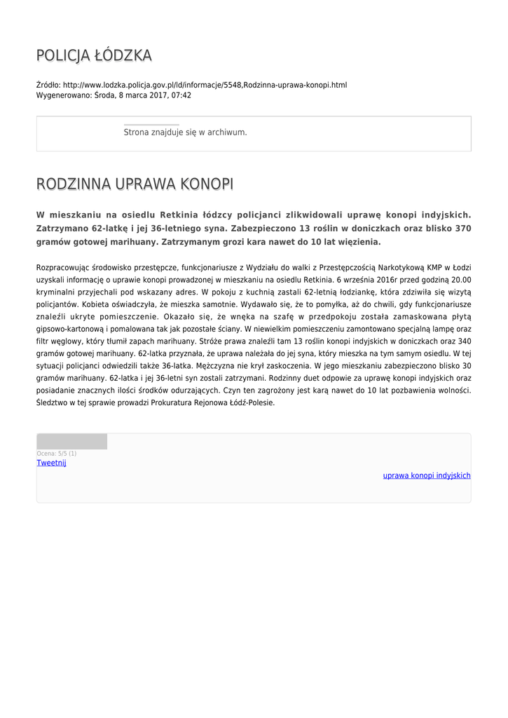 POLICJA ŁÓDZKA Źródło: http://www.lodzka.policja.gov.pl/ld/informacje/5548,Rodzinna-uprawa-konopi.html Wygenerowano: Środa, 8 marca 2017, 07:42 Strona znajduje się w archiwum. RODZINNA UPRAWA KONOPI W mieszkaniu na osiedlu Retkinia łódzcy policjanci zlikwidowali uprawę konopi indyjskich. Zatrzymano 62-latkę i jej 36-letniego syna. Zabezpieczono 13 roślin w doniczkach oraz blisko 370 gramów gotowej marihuany. Zatrzymanym grozi kara nawet do 10 lat więzienia. Rozpracowując środowisko przestępcze, funkcjonariusze z Wydziału do walki z Przestępczością Narkotykową KMP w Łodzi uzyskali informację o uprawie konopi prowadzonej w mieszkaniu na osiedlu Retkinia. 6 września 2016r przed godziną 20.00 kryminalni przyjechali pod wskazany adres. W pokoju z kuchnią zastali 62-letnią łodziankę, która zdziwiła się wizytą policjantów. Kobieta oświadczyła, że mieszka samotnie. Wydawało się, że to pomyłka, aż do chwili, gdy funkcjonariusze znaleźli ukryte pomieszczenie. Okazało się, że wnęka na szafę w przedpokoju została zamaskowana płytą gipsowo-kartonową i pomalowana tak jak pozostałe ściany. W niewielkim pomieszczeniu zamontowano specjalną lampę oraz filtr węglowy, który tłumił zapach marihuany. Stróże prawa znaleźli tam 13 roślin konopi indyjskich w doniczkach oraz 340 gramów gotowej marihuany. 62-latka przyznała, że uprawa należała do jej syna, który mieszka na tym samym osiedlu. W tej sytuacji policjanci odwiedzili także 36-latka. Mężczyzna nie krył zaskoczenia. W jego mieszkaniu zabezpieczono blisko 30 gramów marihuany. 62-latka i jej 36-letni syn zostali zatrzymani. Rodzinny duet odpowie za uprawę konopi indyjskich oraz posiadanie znacznych ilości środków odurzających. Czyn ten zagrożony jest karą nawet do 10 lat pozbawienia wolności. Śledztwo w tej sprawie prowadzi Prokuratura Rejonowa Łódź-Polesie. Ocena: 5/5 (1) Tweetnij uprawa konopi indyjskich