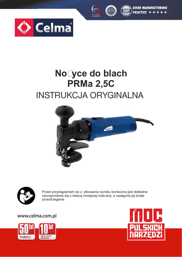 Nożyce do blach PRMa 2,5C INSTRUKCJA ORYGINALNA Przed przystąpieniem do użytkowania wyrobu konieczne jest dokładne zaznajomienie się z treścią niniejszej instrukcji, a następnie jej ścisłe przestrzeganie Polska firma Zakłady ElektromaszynoweElektronarzędzia Celma S. A. już od 50 lat produkuje i oferuje szeroki asortyment Prąd znamionowy Znam. częstotliwość cięć Maks. grubość cięcia blachy 2,7 A 1700 1/min elektronarzędzi profesjonalnych, przeznaczonych dla zakładów przemysłowych oraz warsztatów stalowej (Rm=390MPa) Klasa ochronności 2,5 mm II rzemieślniczych. (urządzenie nie wymaga uziemienia) WSTĘP Prawidłowa, niezawodna i bezpieczna praca nożycami PRMa 2,5C jest uzależniona głównie Wymiary gabarytowe (dłx wys x szer) Masa od prawidłowej eksploatacji. Dlatego w interesie użytkownika jest dokładne zapoznanie się z treścią niniejszej instrukcji i przestrzeganie wszystkich uwag i zaleceń w niej zawartych. Za Nożyce do blach PRMa 2,5C spełniają wymagania Dyrektyw UE PRODUCENT ZASTRZEGA SOBIE PRAWO szkody powstałe na skutek nieprzestrzegania zaleceń niniejszej instrukcji producent i serwis nie przyjmują odpowiedzialności. DOKONYWANIA ZMIAN KONSTRUKCYJNYCH WARUNKI BEZPIECZNEJ PRACY Informacje na które pragniemy zwrócić szczególną uwagę Państwa, zostały napisane wytłuszczoną czcionką i są poprzedzone znakiem „-”. 335x196x75mm 2,9 kg OSTRZEŻENIE Należy przeczytać wszystkie ostrzeżenia dotyczące bezpieczeństwa użytkowania oznaczone symbolem i wszystkie wskazówki dotyczące bezpieczeństwa użytkowania. CHARAKTERYSTYKA NOŻYC I WYPOSAŻENIA Nożyce do blach PRMa 2,5C służą do cięcia Wskazówki dotyczące bezpieczeństwa pracy i obcinania, po linii prostej i krzywej, blach stalowych i z metali kolorowych. Oprócz nożyc do blach PRMa 2,5C opakowanie nożycami Podczas pracy elektronarzędzie należy trzymać mocno w obydwu rękach. Utrata kontroli nad zawiera: — dodatkowy nóż suwaka — dodatkowy nóż kabłąka narzędziem może spowodować osobiste obrażenia. Należy zabezpieczyć obrabiany przedmiot. — szablon — klucz RWTg 5 — przetyczkę-pokrętło Zamocowanie obrabianego przedmiotu w urządzeniu mocującym lub imadle jest bezpieczniejsze niż trzymanie go w ręku. Nożyce wyposażone są w osłonę z blachy Przed stalowej, która zabezpiecza dłoń trzymającą korpus narzędzia, przed skaleczeniem obcinanym paskiem blachy. poczekać, aż znajdzie się ono w bezruchu. Narzędzie robocze może się zablokować i doprowadzić do utraty kontroli nad elektro- * Załącznikiem do niniejszej Instrukcji Obsługi jest Karta Gwarancyjna. narzędziem. Nie wolno używać elektronarzędzia z uszkodzonym przewodem. Nie należy dotykać PARAMETRY TECHNICZNE NOŻYC PRMa 2,5C Napięcie, częstotliwość 230 V, 50 Hz Moc znamionowa 600 W uszkodzonego przewodu; w przypadku uszkodzenia przewodu podczas pracy, należy wyciągnąć wtyczkę z gniazda. Uszkodzone przewody podwyższają ryzyko porażenia prądem. odłożeniem elektronarzędzia, należy Ogólne ostrzeżenia dotyczące bezpieczeństwa użytkowania narzędzia OSTRZEŻENIE! Należy przeczytać c) Nie należy narażać elektronarzędzi na działanie deszczu lub warunków wilgotnych. W przypadku przedostania się do elektronarzędzia wszystkie ostrzeżenia i wskazówki dotyczące bezpieczeństwa. Nieprzestrzeganie podanych niżej ostrzeżeń dotyczących bezpieczeństwa i wskazówek doty- wody, wzrasta ryzyko porażenia prądem elektrycznym. d) Nie należy nadwerężać przewodów przyłączeniowych. Nigdy nie należy używać czących bezpieczeństwa może być przyczyną porażenia prądem elektrycznym, pożaru i/lub poważnych obrażeń. przewodu przyłączeniowego do przenoszenia, ciągnięcia elektronarzędzia lub wyciągania wtyczki z gniazdka. Należy trzymać przewód Zachowaj wszystkie ostrzeżenia w s kazó w k i dot yc zą c e b e zpi e czeństwa, aby mó c skorzystać przyłączeniowy z daleka od źródeł ciepła, olejów, ostrych krawędzi lub ruchomych części. Uszkodzone lub zaplątane przewody z nich w przyszłości. 1. Bezpieczeństwo w miejscu pracy przyłączeniowe zwiększają ryzyko porażenia prądem elektrycznym. e) W przypadku, gdy elektronarzędzie używa się a) W miejscu pracy należy utrzymywać porządek i dobre oświetlenie. Nieporządek i złe oświetlenie przyczynia się do wypadków. na wolnym powietrzu, przewody przyłączeniowe należy przedłużać przedłużaczami przeznaczonymi do pracy na wolnym powietrzu. b) Nie należy używać elektronarzędzia w środowiskach wybuchowych, tworzonych przez łatwopalne ciecze, gazy lub pyły. Elektronarzędzie wytwarza iskry, które mogą Używanie przedłużacza przeznaczonego do pracy na wolnym powietrzu zmniejsza ryzyko porażenia prądem elektrycznym. f) W przypadku, gdy używanie elektronarzędzia zapalić pyłlub opary. c) Nie należy dopuszczać dzieci i obserwatorów w środowisku wilgotnym jest nieuniknione, jako ochronę przed napięciem zasilania należy do miejsc, w których używa się elektronarzędzi. stosować urządzenie różnicowoprądowe (RCD). Rozproszenie uwagi może spowodować utratę kontroli nad elektronarzędziem. Zastosowanie RCD zmniejsza ryzyko porażania prądem elektrycznym. UWAGA Termin „urządzenie różnicowo-prądowe 2. Bezpieczeństwo elektryczne a) Wtyczki elektronarzędzi muszą pasować do gniazdek. Nigdy w żaden sposób nie należy (RCD)” można zastąpić terminem „wyłącznik prądu ziemnozwarciowego (GFCI)”lub „wyłącznik prądu upływowego (ELCB)”. przerabiać wtyczki. Nie należy używać żadnych przedłużaczy w przypadku elektronarzędzi mających przewód z żyłą uziemienia ochronnego. Brak przeróbek we wtyczkach i gniazdkach 3. Bezpieczeństwo osobiste a) Należy być przewidującym, obserwować co się robi i zachowywać rozsądek podczas wtyczkowych zmniejsza ryzyko porażenia prądem elektrycznym. b) Należy unikać dotyk
