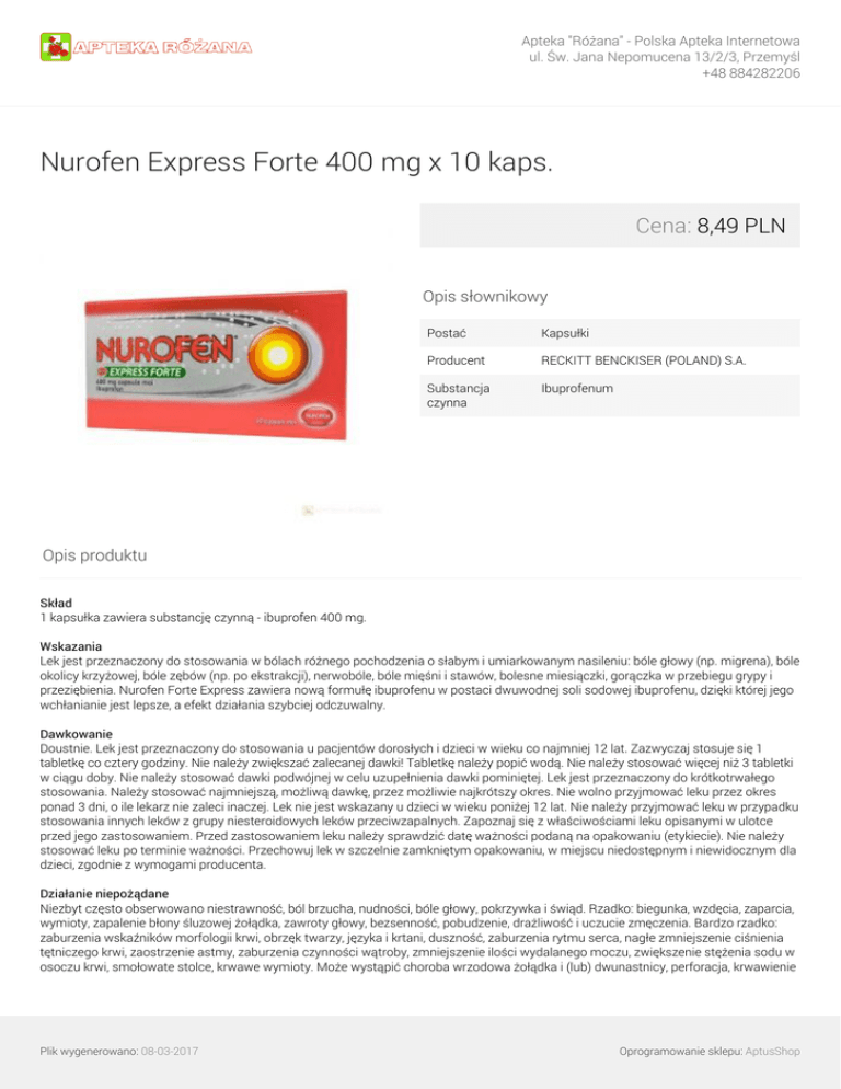 Apteka "Różana" - Polska Apteka Internetowa ul. Św. Jana Nepomucena 13/2/3, Przemyśl +48 884282206 Nurofen Express Forte 400 mg x 10 kaps. Cena: 8,49 PLN Opis słownikowy Postać Kapsułki Producent RECKITT BENCKISER (POLAND) S.A. Substancja czynna Ibuprofenum Opis produktu Skład 1 kapsułka zawiera substancję czynną - ibuprofen 400 mg. Wskazania Lek jest przeznaczony do stosowania w bólach różnego pochodzenia o słabym i umiarkowanym nasileniu: bóle głowy (np. migrena), bóle okolicy krzyżowej, bóle zębów (np. po ekstrakcji), nerwobóle, bóle mięśni i stawów, bolesne miesiączki, gorączka w przebiegu grypy i przeziębienia. Nurofen Forte Express zawiera nową formułę ibuprofenu w postaci dwuwodnej soli sodowej ibuprofenu, dzięki której jego wchłanianie jest lepsze, a efekt działania szybciej odczuwalny. Dawkowanie Doustnie. Lek jest przeznaczony do stosowania u pacjentów dorosłych i dzieci w wieku co najmniej 12 lat. Zazwyczaj stosuje się 1 tabletkę co cztery godziny. Nie należy zwiększać zalecanej dawki! Tabletkę należy popić wodą. Nie należy stosować więcej niż 3 tabletki w ciągu doby. Nie należy stosować dawki podwójnej w celu uzupełnienia dawki pominiętej. Lek jest przeznaczony do krótkotrwałego stosowania. Należy stosować najmniejszą, możliwą dawkę, przez możliwie najkrótszy okres. Nie wolno przyjmować leku przez okres ponad 3 dni, o ile lekarz nie zaleci inaczej. Lek nie jest wskazany u dzieci w wieku poniżej 12 lat. Nie należy przyjmować leku w przypadku stosowania innych leków z grupy niesteroidowych leków przeciwzapalnych. Zapoznaj się z właściwościami leku opisanymi w ulotce przed jego zastosowaniem. Przed zastosowaniem leku należy sprawdzić datę ważności podaną na opakowaniu (etykiecie). Nie należy stosować leku po terminie ważności. Przechowuj lek w szczelnie zamkniętym opakowaniu, w miejscu niedostępnym i niewidocznym dla dzieci, zgodnie z wymogami producenta. Działanie niepożądane Niezbyt często obserwowano niestrawność, ból brzucha, nudności, bóle głowy, pokrzywka i świąd. Rzadko: biegunka, wzdęcia, zaparcia, wymioty, zapalenie błony śluzowej żołądka, zawroty głowy, bezsenność, pobudzenie, drażliwość i uczucie zmęczenia. Bardzo rzadko: zaburzenia wskaźników morfologii krwi, obrzęk twarzy, języka i krtani, duszność, zaburzenia rytmu serca, nagłe zmniejszenie ciśnienia tętniczego krwi, zaostrzenie astmy, zaburzenia czynności wątroby, zmniejszenie ilości wydalanego moczu, zwiększenie stężenia sodu w osoczu krwi, smołowate stolce, krwawe wymioty. Może wystąpić choroba wrzodowa żołądka i (lub) dwunastnicy, perforacja, krwawienie Plik wygenerowano: 08-03-2017 Oprogramowanie sklepu: AptusShop Apteka "Różana" - Polska Apteka Internetowa ul. Św. Jana Nepomucena 13/2/3, Przemyśl +48 884282206 z przewodu pokarmowego. Brak danych dotyczących wpływu leku na zdolność prowadzenia pojazdów mechanicznych, obsługę urządzeń mechanicznych w ruchu i sprawność psychofizyczną podczas stosowania leku w zalecanych dawkach i przez zalecany okres. Poinformuj lekarza Gdy masz nadwrażliwość na ibuprofen lub którąkolwiek substancję pomocniczą leku albo na inne niesteroidowe leki przeciwzapalne (NLPZ). Poinformuj lekarza, gdy po przyjęciu kwasu acetylosalicylowego lub innych niesteroidowych leków przeciwzapalnych występowały u Ciebie kiedykolwiek w przeszłości objawy alergii w postaci kataru, pokrzywki, astmy oskrzelowej. Nurofenu Forte Express nie należy też stosować u osób z chorobą wrzodową żołądka i (lub) dwunastnicy czynną lub przebytą , perforacją, ciężką niewydolnością wątroby, nerek lub serca., ze skazą krwotoczną. Gdy przyjmujesz inne leki przeciwbólowe, kwas acetylosalicylowy (nawet w małej dawce - 75 mg na dobę), leki przeciw nadciśnieniu tętniczemu albo leki moczopędne, leki przeciwzakrzepowe (np. acenokumarol), kortykosteroidy (np. deksametazon), metotreksat (lek przeciwnowotworowy), lit (lek przeciwdepresyjny), zydowudynę (lek przeciwwirusowy), jeśli musisz ograniczać spożycie sodu w diecie. Jeśli jesteś lub przypuszczasz, że jesteś w ciąży, a także gdy karmisz piersią. W ciągu pierwszych 6 miesięcy ciąży nie zaleca się stosowania leku. Podczas ostatnich trzech miesięcy ciąży nie wolno przyjmować leku, ponieważ mogłoby to zwiększać ryzyko wystąpienia powikłań u matki i u dziecka w okresie okołoporodowym. Ibuprofen może w niewielkich ilościach przenikać do mleka karmiących matek. Nie są znane przypadki wystąpienia działań niepożądanych u niemowląt karmionych piersią w przypadku krótkotrwałego stosowania ibuprofenu w małych dawkach. „Przed użyciem zapoznaj się z treścią ulotki dołączonej do opakowania bądź skonsultuj się z lekarzem lub farmaceutą, gdyż każdy lek niewłaściwie stosowany zagraża Twojemu życiu lub zdrowiu” Plik wygenerowano: 08-03-2017 Powered by TCPDF (www.tcpdf.org) Oprogramowanie sklepu: AptusShop