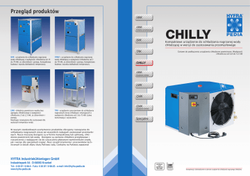 Przegląd produktów Chłodnica przepływowa Kompaktowe urządzenie do schładzania nagrzanej wody chłodzącej w wersji do zastosowania przemysłowego Gotowe do podłączenia urządzenia chłodzone powietrzem. Wydajność chłodnicza od 0,8 do 4,5 kW SVK - urządzenie do schładzania nagrzanej wody chłodzącej o wydajności chłodzenia od 15 do 70 kW, ze zbiornikiem i pompą. Kompaktowa budowa i wysoka dokładność temperatury. VWK/1 - urządzenie do schładzania nagrzanej wody chłodzącej o wydajności chłodzenia od 2 do 70 kW, ze zbiornikiem i pompą. Kompaktowa budowa i wysoka dokładność temperatury. Urządzenie stołowe Urządzenie stołowe LWK - chłodnica powietrzno-wodna bez agregatu chłodniczego o wydajności chłodzenia 2 lub 2,5 kW, ze zbiornikiem i pompą. Niedrogie rozwiązanie dla zastosowań dla wyższych temperatur wody. TRK - urządzenie zanurzeniowe do schładzania nagrzanych cieczy chłodząco-smarujących o wydajności chłodzenia od 2 do 75 kW. Łatwa konserwacja i czyszczenie. Specjalne W naszym standardowym asortymencie produktów oferujemy rozwiązania do schładzania rozgrzanych cieczy we wszystkich rodzajach zastosowań przemysłowych. Nasze maszyny dostępne są w formie kompaktowej lub splitowej, chłodzone powietrzem lub wodą. Dostępne są zarówno chłodnice przepływowe i rozszerzenia z nadającymi się do czyszczenia płytowymi wymiennikami ciepła, jak i wersje dla specjalnych napięć. Nasz zespół inżynierów i pracowników technicznych w dziale zbytu służy Państwu radą. Czekamy na Państwa zapytania! HYFRA Industriekühlanlagen GmbH Industriepark 54 · D-56593 Krunkel Тel.: 0 26 87 / 8 98-0 · Faks: 0 26 87 / 8 98-25 · e-mail: [email protected] www.hyfra-pedia.de Kompetencja i doświadczenie w zakresie urządzeń do schładzania nagrzanego chłodziwa CHILLY Kompaktowe urządzenie do schładzania rozgrzanej wody chłodzącej Wyposażenie seryjne: 쎲 Zewnętrzny wskaźnik poziomu wody 쎲 Parownik płaszczowo-wężownicowy ze stali szlachetnej 쎲 Nowoczesna technologia ekonomicznych i cicho Dane techniczne Wydajność chłodnicza Temperatura Powietrze otaczające pracujących sprężarek i wentylatorów 쎲 Skraplacz z miedzianymi rurkami wewnętrznie 32° C rowkowanymi i aluminiowymi lamelami 쎲 Regulacja temperatury cyfrowym termostatem z histerezą temperatury +/- 1,0 K 37° C 쎲 Ograniczniki wysokiego ciśnienia z certyfikatem TÜV w obiegu chłodniczym 쎲 Klasa ochrony min. IP44 42° C 쎲 Wszystkie standardowe urządzenia dopuszczone do Chilly 08 Chilly 15 Woda Chilly 25 Chilly 35 Chilly 45 Wydajność chłodnicza w kW 10 530 920 2100 2740 3750 15 775 1290 2450 3565 4525 20 1025 1655 2810 4395 5480 10 345 675 1645 2240 3450 15 615 1050 2060 3080 4395 20 890 1425 2475 3920 5340 10 205 450 1390 1740 3045 15 480 765 1810 2580 3870 20 755 1085 2230 3420 4690 temperatury otoczenia maks. 42° C 쎲 Zbiornik buforowy z tworzywa sztucznego 쎲 Opróżnianie zbiornika poprzez wskaźnik stanu wody Specyfikacja 쎲 Termostat cyfrowy 쎲 Przyjazny dla środowiska czynnik chłodniczy R407C 쎲 Bypass dla ochrony pompy 쎲 Brak żelaznych elementów w obiegu wody 쎲 Certyfikat CE / ISO 9001 / EN 60204 쎲 Pompy firmy Speck lub Grundfos Opcje: 쎲 Manometr w zasilaniu 쎲 Wyłącznik pływakowy zabezpieczający przed suchobiegiem 쎲 Komunikat o zakłóceniu zbiorczym 쎲 Bezpotencjałowy komunikat o zakłóceniu 쎲 Przyłącza wody po 2 w zasilaniu i na powrocie 쎲 Napięcia specjalne Chilly 08 Czynnik chłodniczy Chilly 15 Chilly 25 Chilly 35 Chilly 45 Przyjazny dla środowiska czynnik chłodniczy R407C Maks. pobór mocy sprężarki kW 0,56 0,83 1,31 1,64 2,08 Maks. łączna moc pobierana kW 0,71 1,11 1,59 2,52 2,98 A 5,1 5,9 10,0 12,3 13,3 Napięcie przyłączeniowe V/PH/Hz 230/1/50 230/1/50 230/1/50 230/1/50 230/1/50 Maks. przepływ powietrza m3/h 914 1210 1020 2300 2200 l 18 18 18 30 30 Pojemność pompy l/min. 2,3 4,3 7,2 10,0 12,9 Ciśnienie wejściowe pompy bar (g) 2,2 3,6 2,9 2,6 2,3 Maks. zabezpieczenie wstępne Pojemność zbiornika na wodę 쎲 Przepływomierz wskazujący Przyłącza wody zasilanie/powrót cal 3/8 3/8 3/8 3/8 3/8 쎲 Automatyczne uzupełnianie wody 쎲 Zawór obejściowy Poziom ciśnienia akustycznego w odległości 1 m db (A) 62,2 63,6 64,8 71,7 69,8 쎲 Zawór zwrotny i magnetyczny Długość (dł.) mm 705 705 705 755 755 Szerokość (sz. 1/sz. 2) mm 510 510 510 600 600 Wysokość (wys.) mm 450 450 450 500 500 Ciężar netto w stanie nienapełnionym wodą kg 49 55 65 81 90 1) Pomiar w polu swobodnym w odległości 1m Zmiany techniczne zastrzeżone Kompetencja i doświadczenie w zakresie urządzeń do schładzania nagrzanego chłodziwa